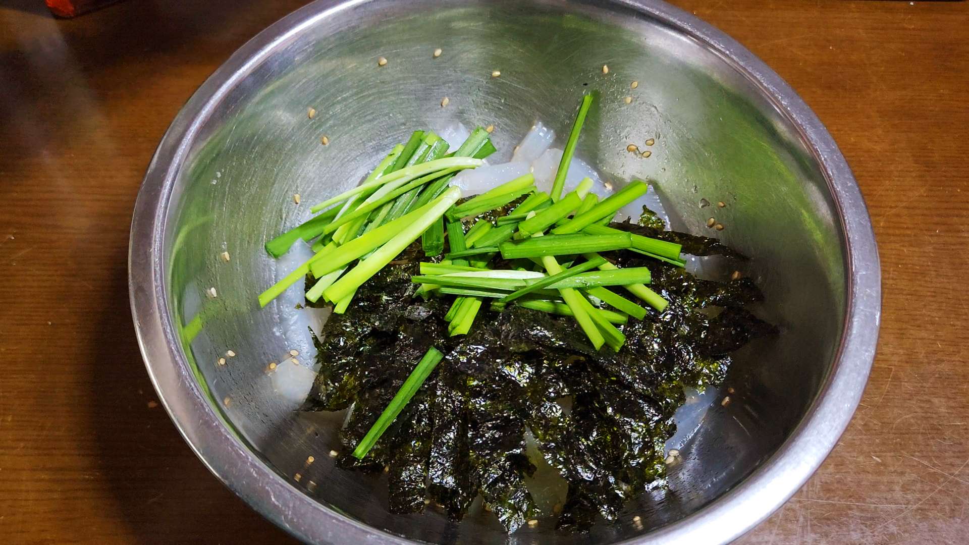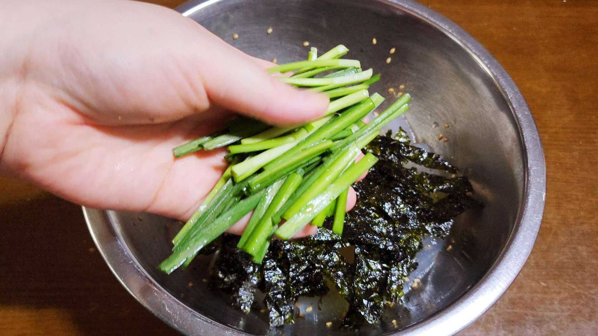 조미김, 부추를 넣고 버무려줍니다.