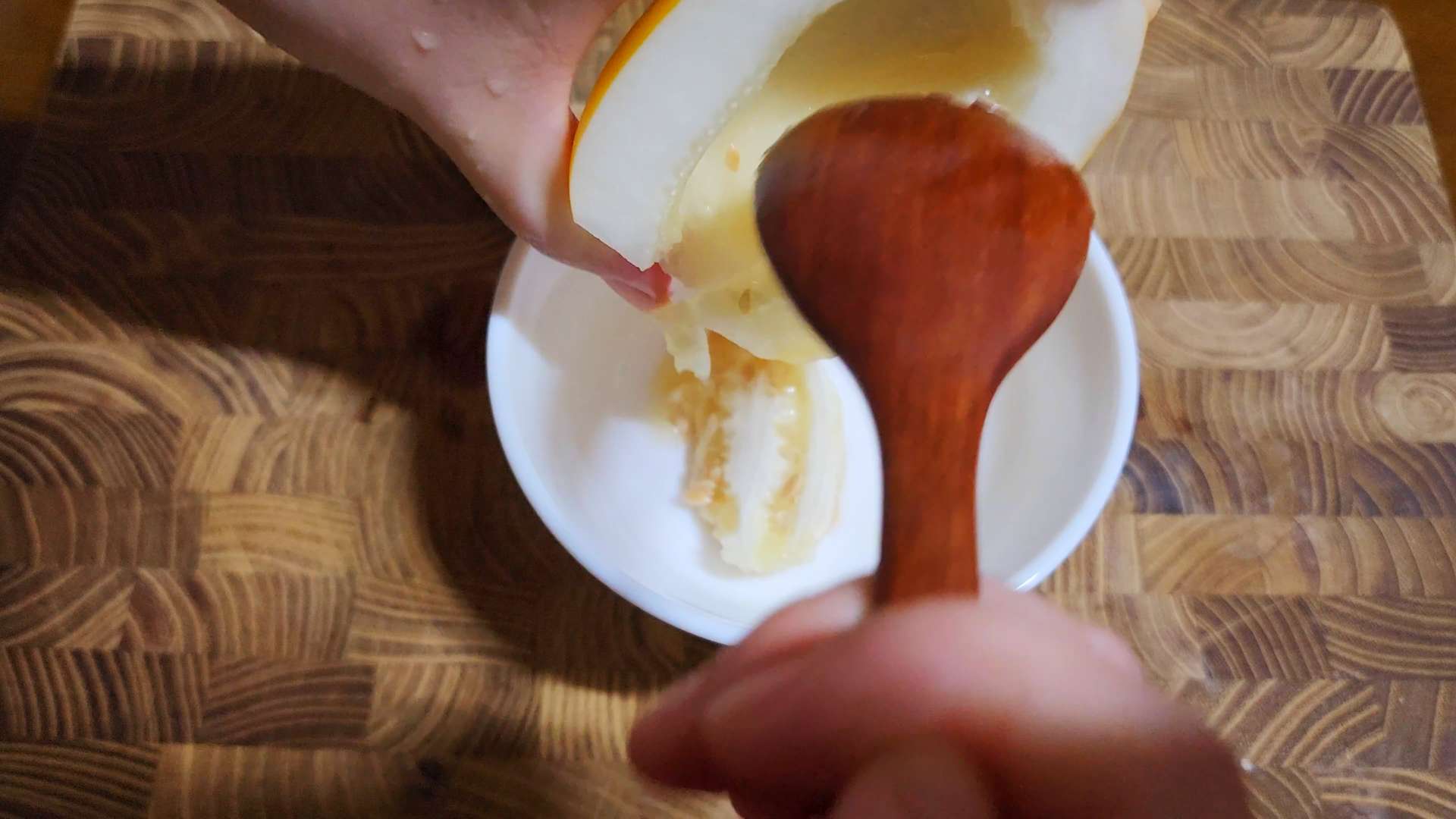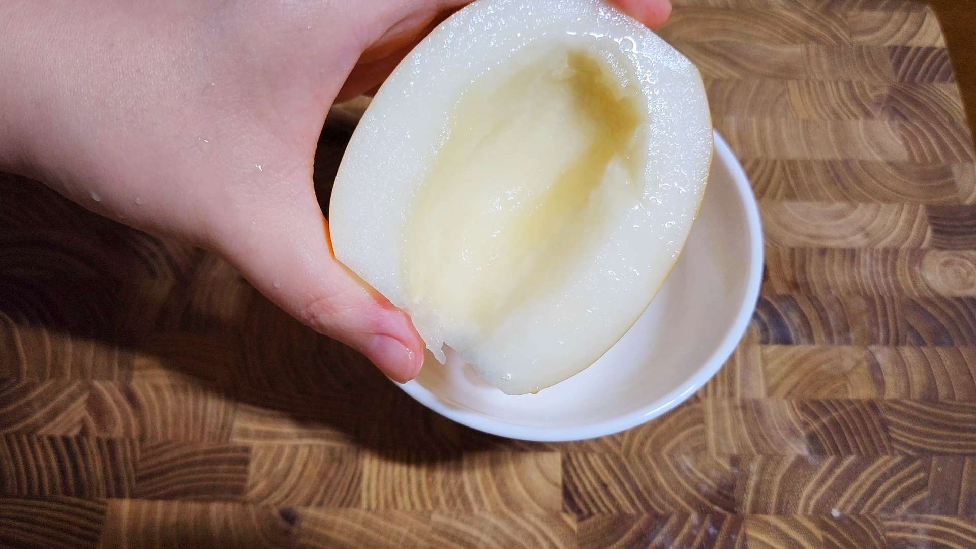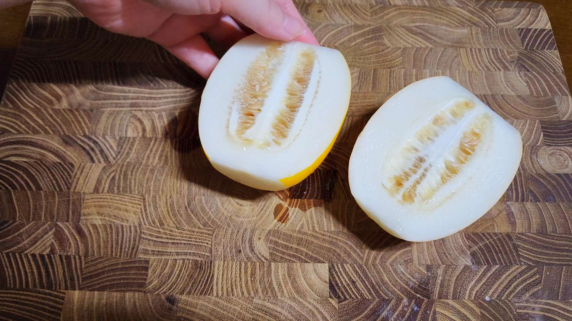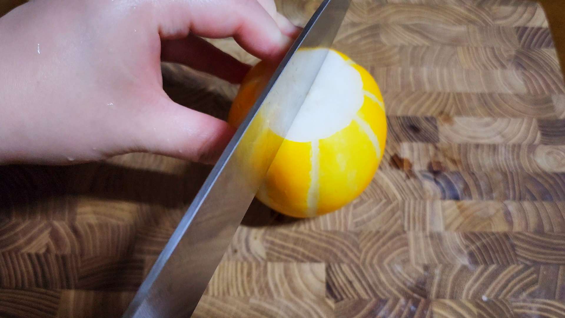 참외는 베이킹파우더 1T 로 문질러 10분간 물에 담그고 깨끗하게 씻고 양끝을 잘라줍니다.