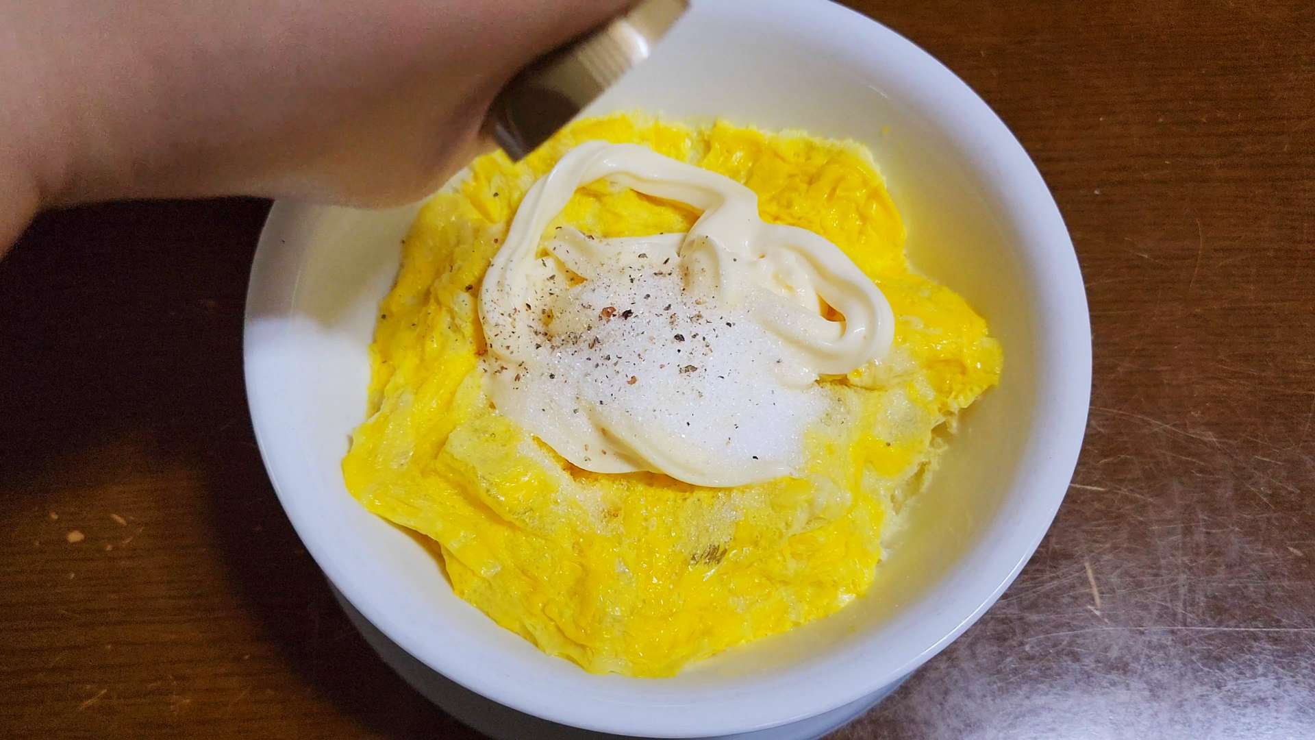달걀, 마요네즈 두 바퀴, 설탕 1T, 후추를 넣고 으깨듯이 섞어줍니다.
