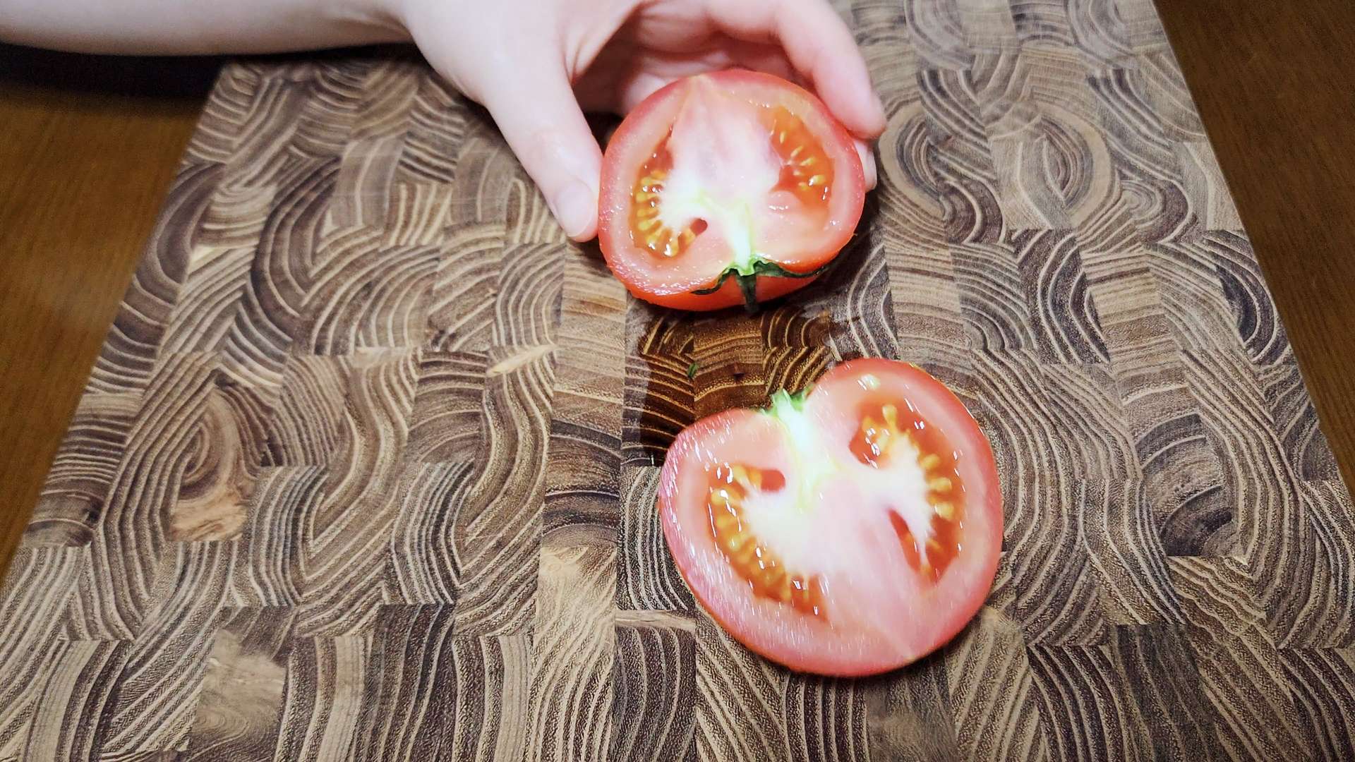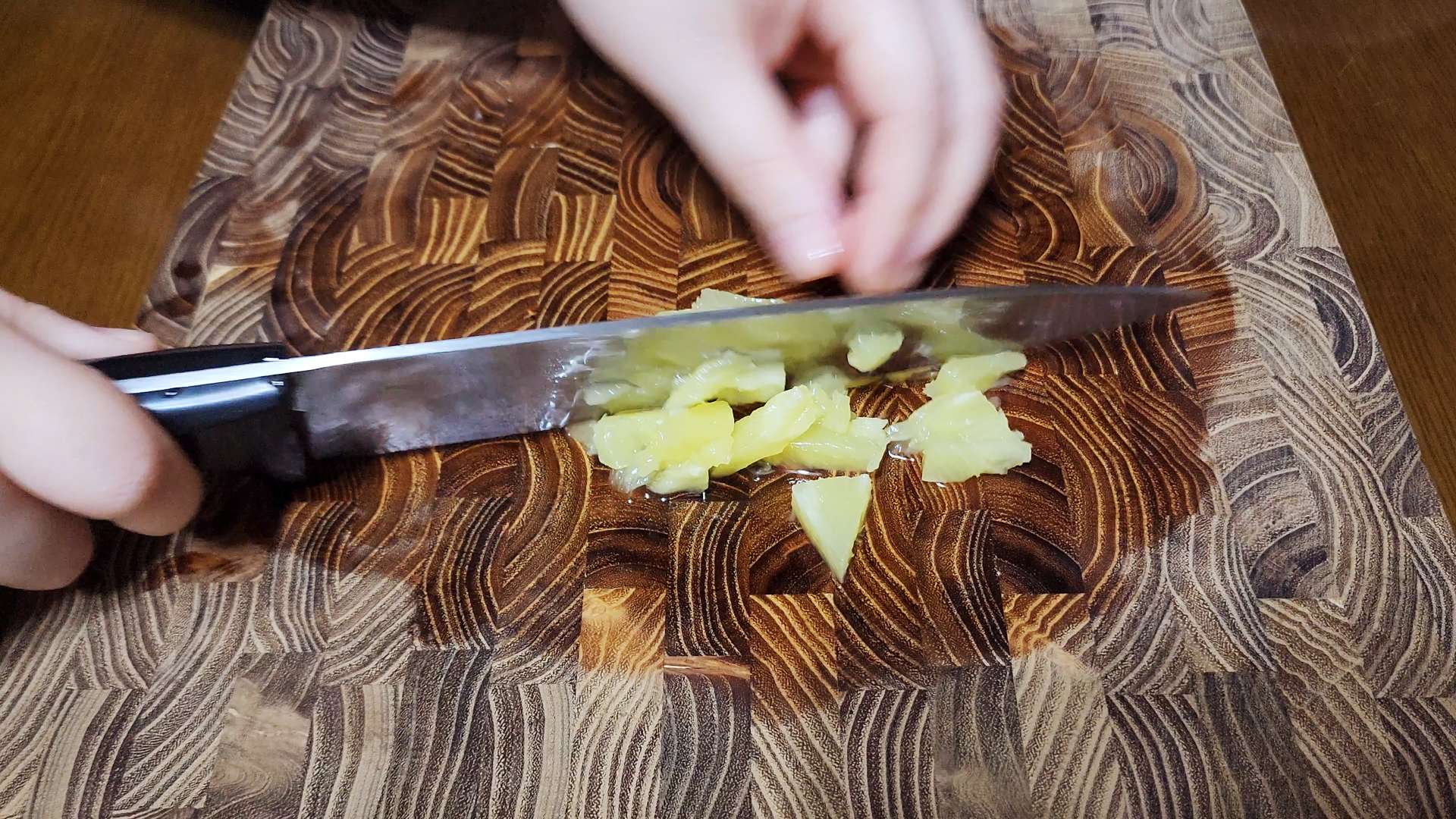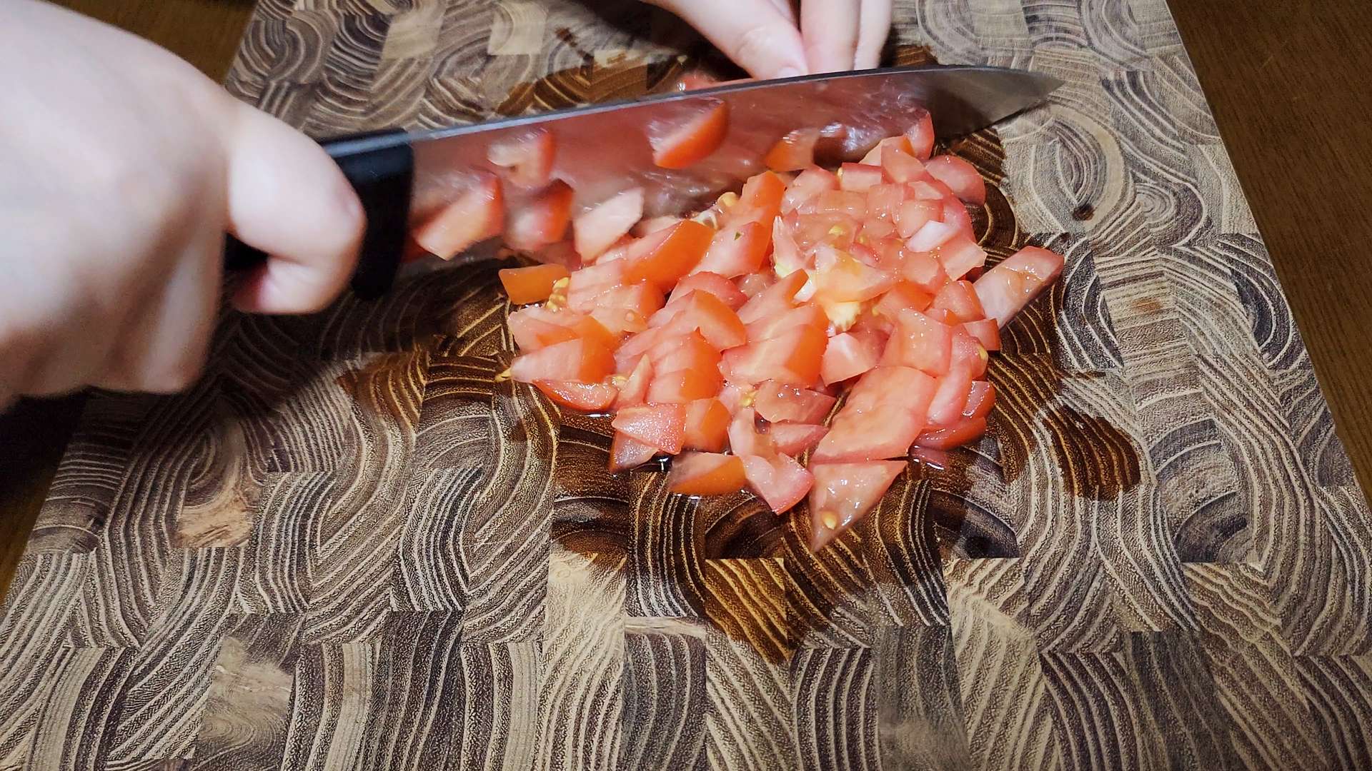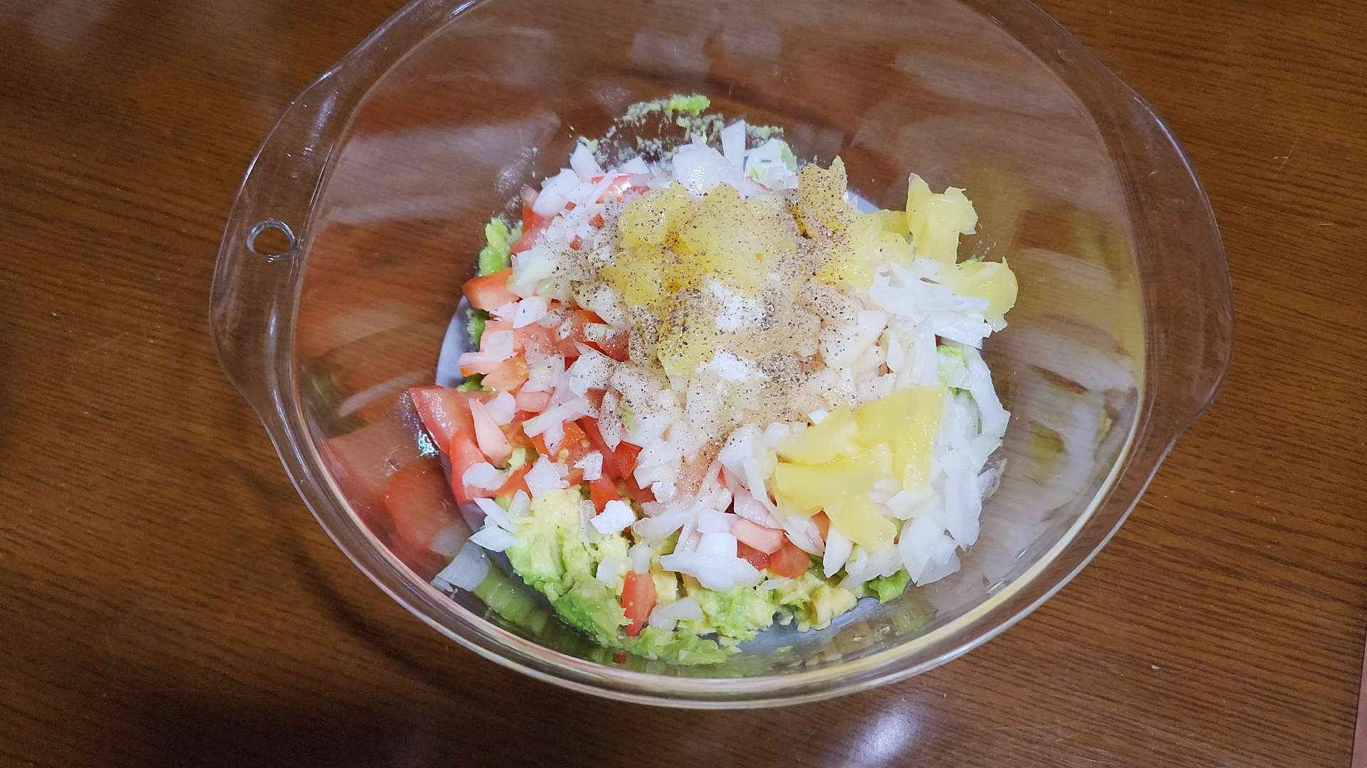 재료: 후숙 아보카도 1개, 완숙 토마토 1개, 양파 1/2개, 파인애플 원형 슬라이스 1조각, 레몬즙 2T,