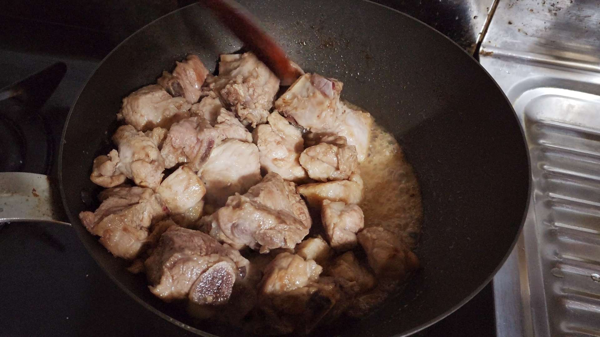 고기는 한쪽으로 몰고 진간장 5T, 참치액 5T를 넣고 바르르 끓여 섞어줍니다.