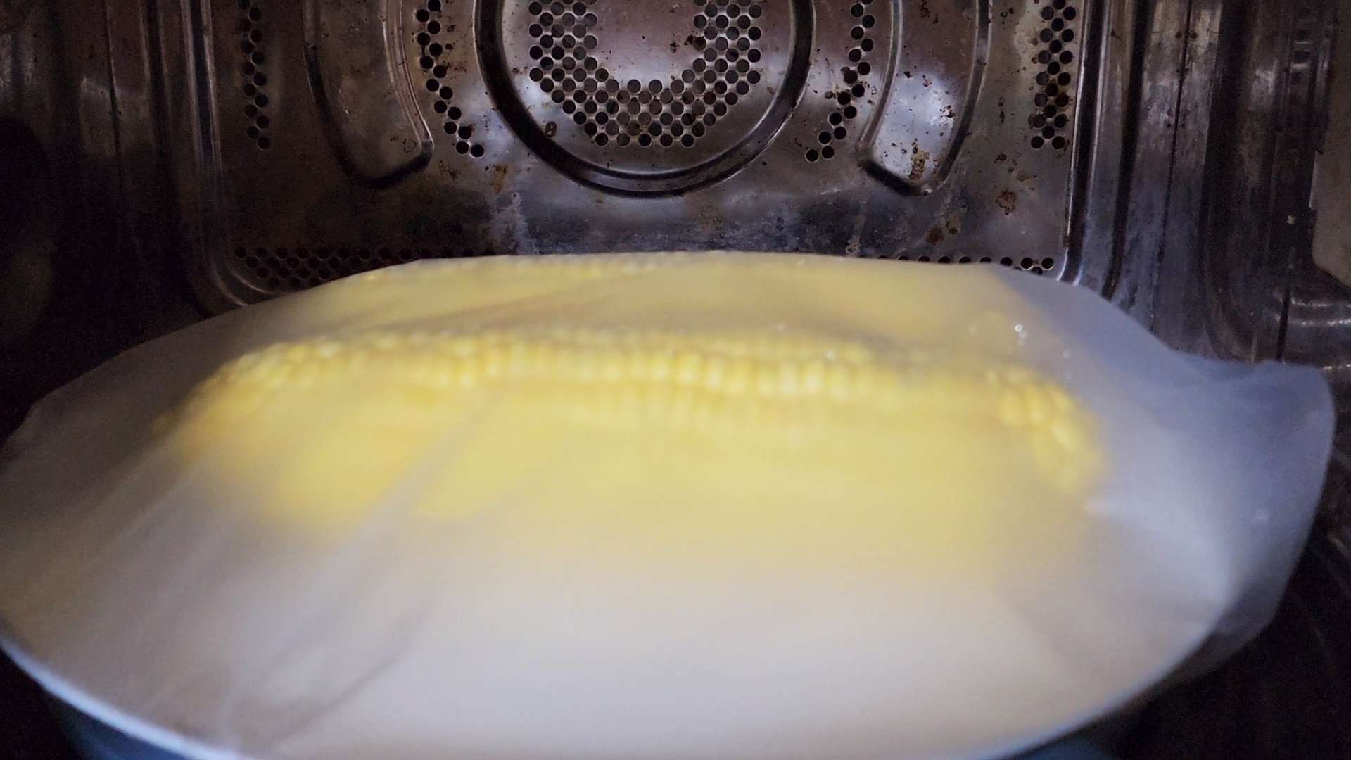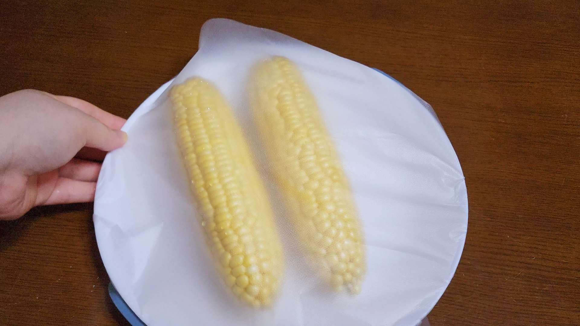 그릇에 물기남은 초당옥수수를 올리고 랩을 씌워줍니다.