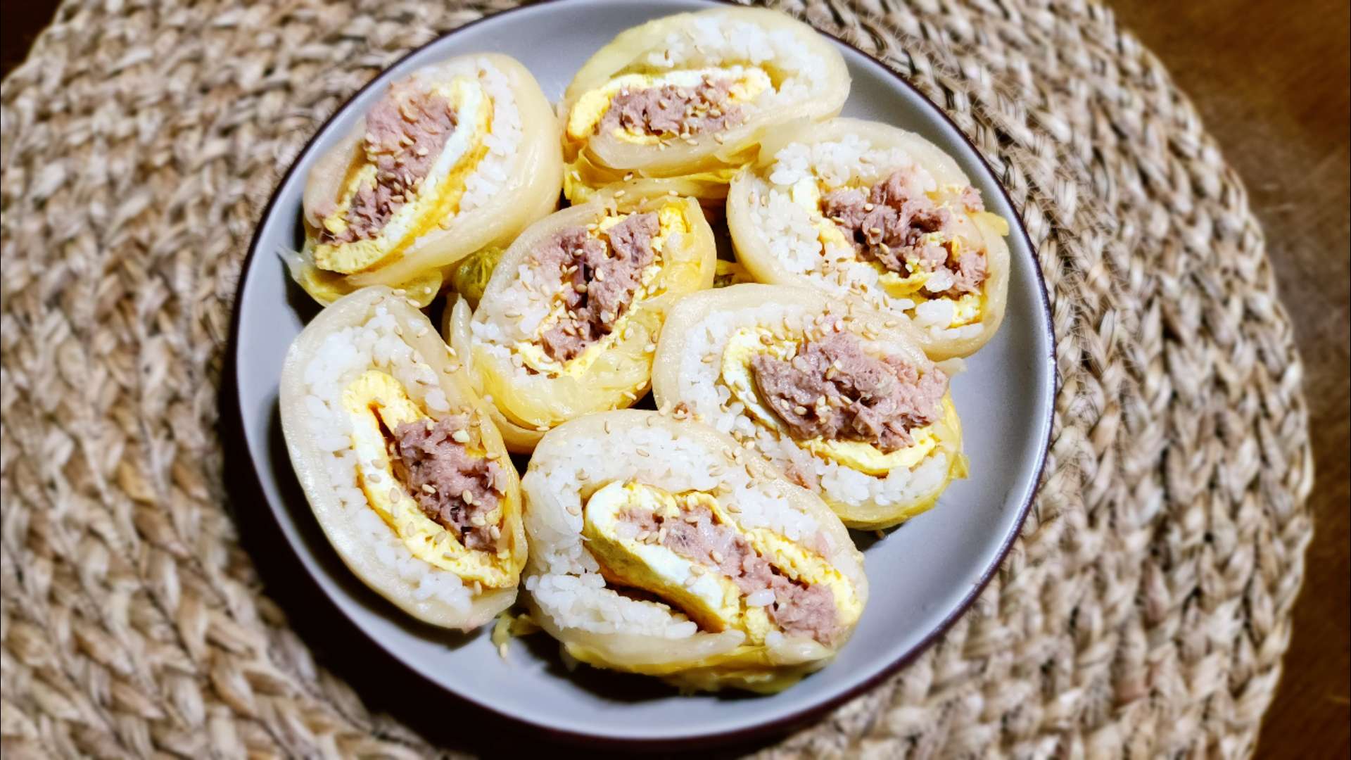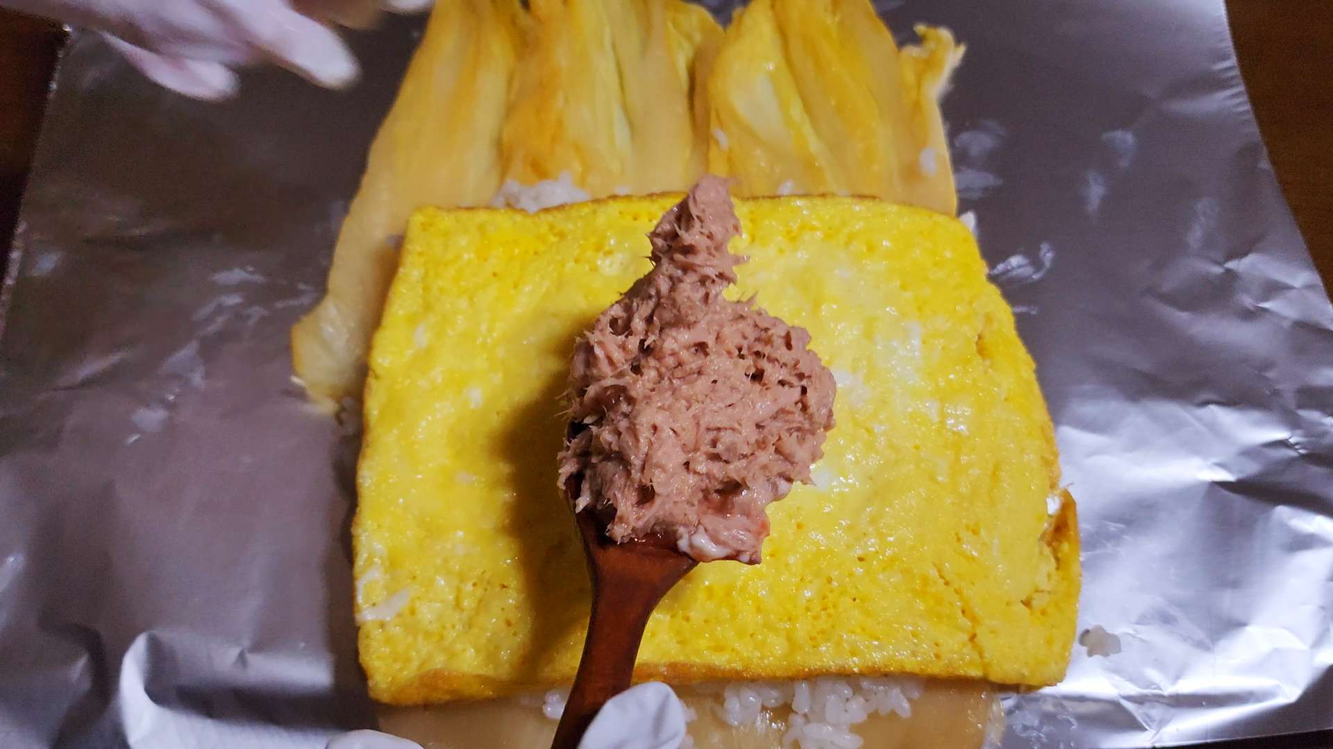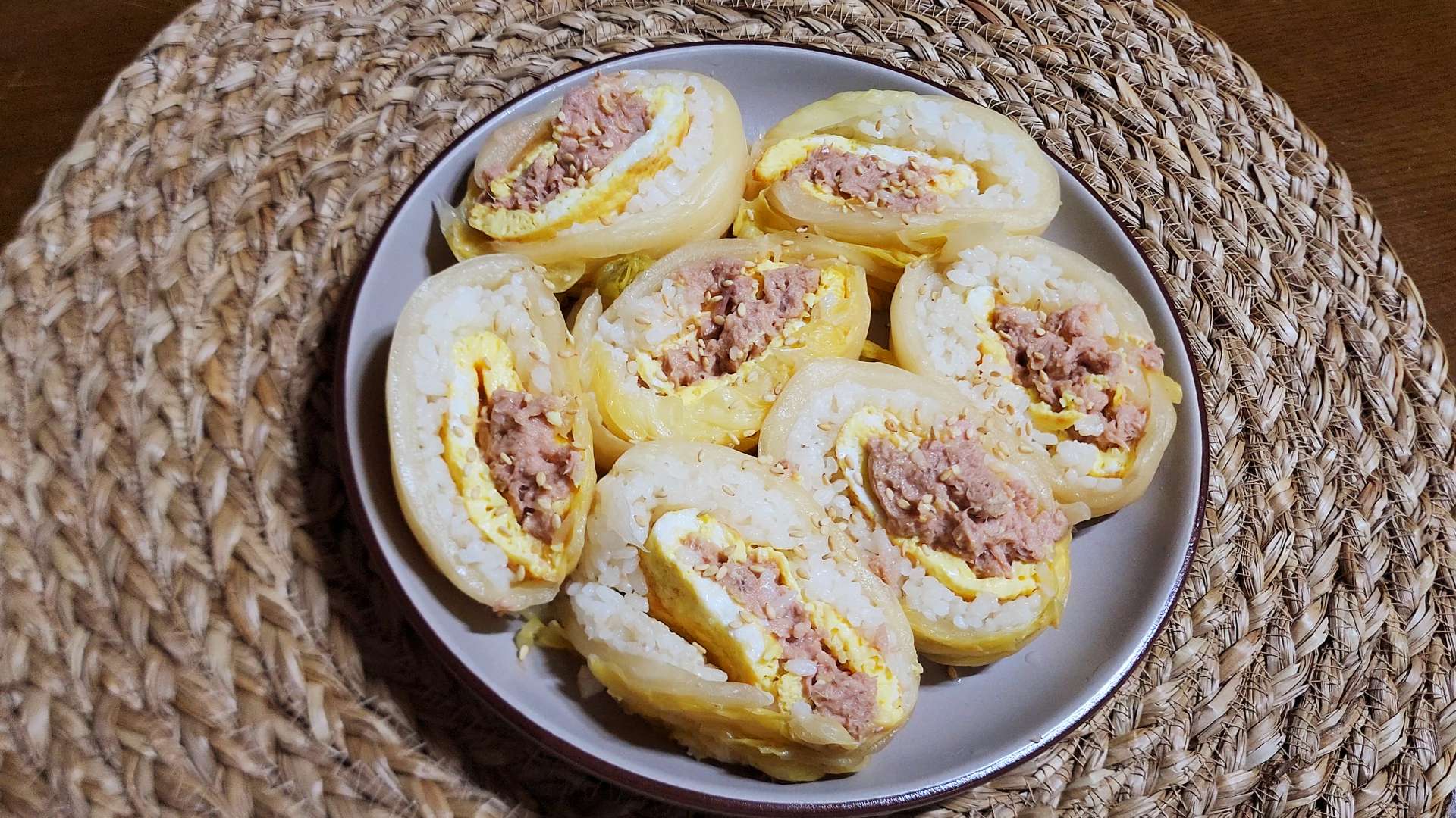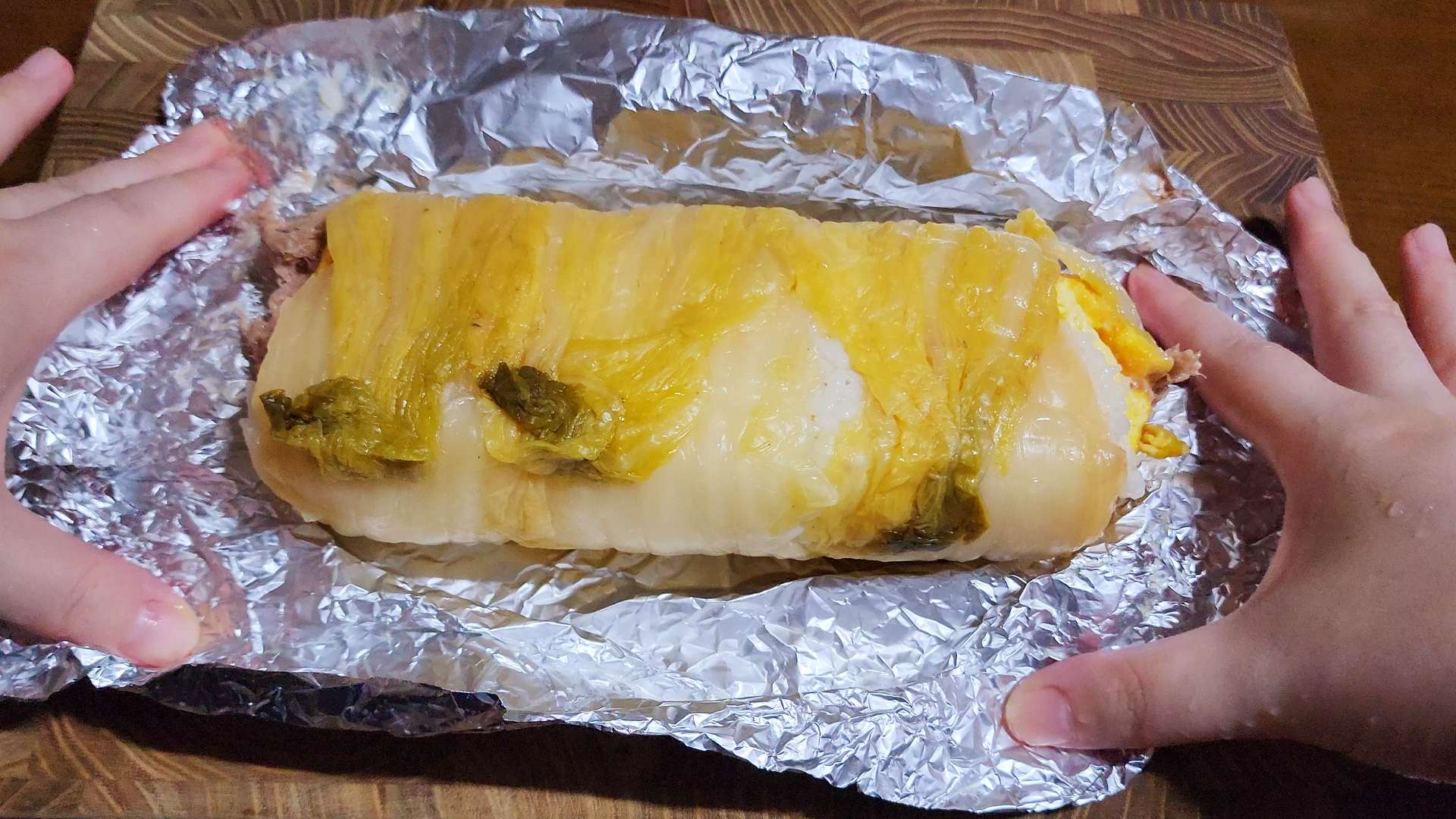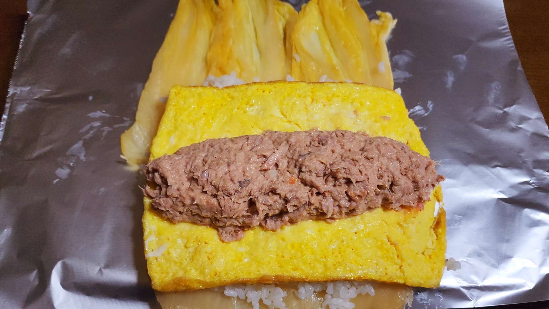 도마 위에 쿠킹호일을 올리고 배추김치-> 밥-> 달걀지단-> 참치 순으로 올려줍니다.
