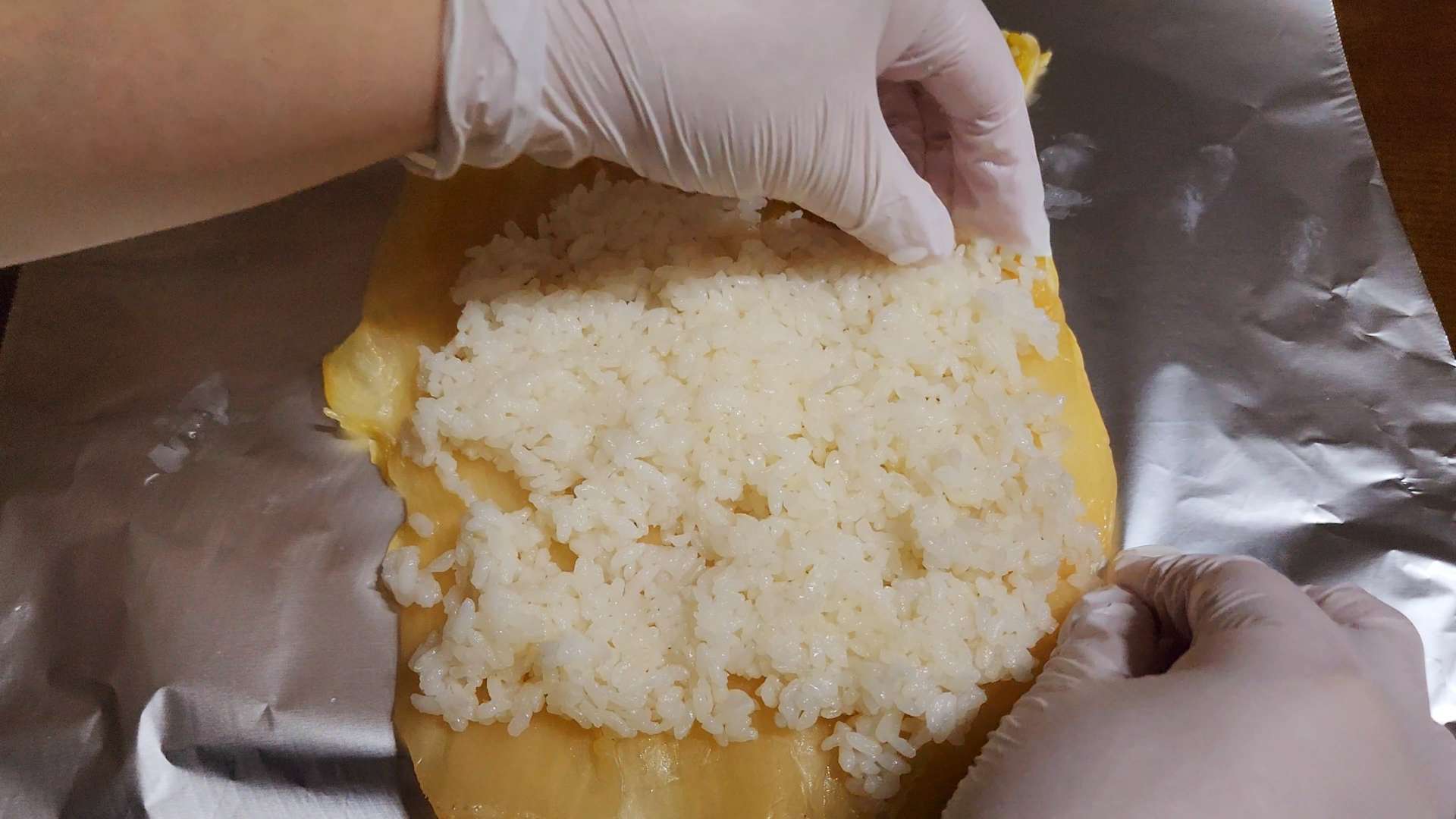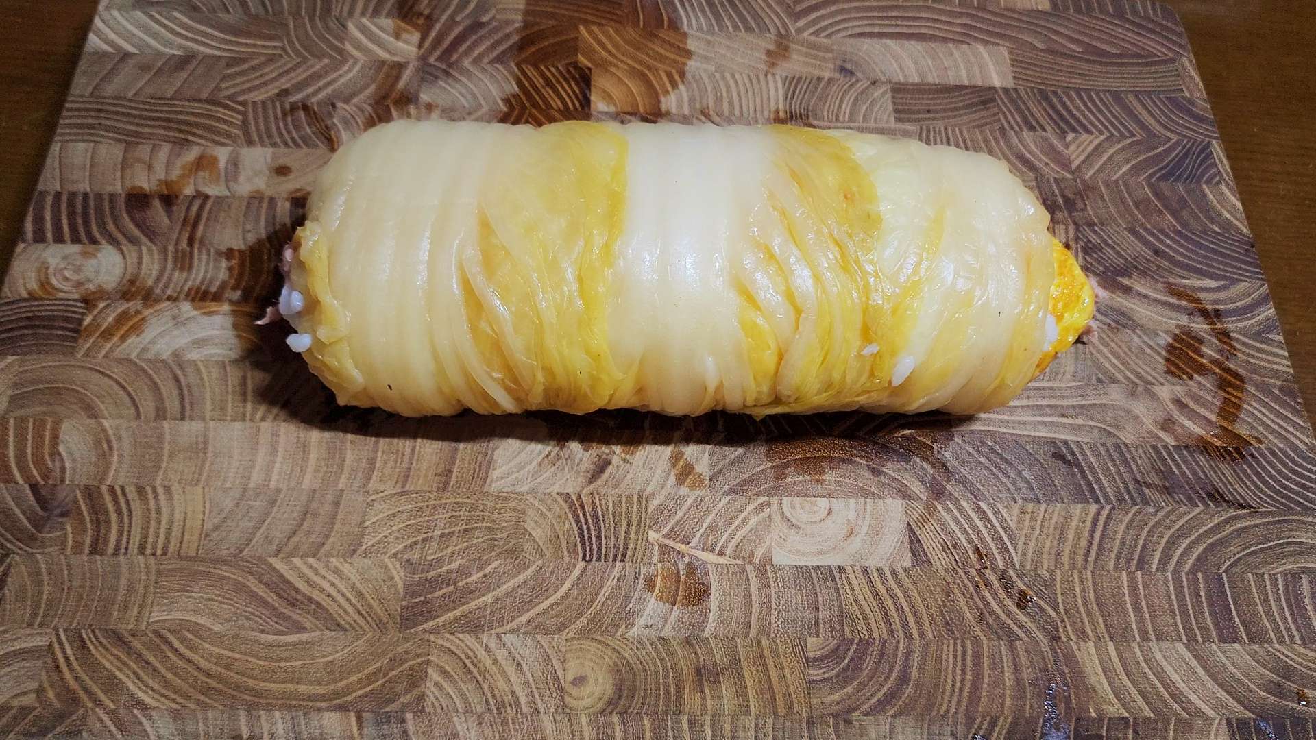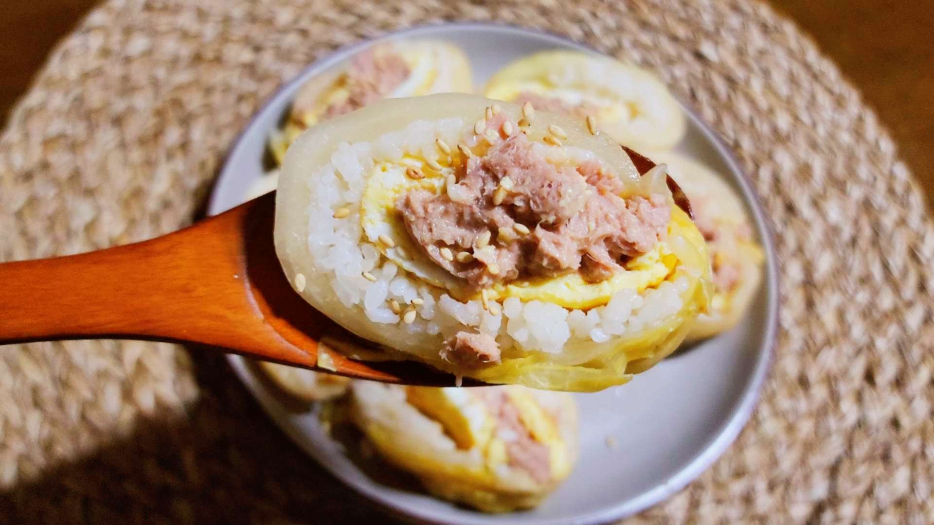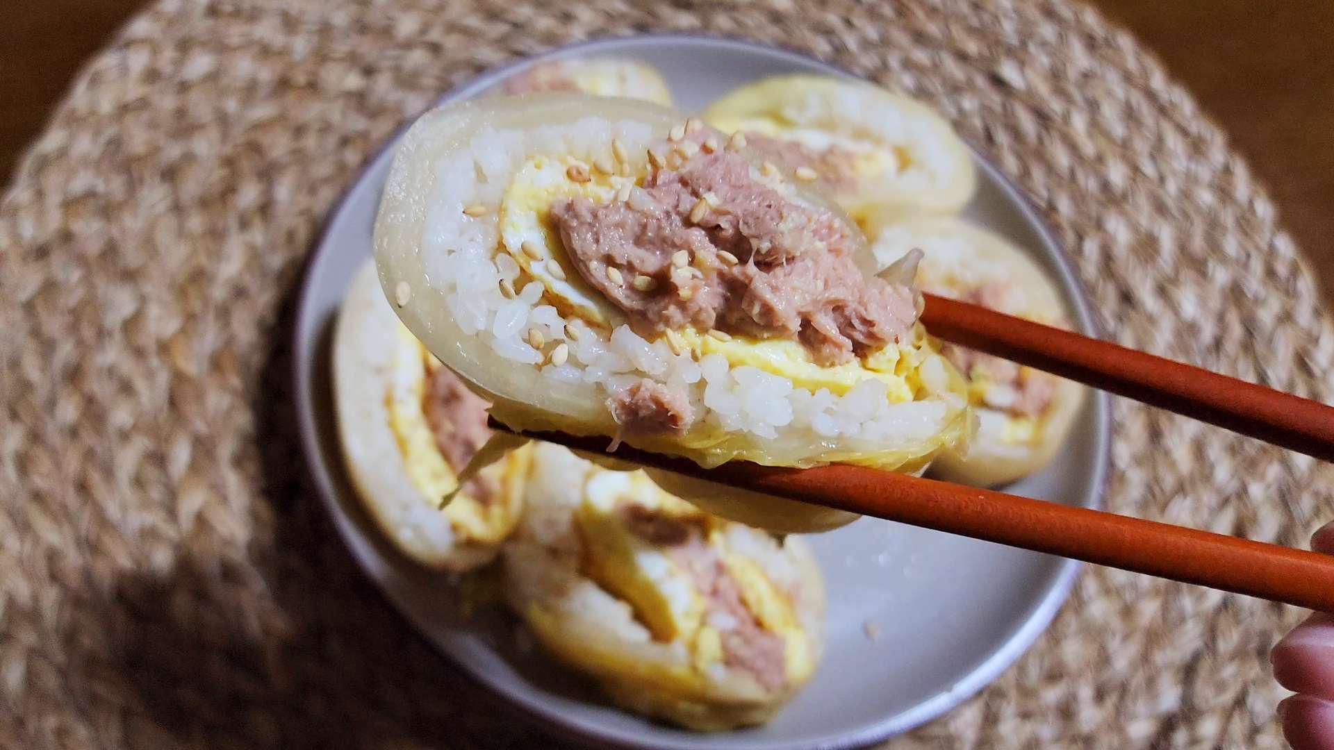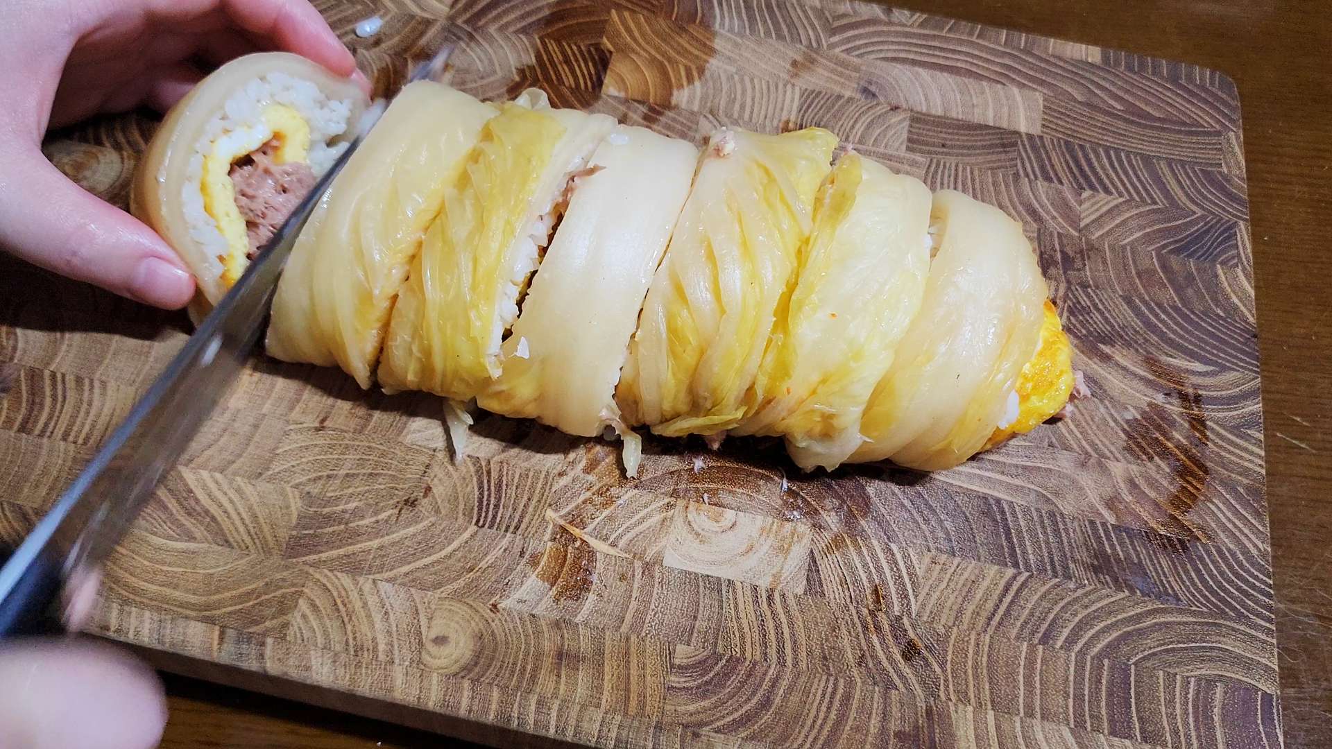 도마 위에 쿠킹호일을 올리고 배추김치-> 밥-> 달걀지단-> 참치 순으로 올려줍니다.