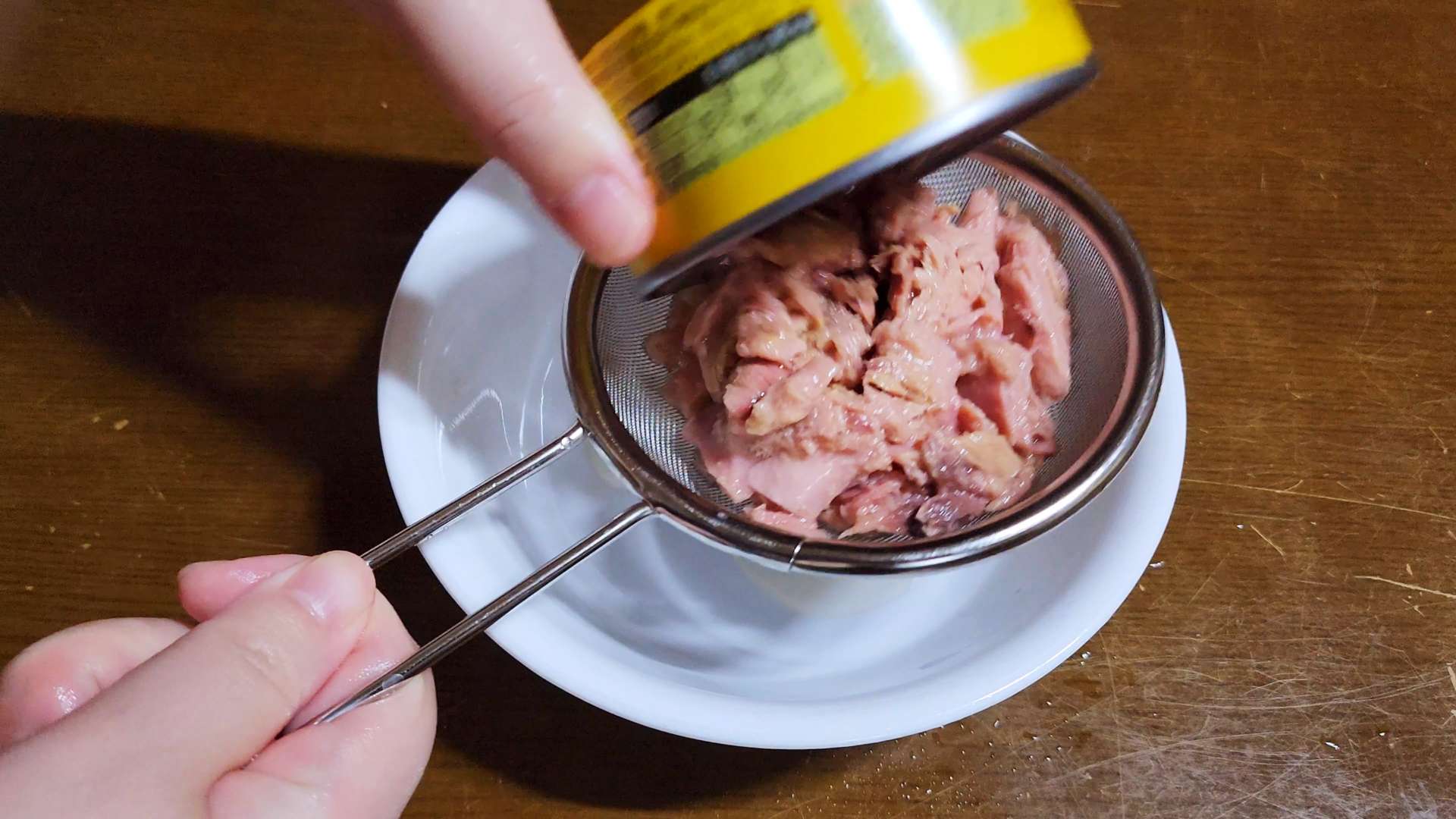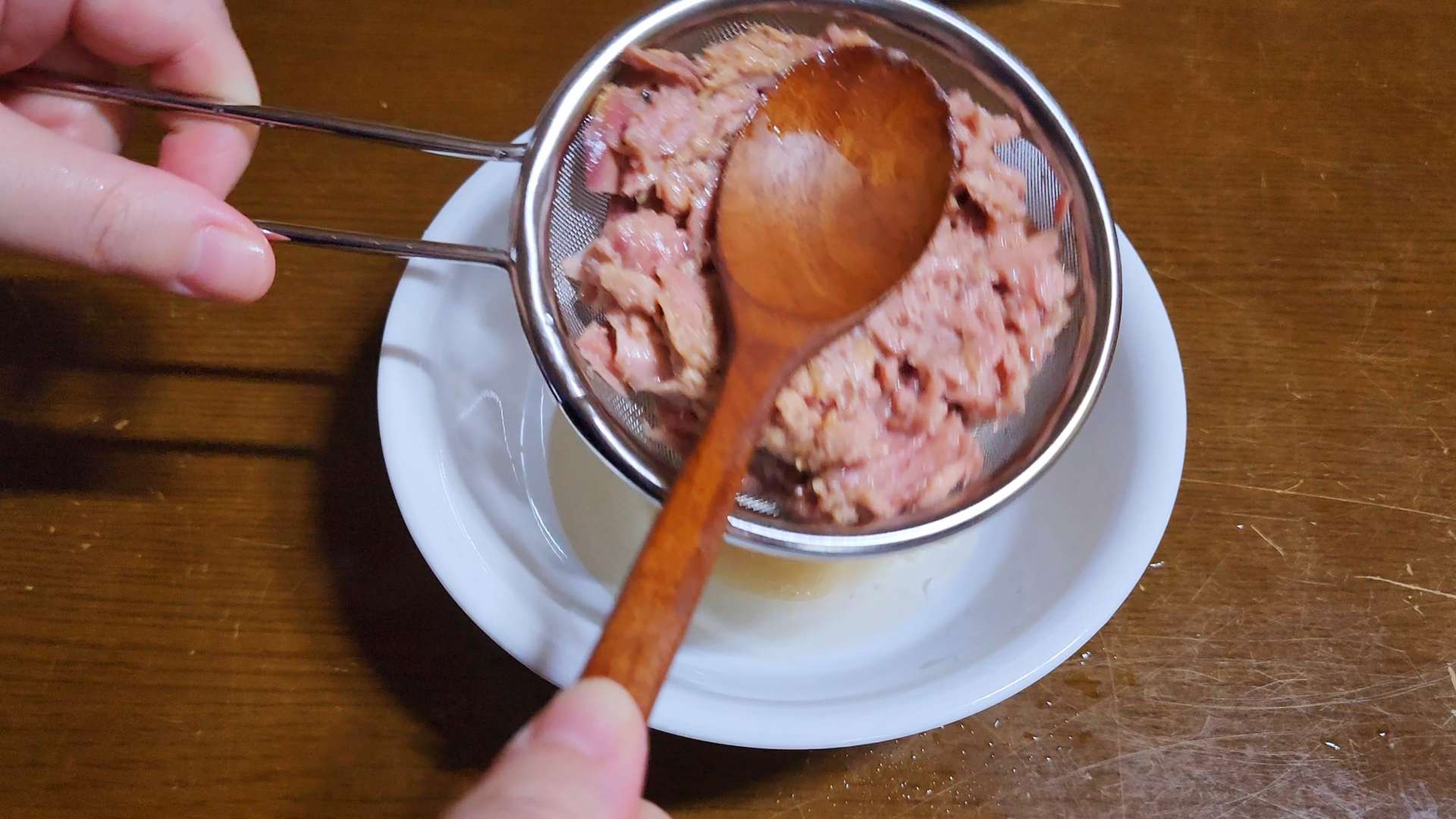 참치는 체반에 밭쳐 기름을 빼줍니다.