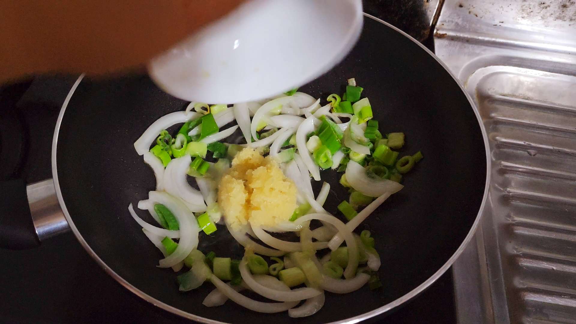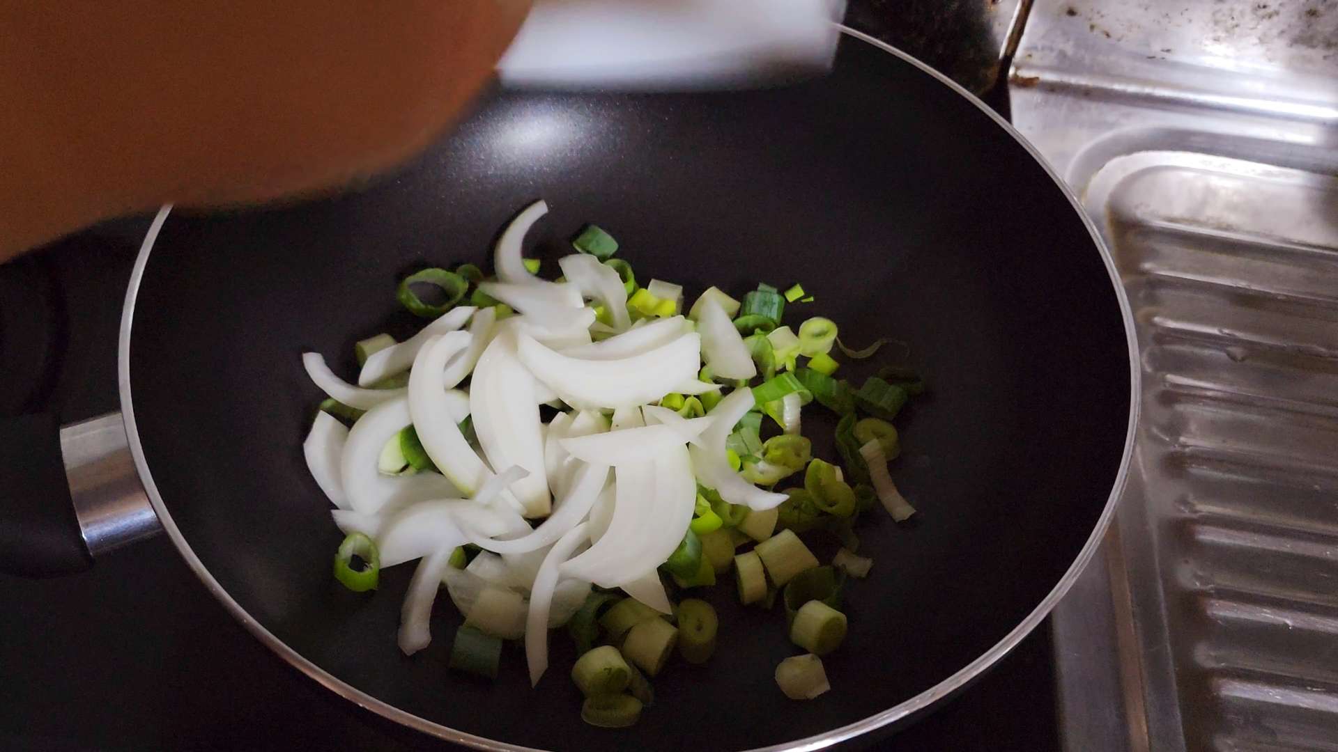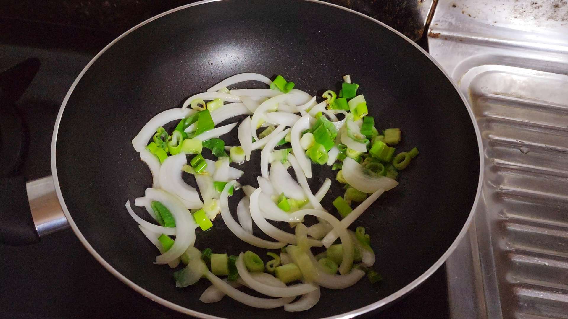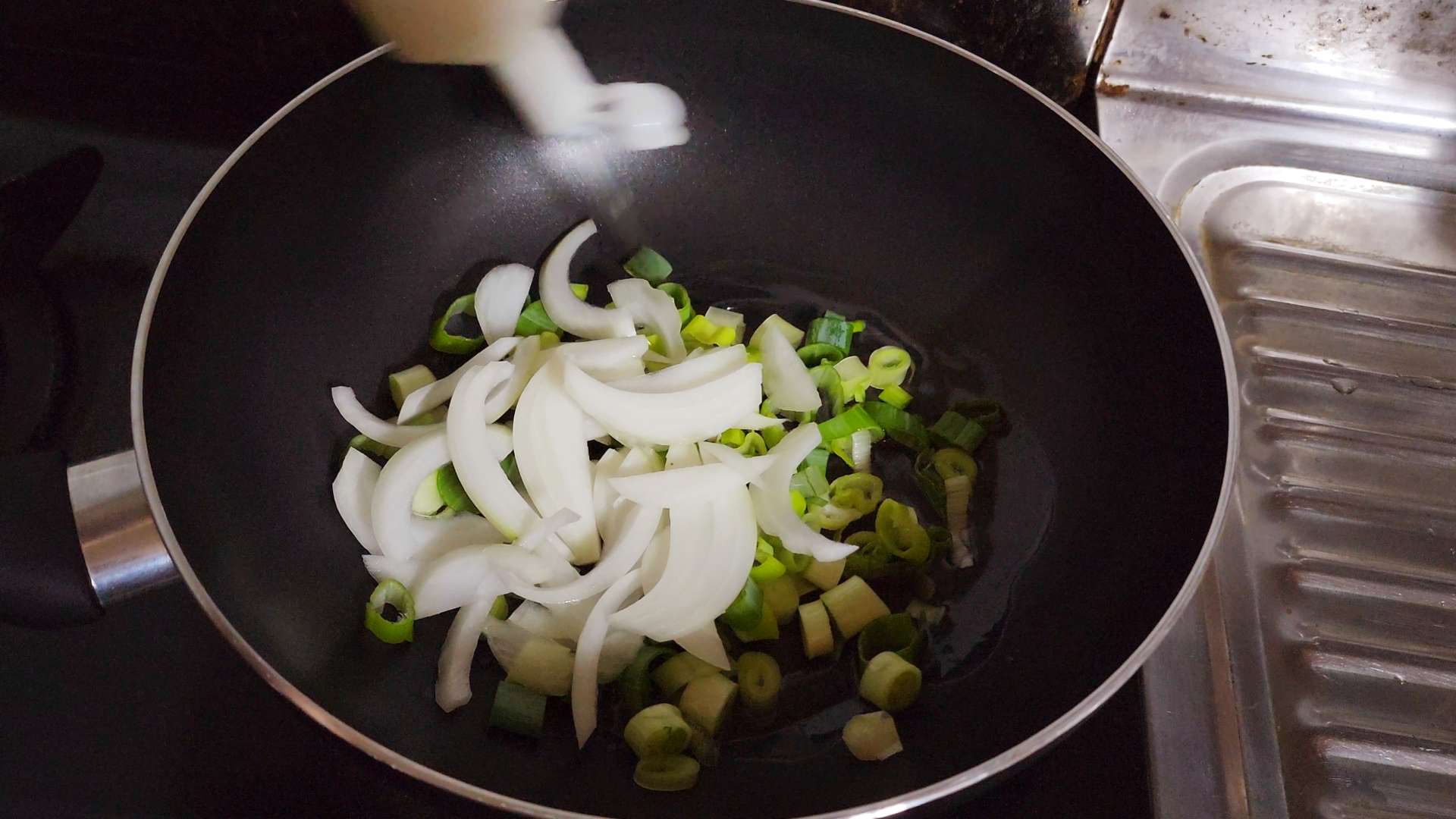 강불로 달군팬에 대파, 양파, 식용유 2바퀴를 넣고 강불에서 볶아줍니다.