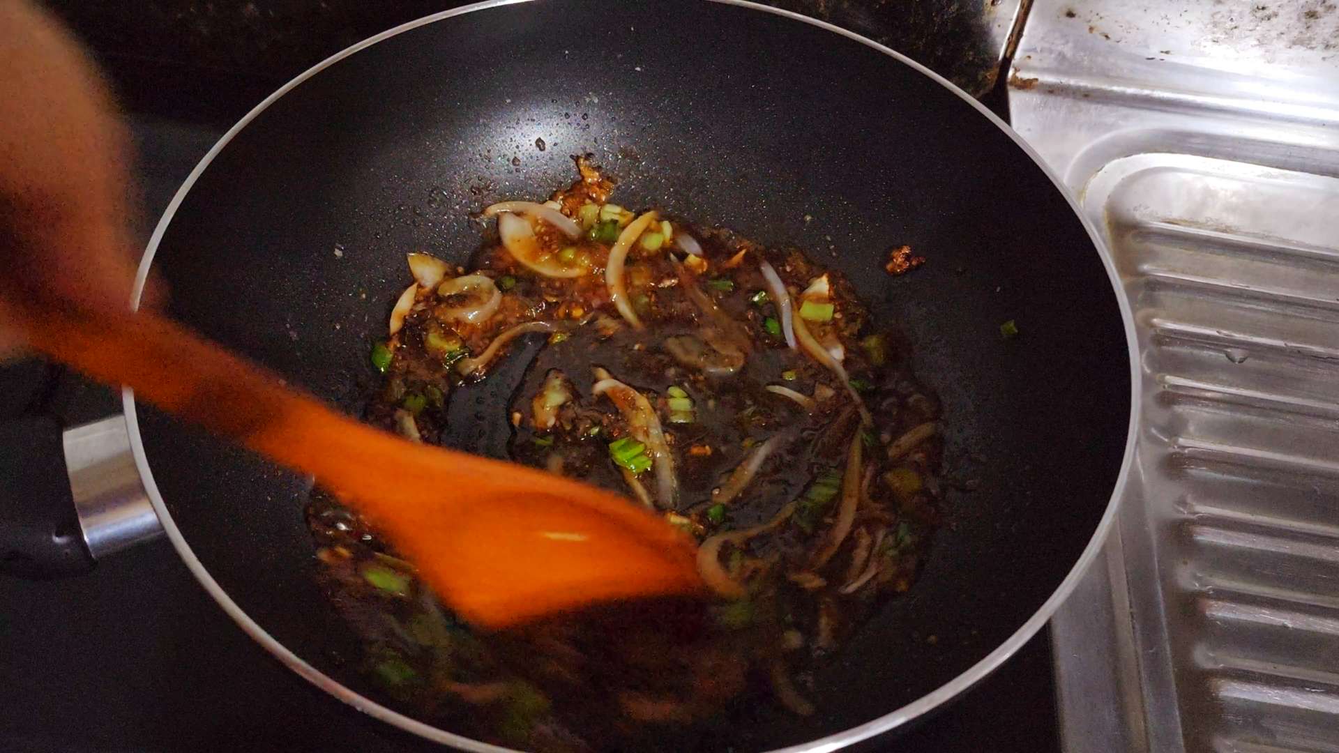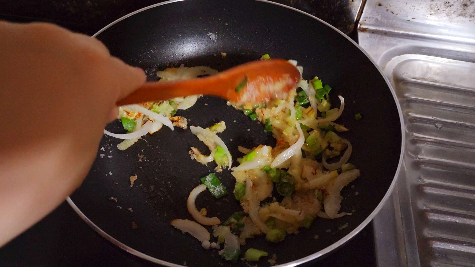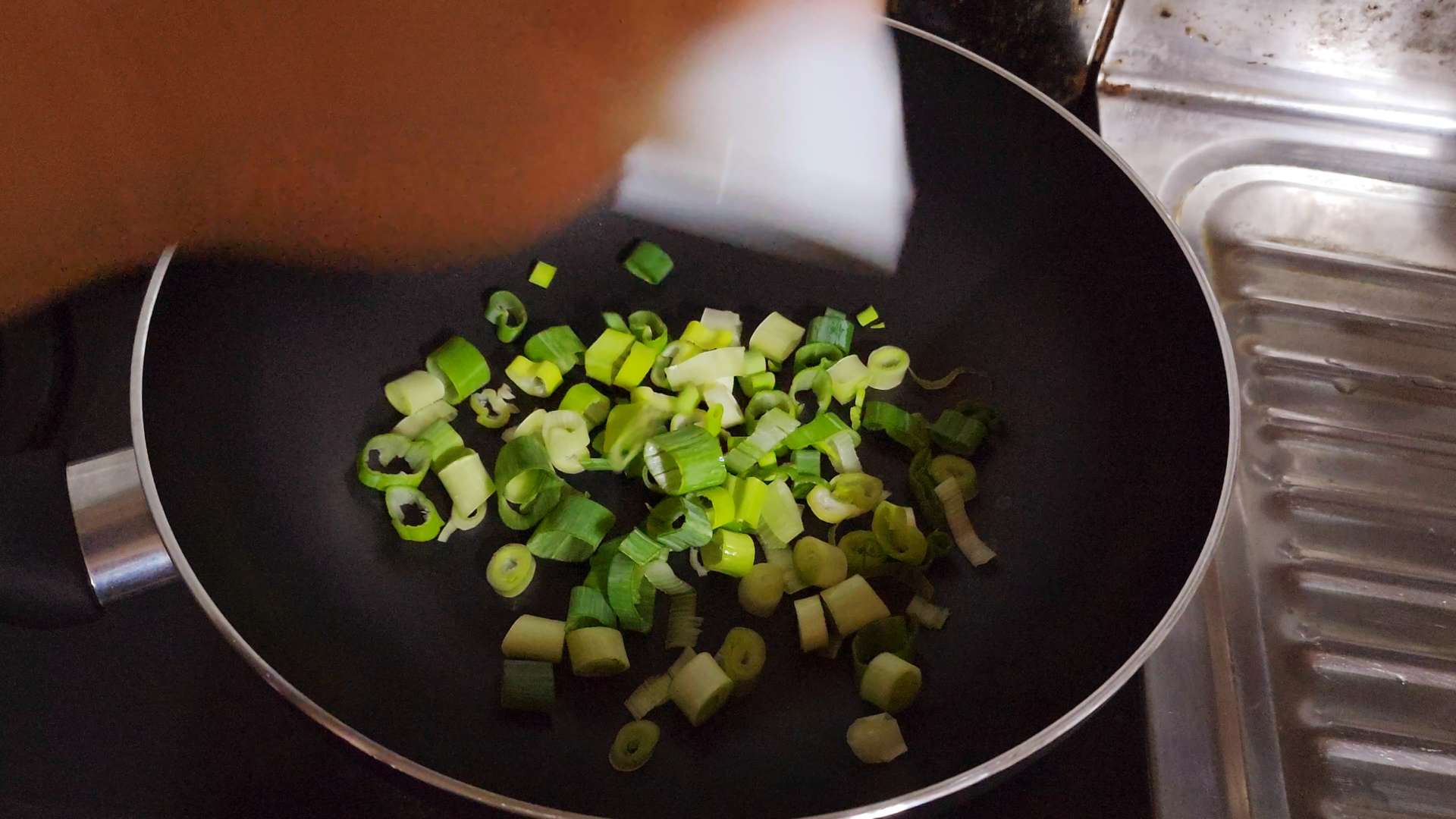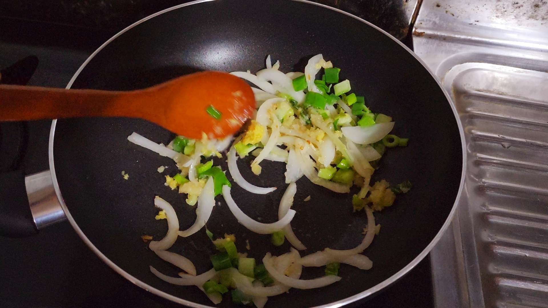 강불로 달군팬에 대파, 양파, 식용유 2바퀴를 넣고 강불에서 볶아줍니다.