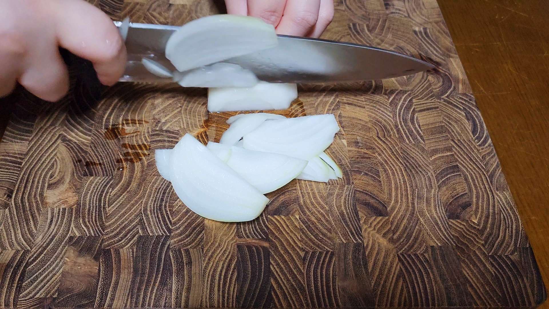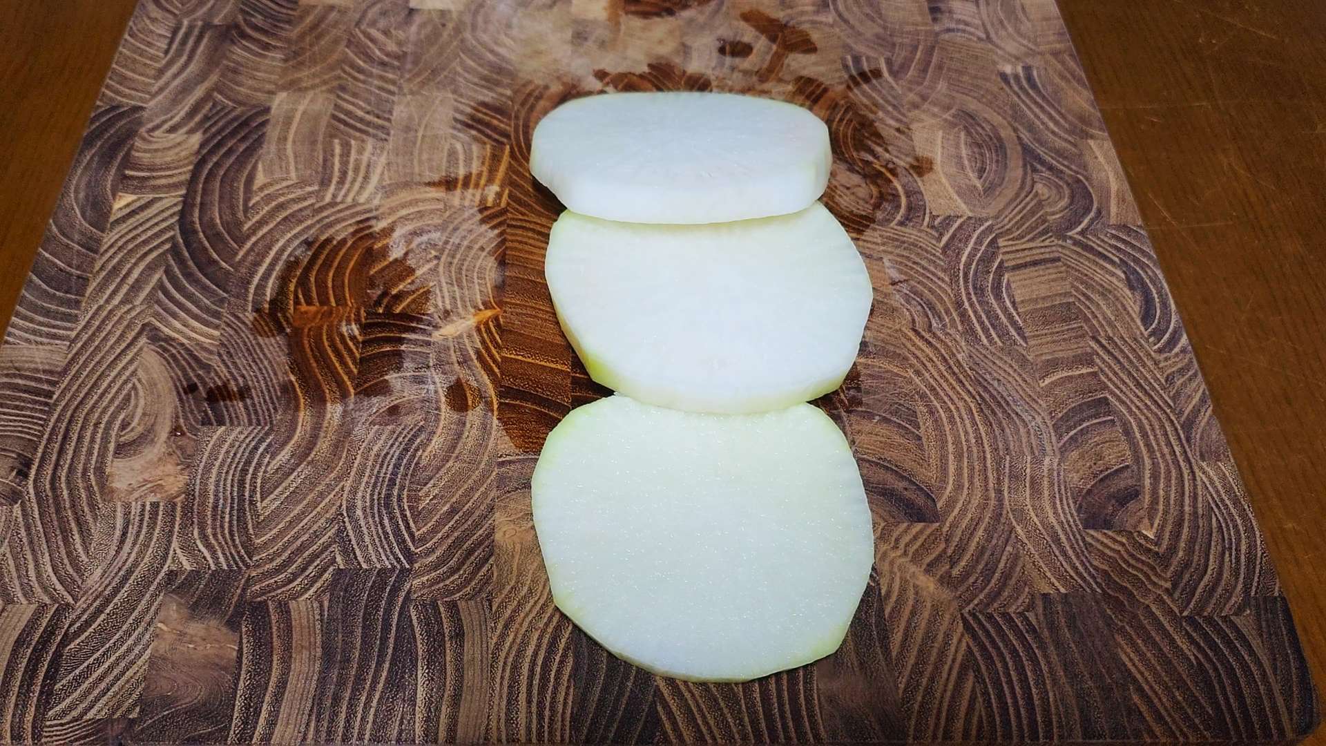 무는 껍질을 벗기고 2cm 두께로 큼직하게 썰어줍니다.