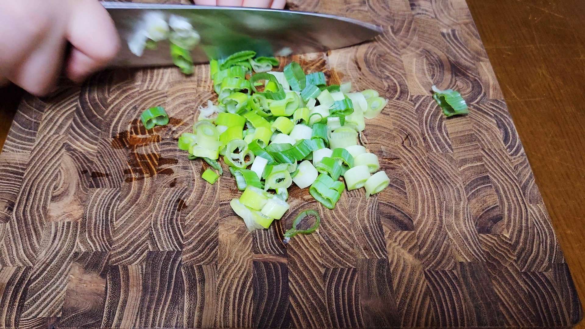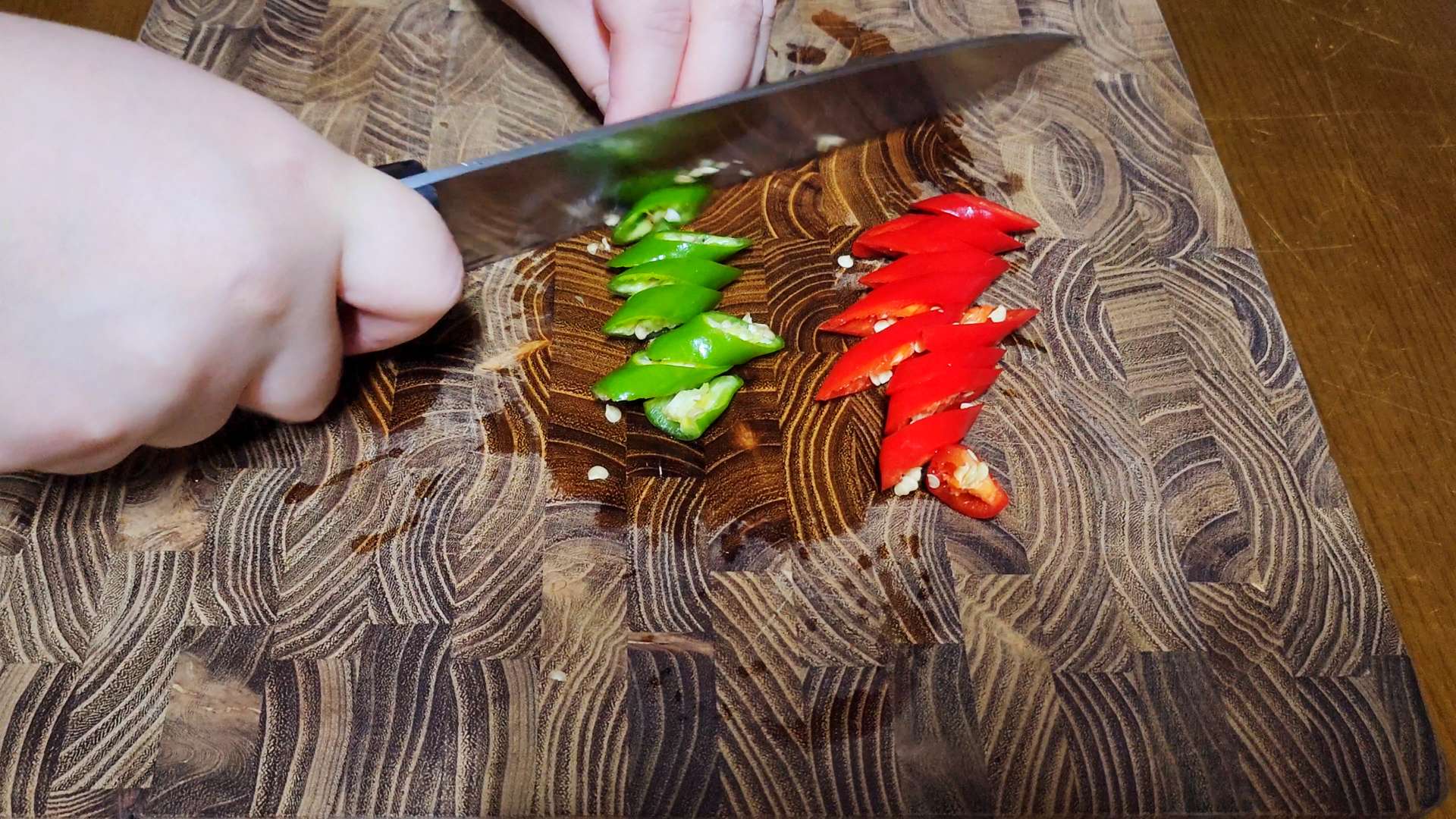 홍고추 1개, 청양고추 1개는 어슷썰어줍니다.