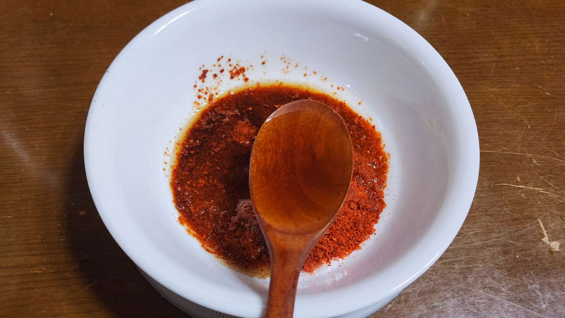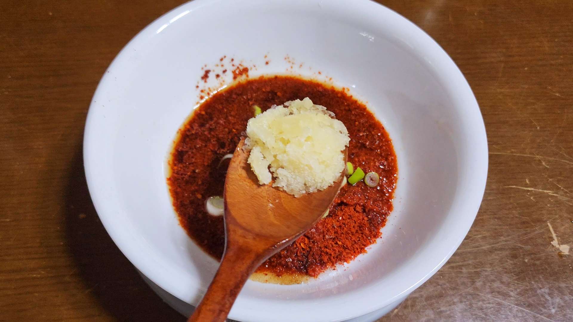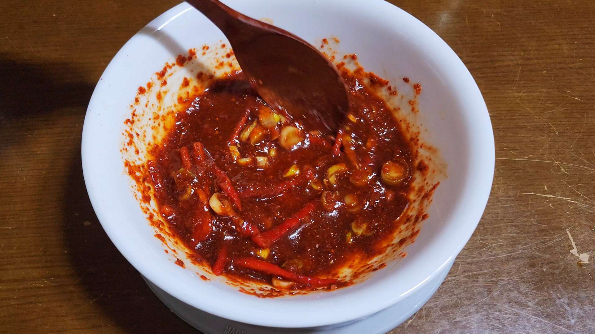 설탕 1T, 고춧가루 2T, 양조간장 3T, 청주 2T, 멸치액젓 0.5T, 올리고당 1T, 대파, 다진마늘 0.3T, 홍고추를 넣고 섞어줍니다.