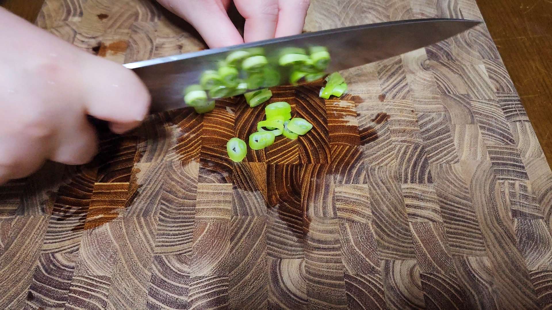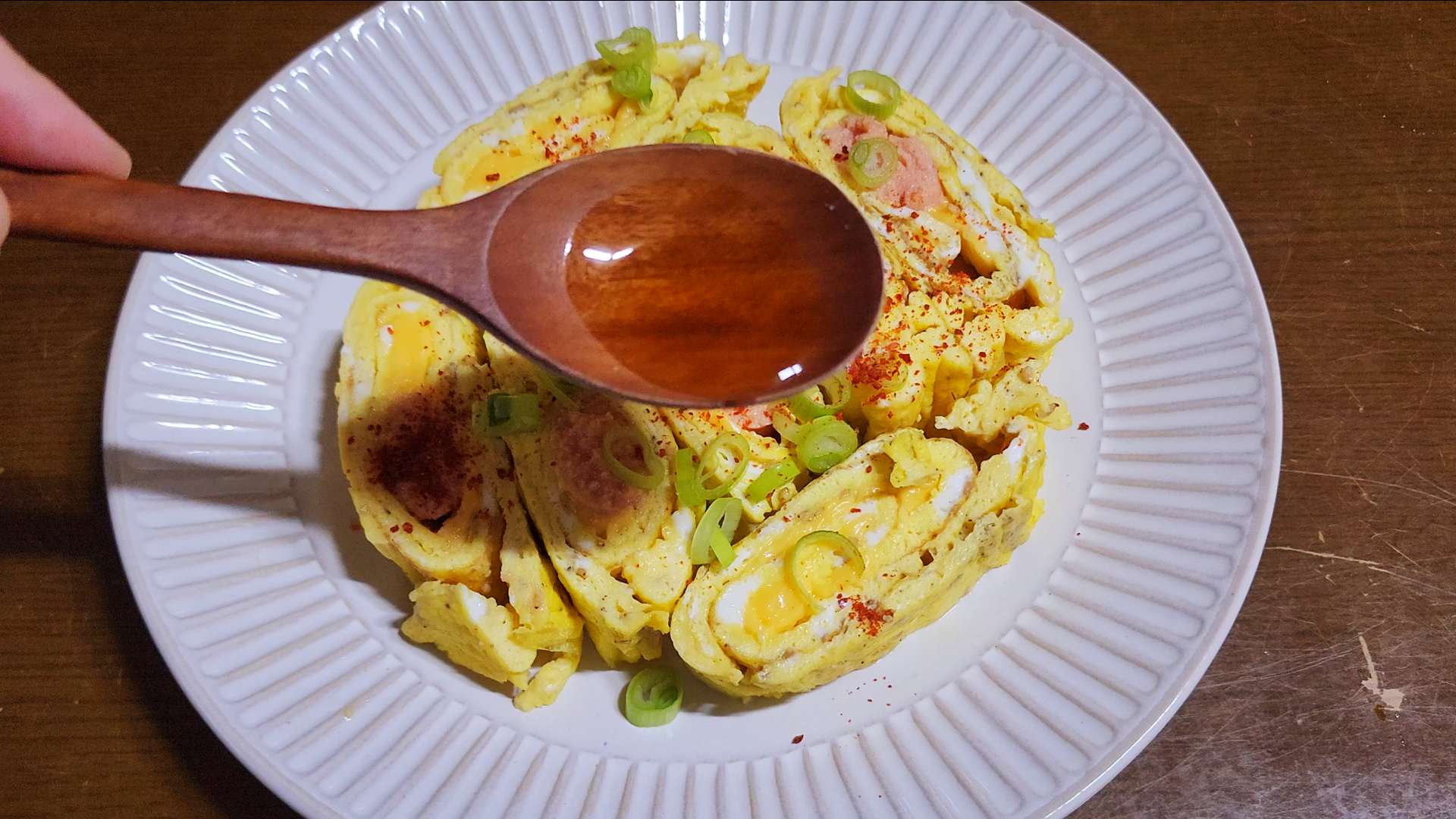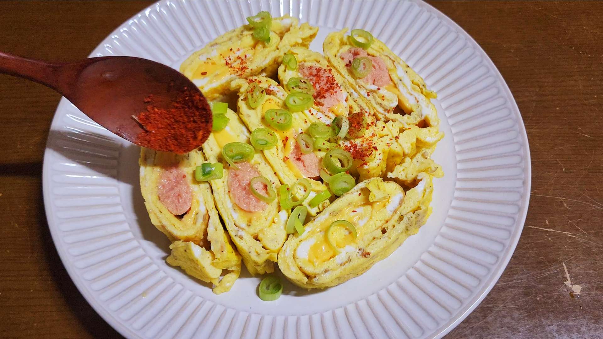 그릇에 달걀말이를 담고 대파, 고춧가루, 참기름을 뿌려줍니다.