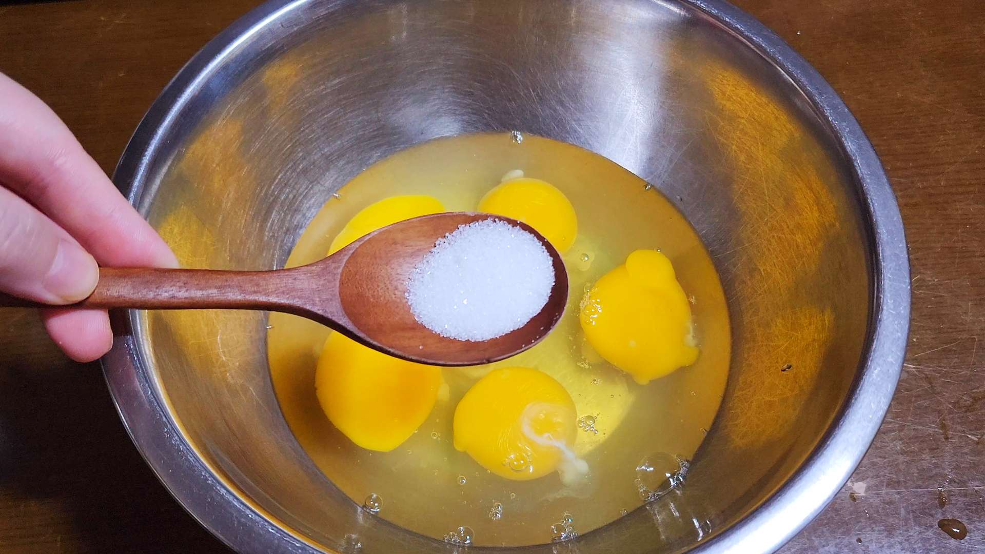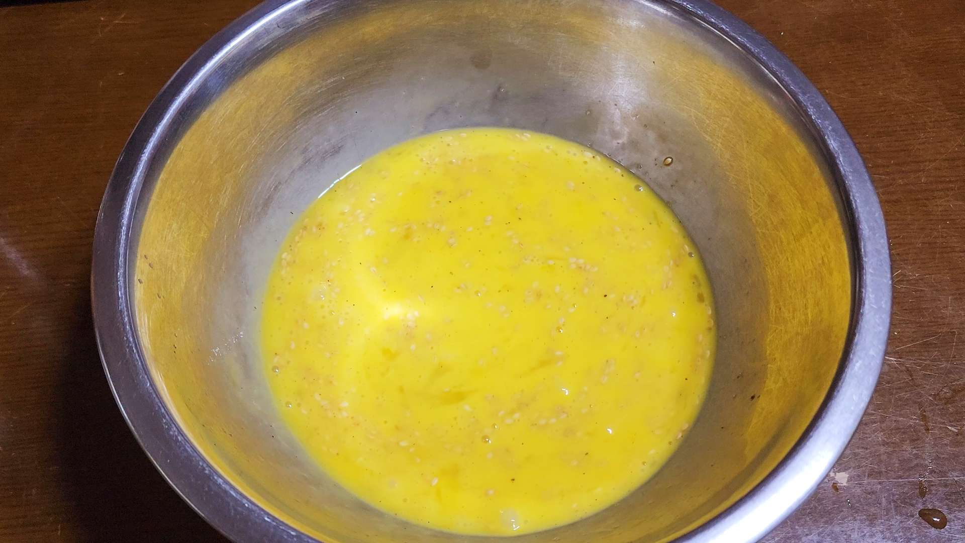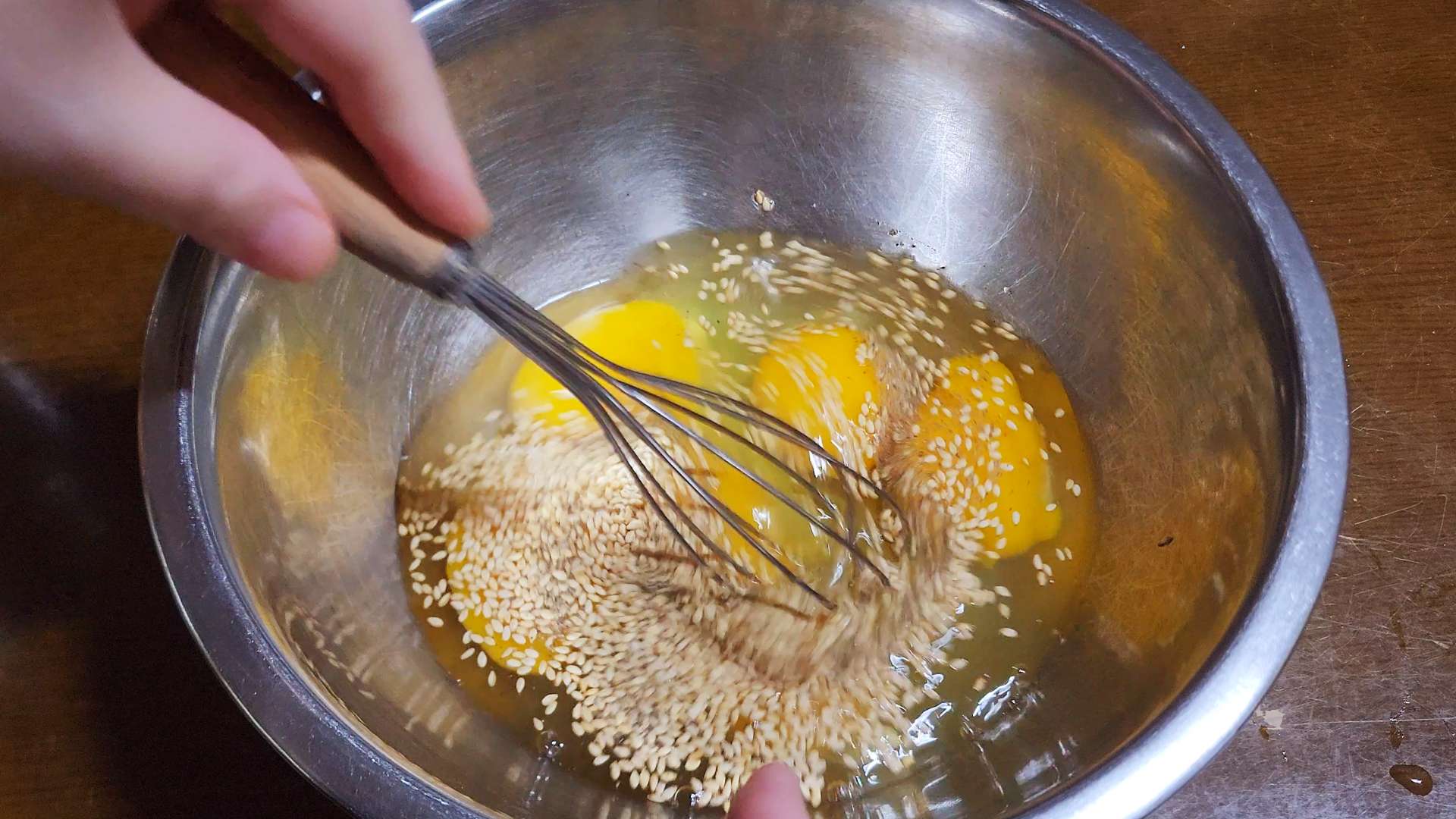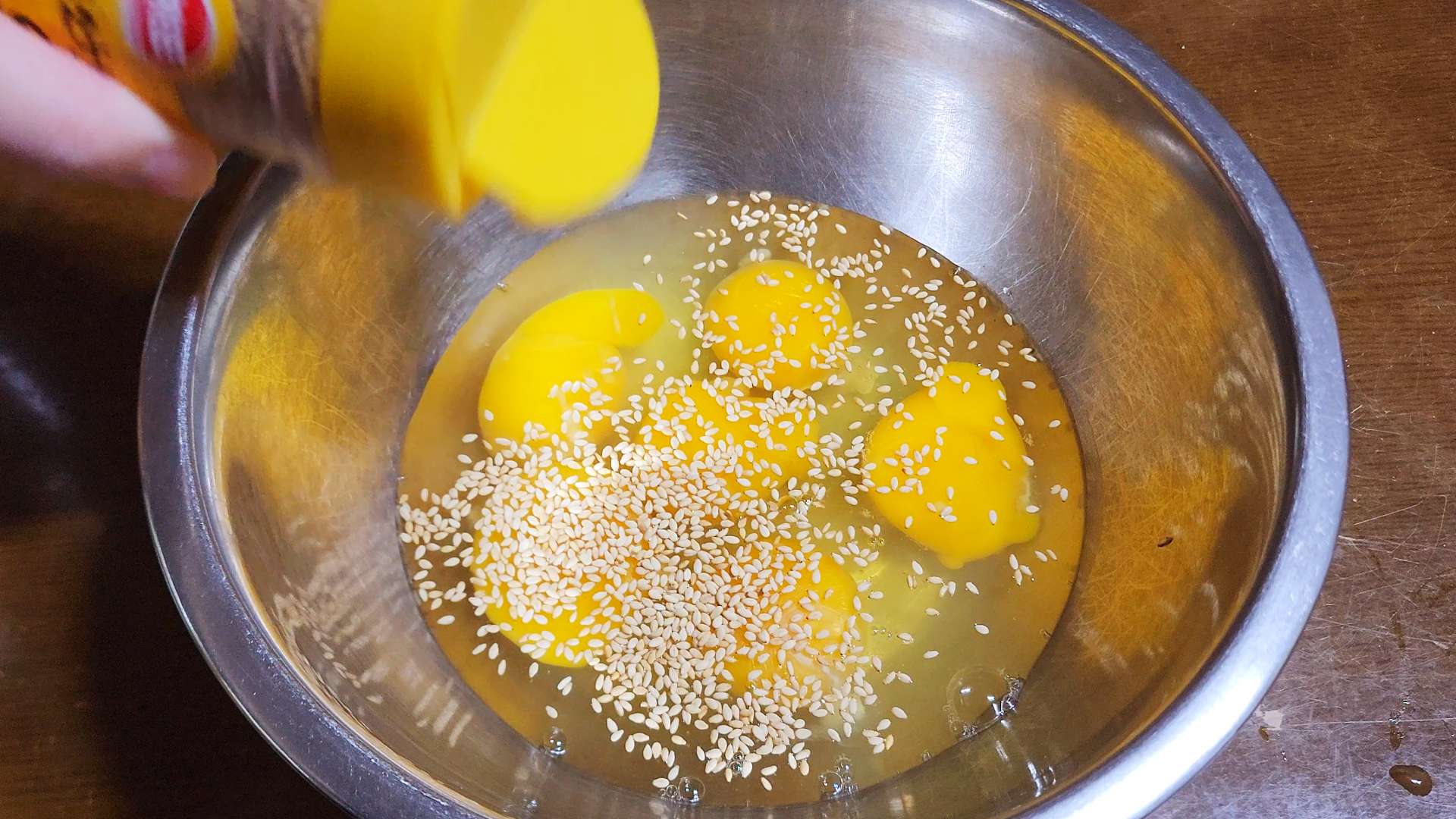 달걀 6개, 설탕 0.5T, 통깨, 후추 조금 넣고 섞어줍니다.