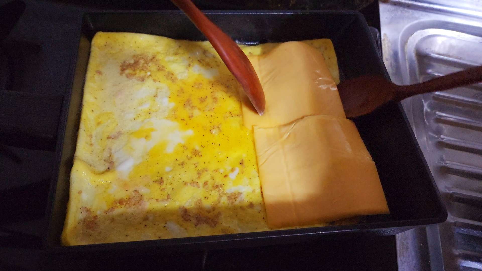 재료: 달걀 6개, 백명란 2개, 체다치즈 2장, 설탕 0.5T, 후추 조금, 통깨, 대파, 참기름, 고춧가루, 식용유