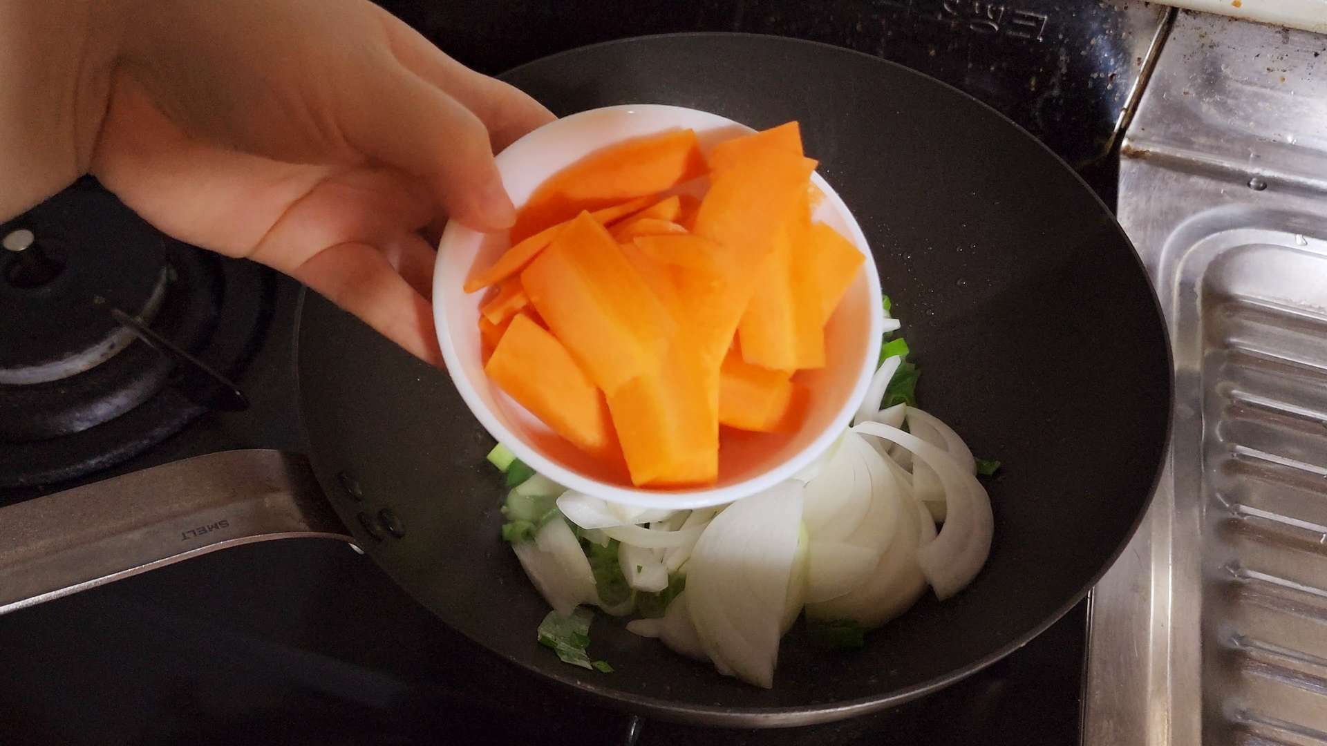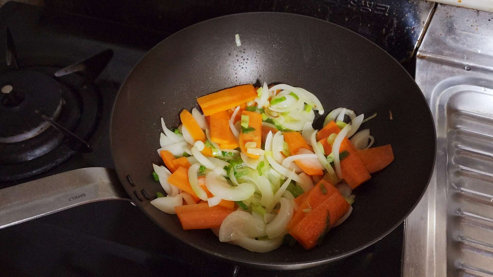 재료: 손질오징어 1마리, 대파 1대, 양파 1개, 당근 1/4개, 식용유, 참기름, 통깨