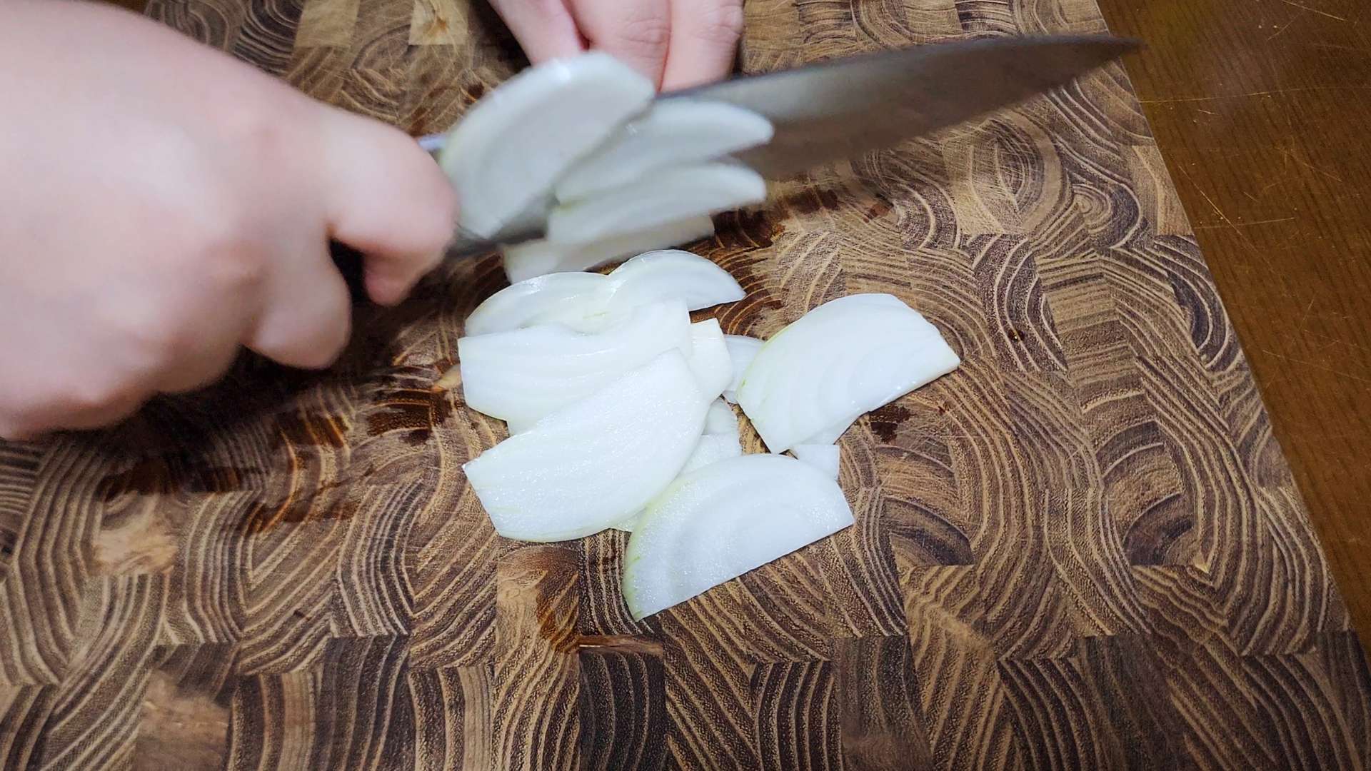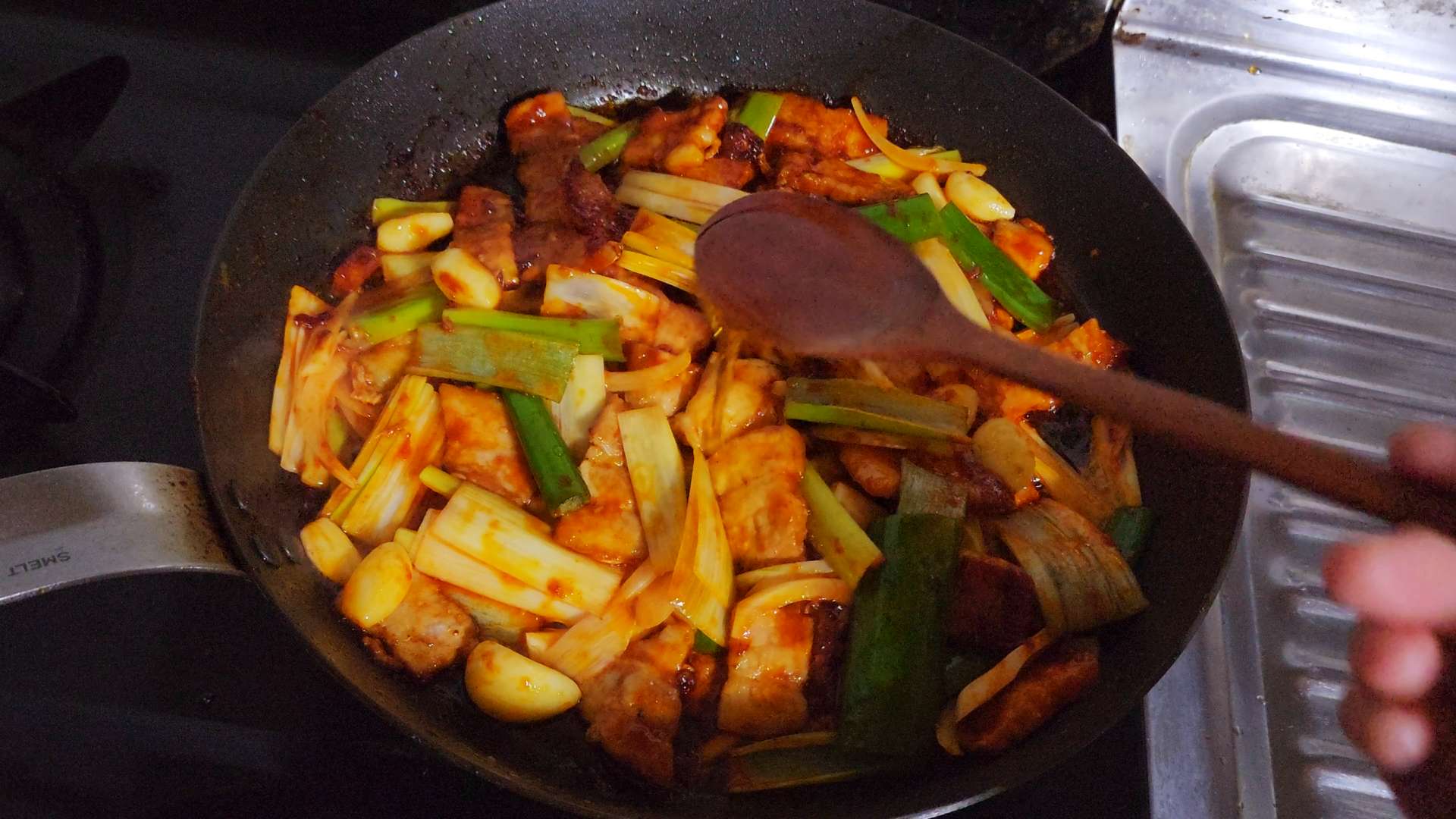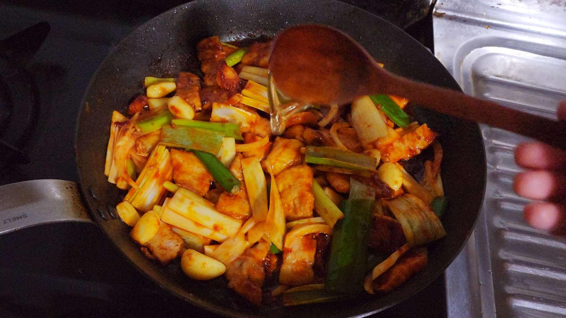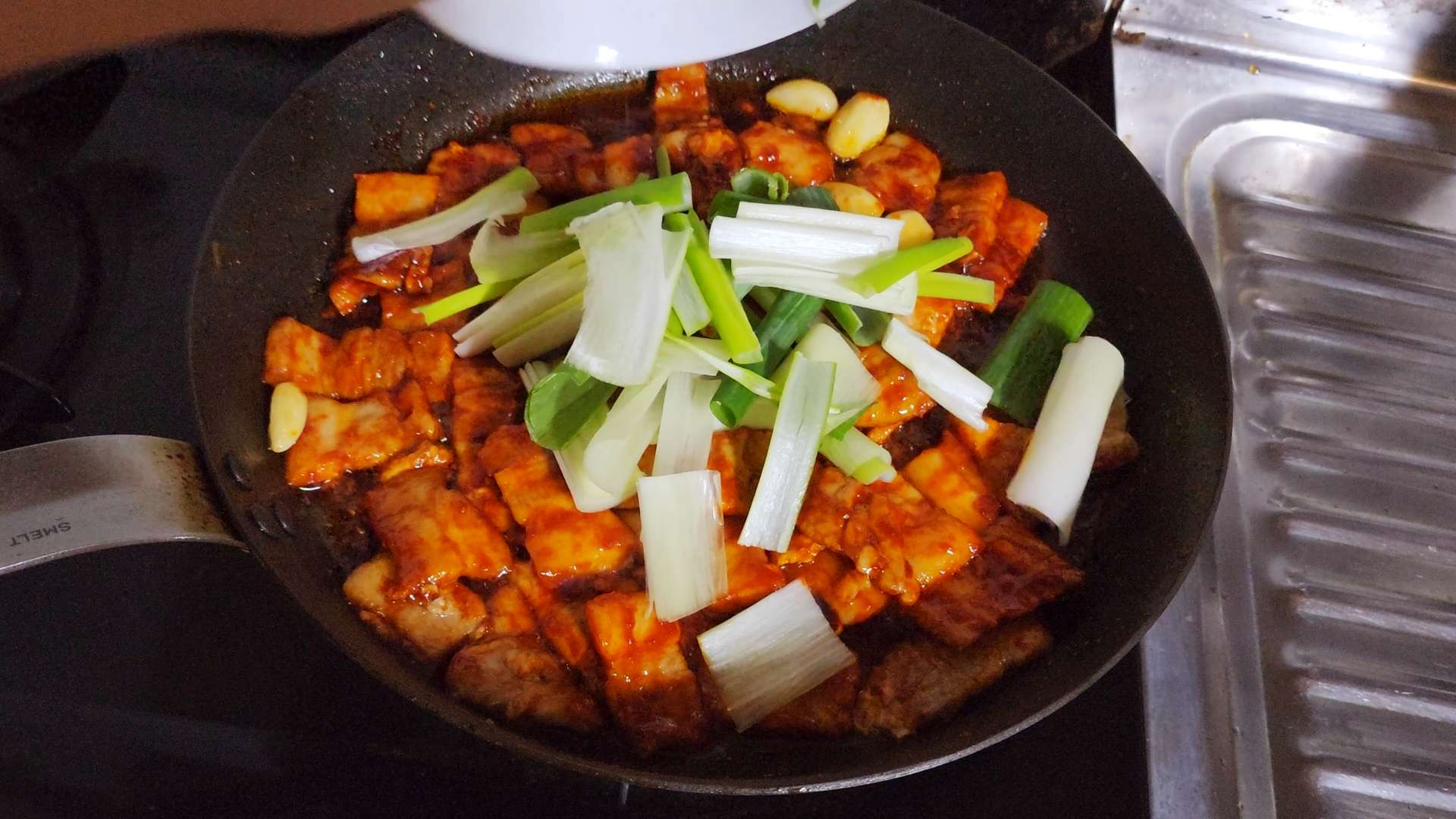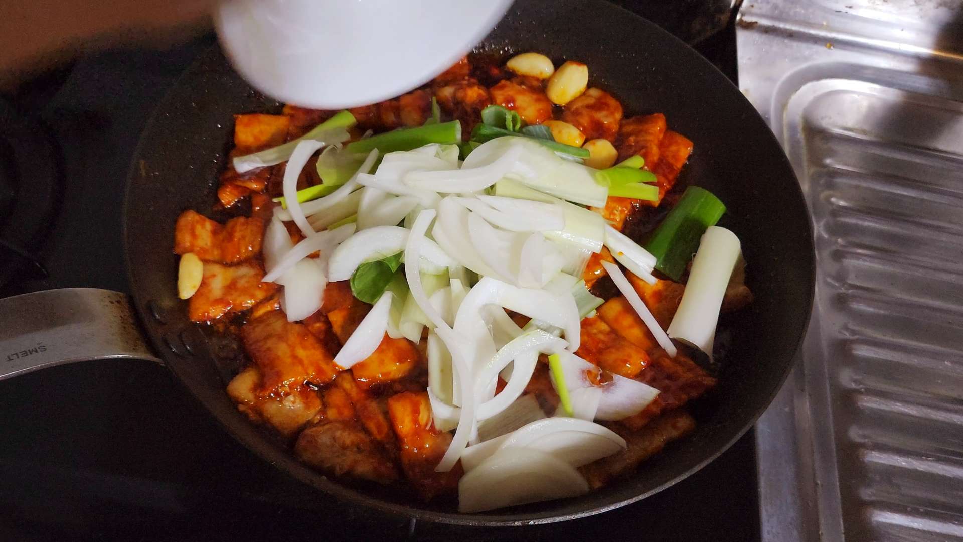 양념이 끓으면 중불로 낮추고 대파, 양파 넣고 1분 볶아줍니다.