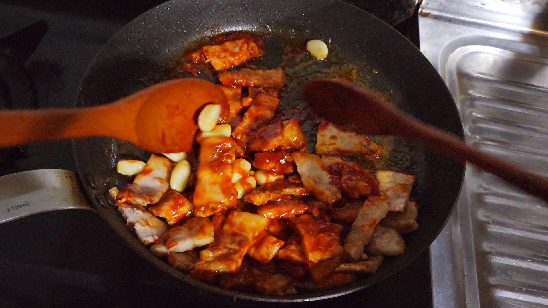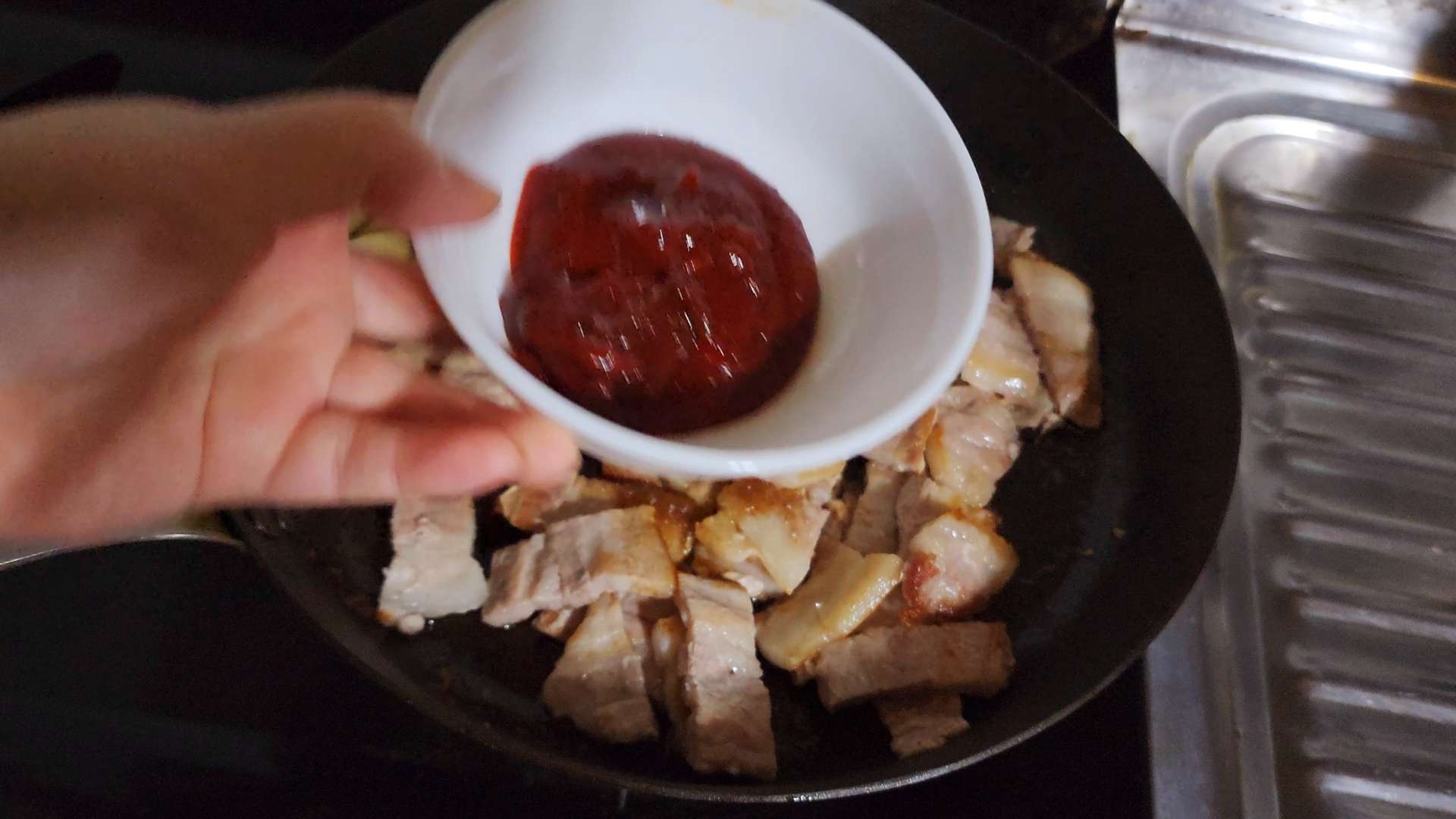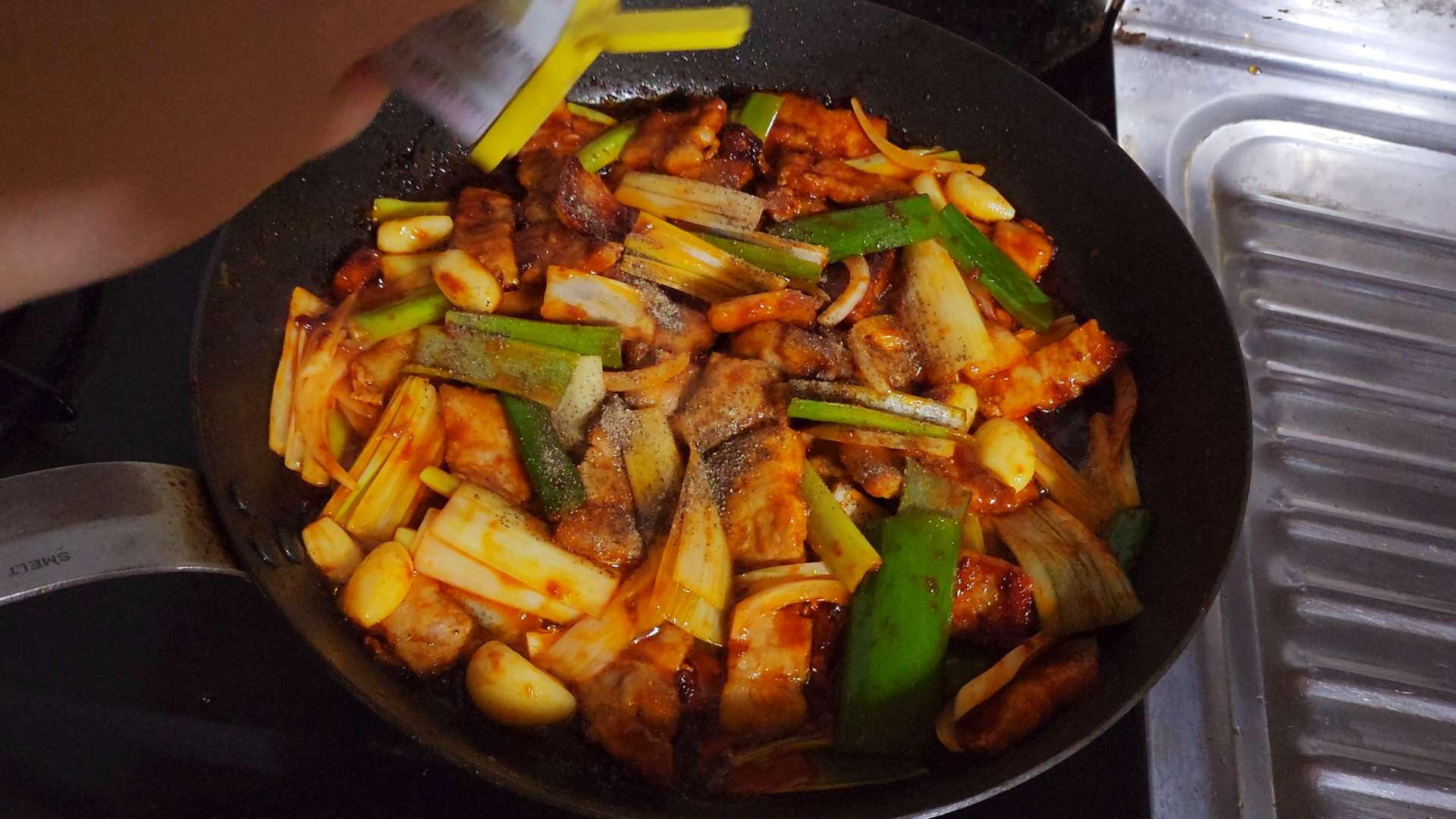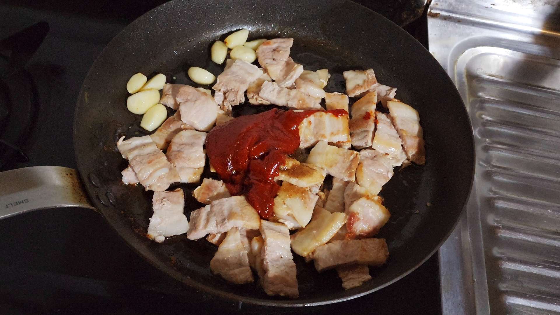 불을 끄고 설탕 1.5T, 진간장 1T, 고추장 듬뿍 2T를 넣고 강불로 불을 켜 볶아줍니다.