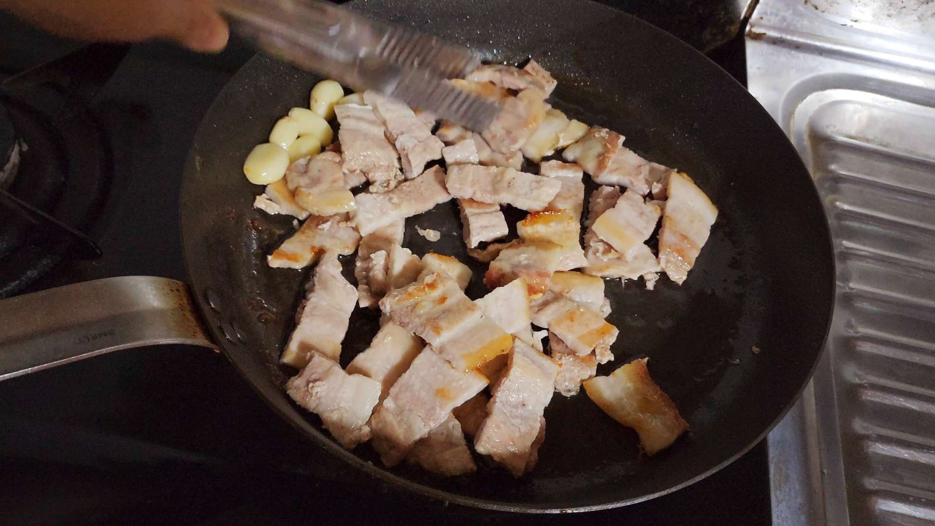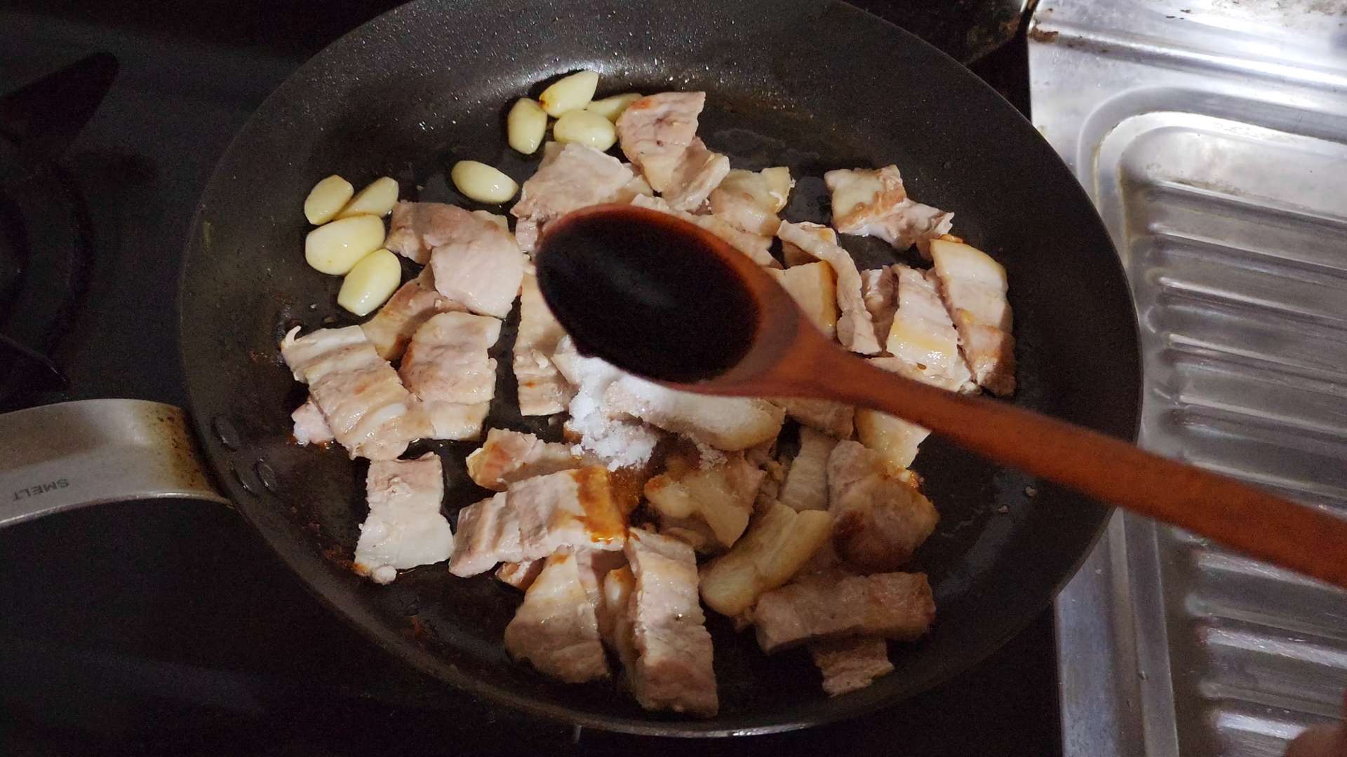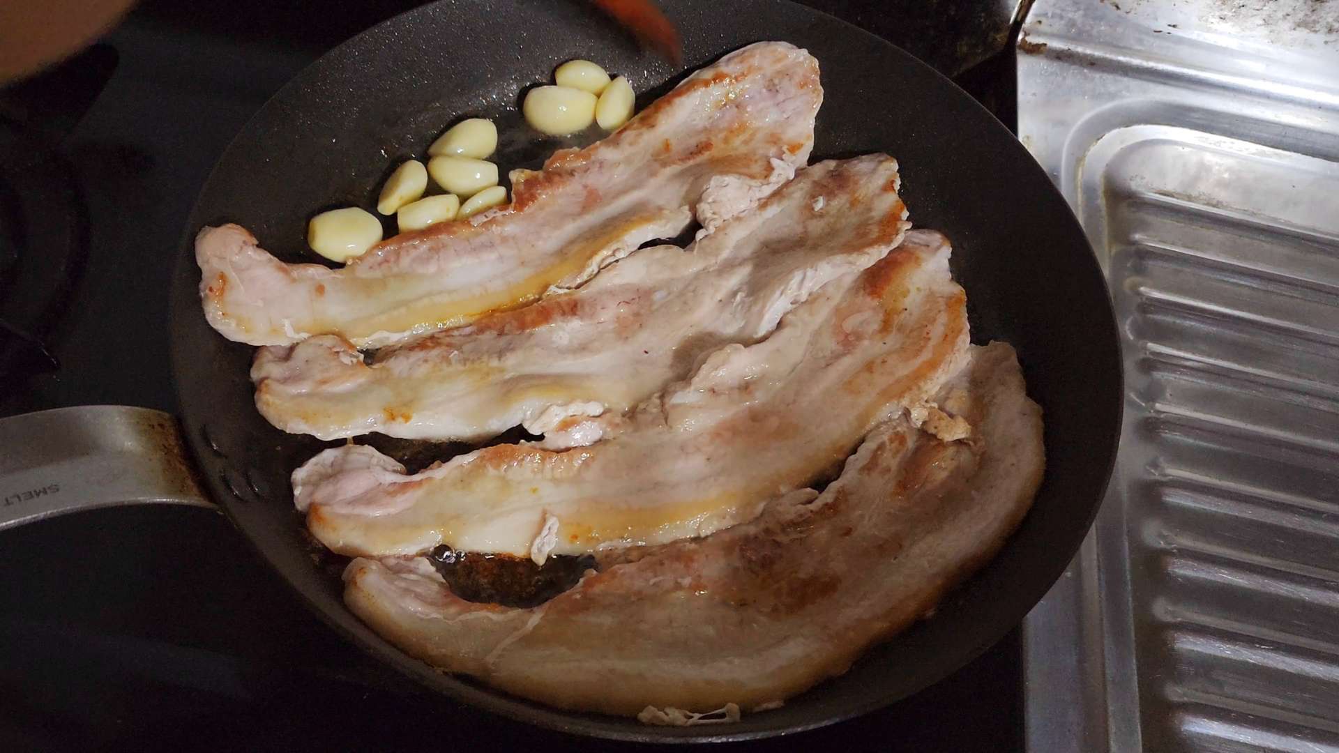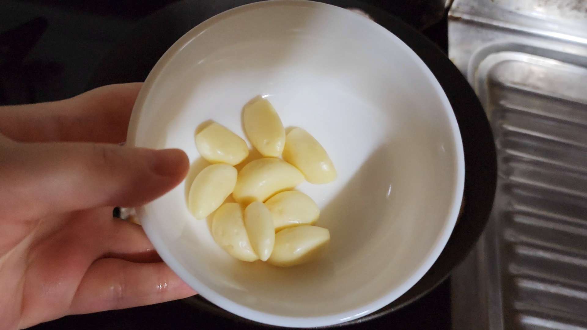 마늘 한 줌을 넣고 중불로 낮추고 구워줍니다.