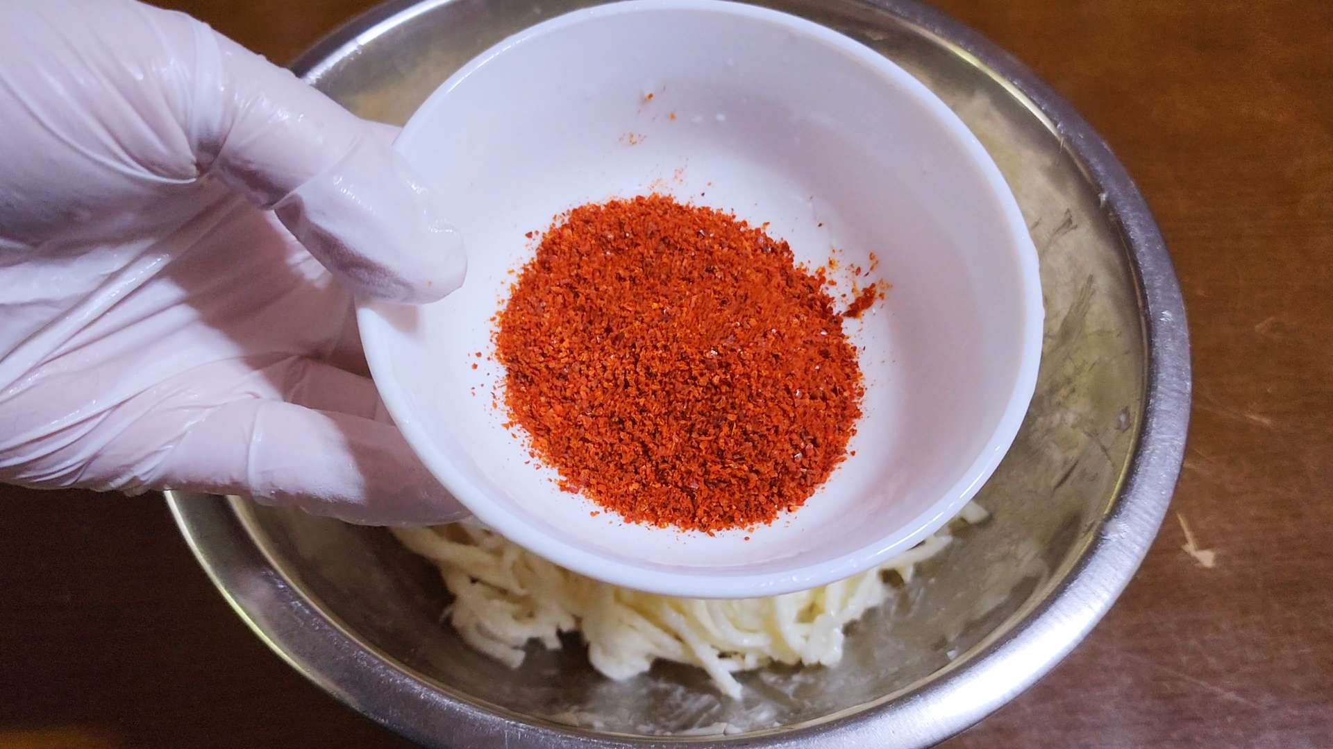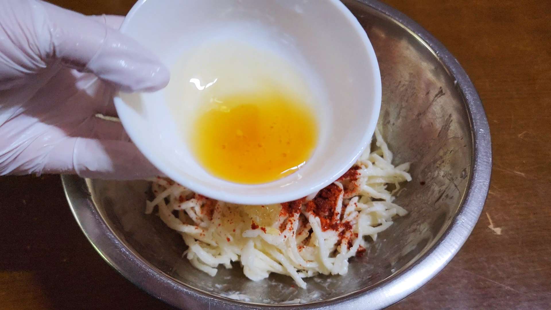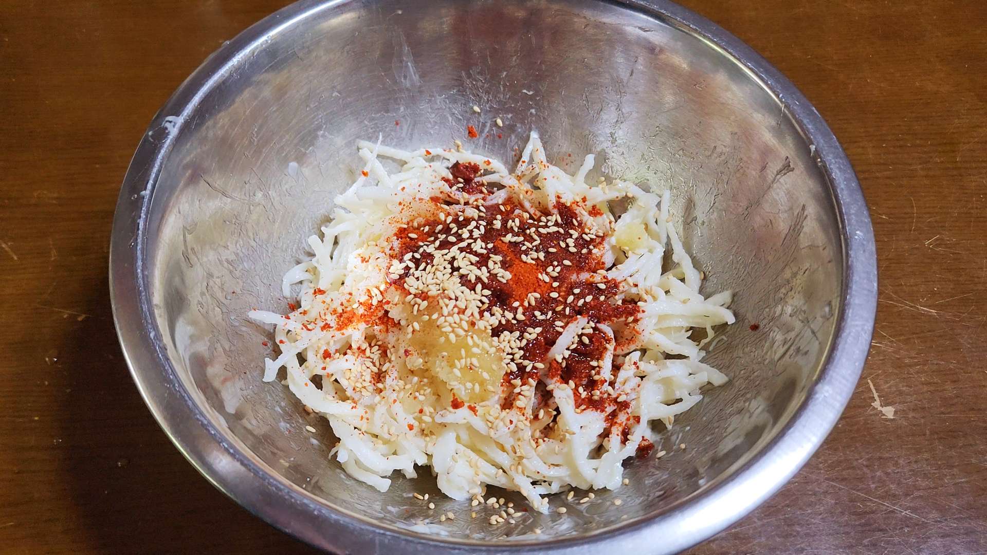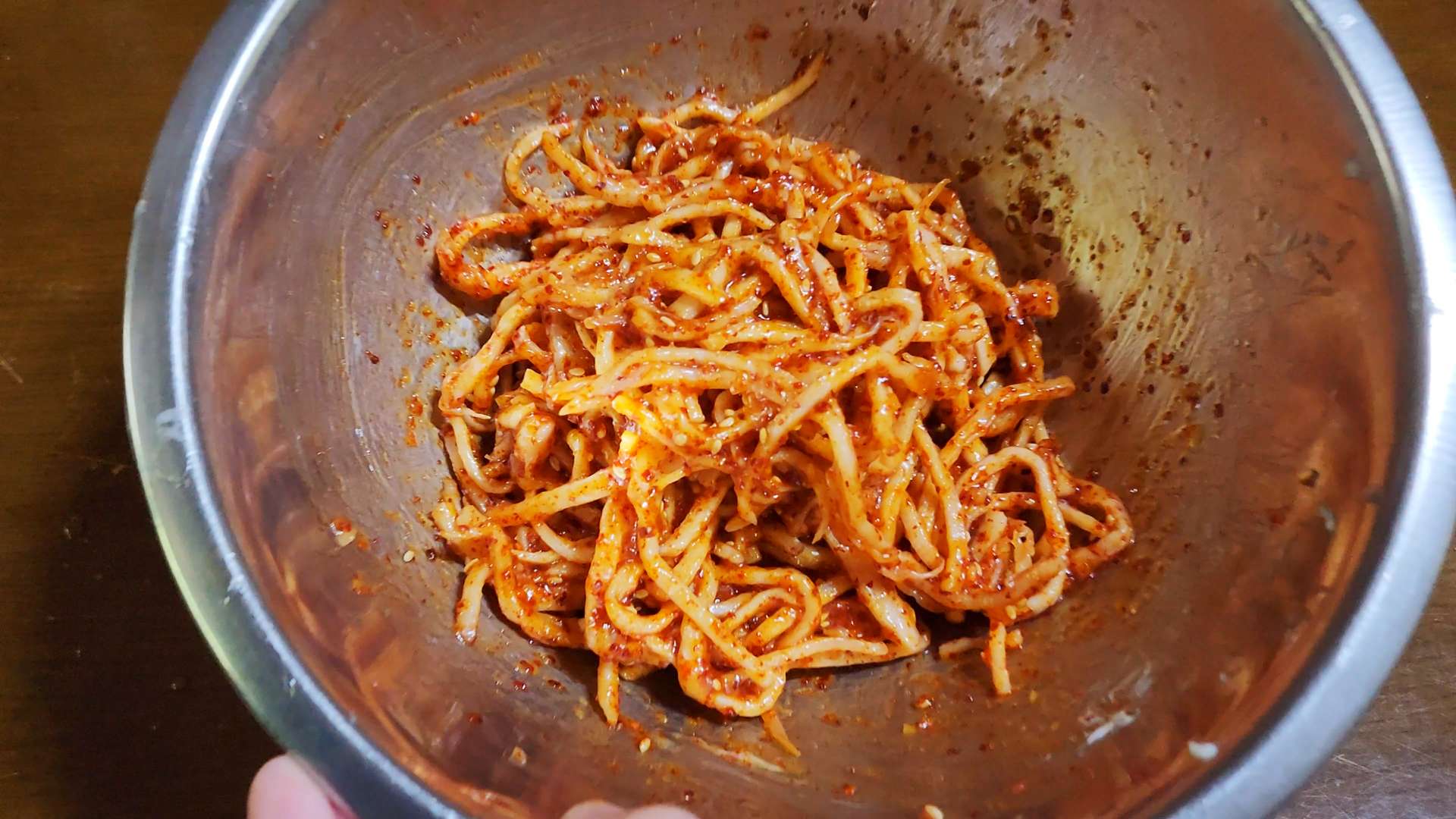 다진마늘 1T, 설탕 2T, 고춧가루 3T, 물엿 4T, 국간장 1T, 참기름 2T, 통깨를 넣고 무쳐줍니다.