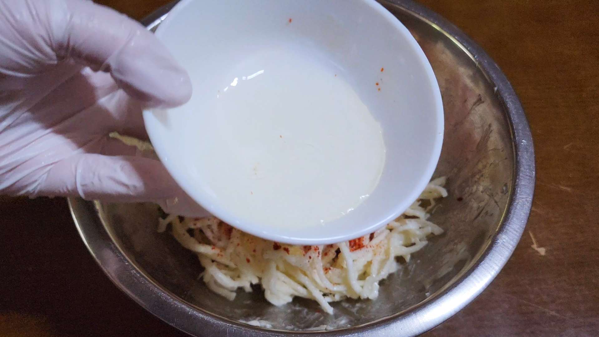 진미채 200g, 마요네즈 3T를 버무려 15분 정도 재워줍니다.