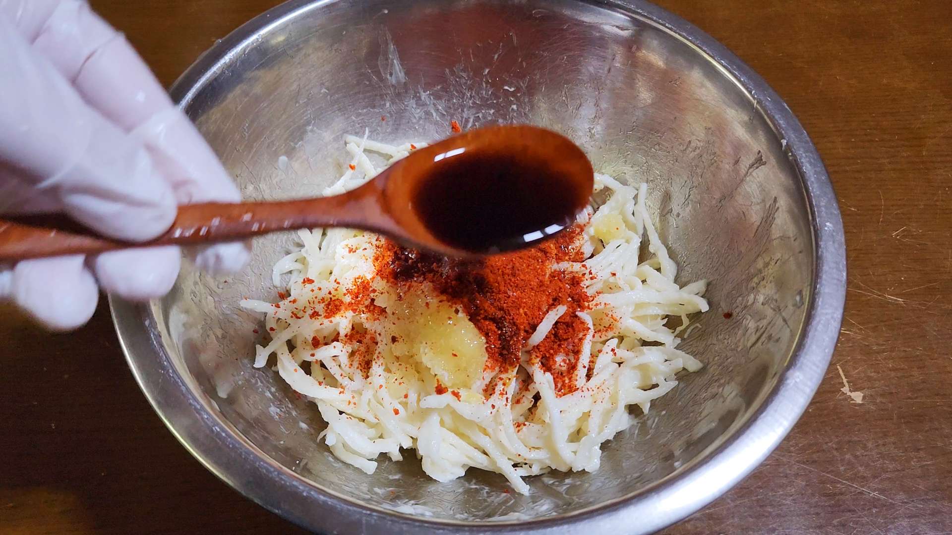 다진마늘 1T, 설탕 2T, 고춧가루 3T, 물엿 4T, 국간장 1T, 참기름 2T, 통깨를 넣고 무쳐줍니다.