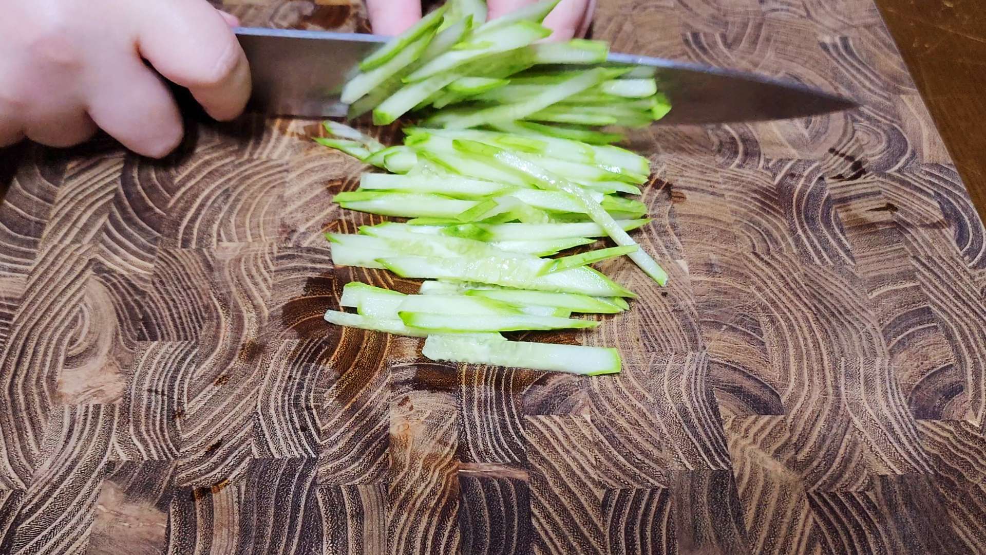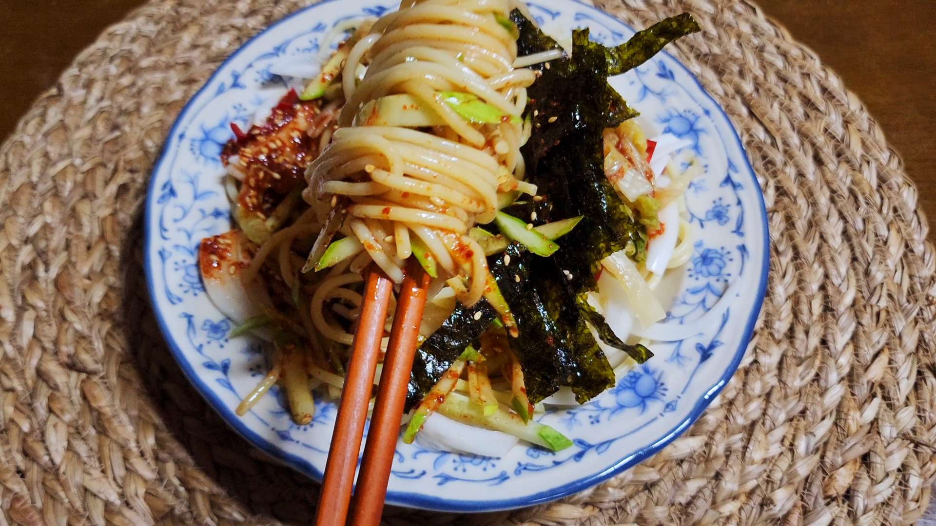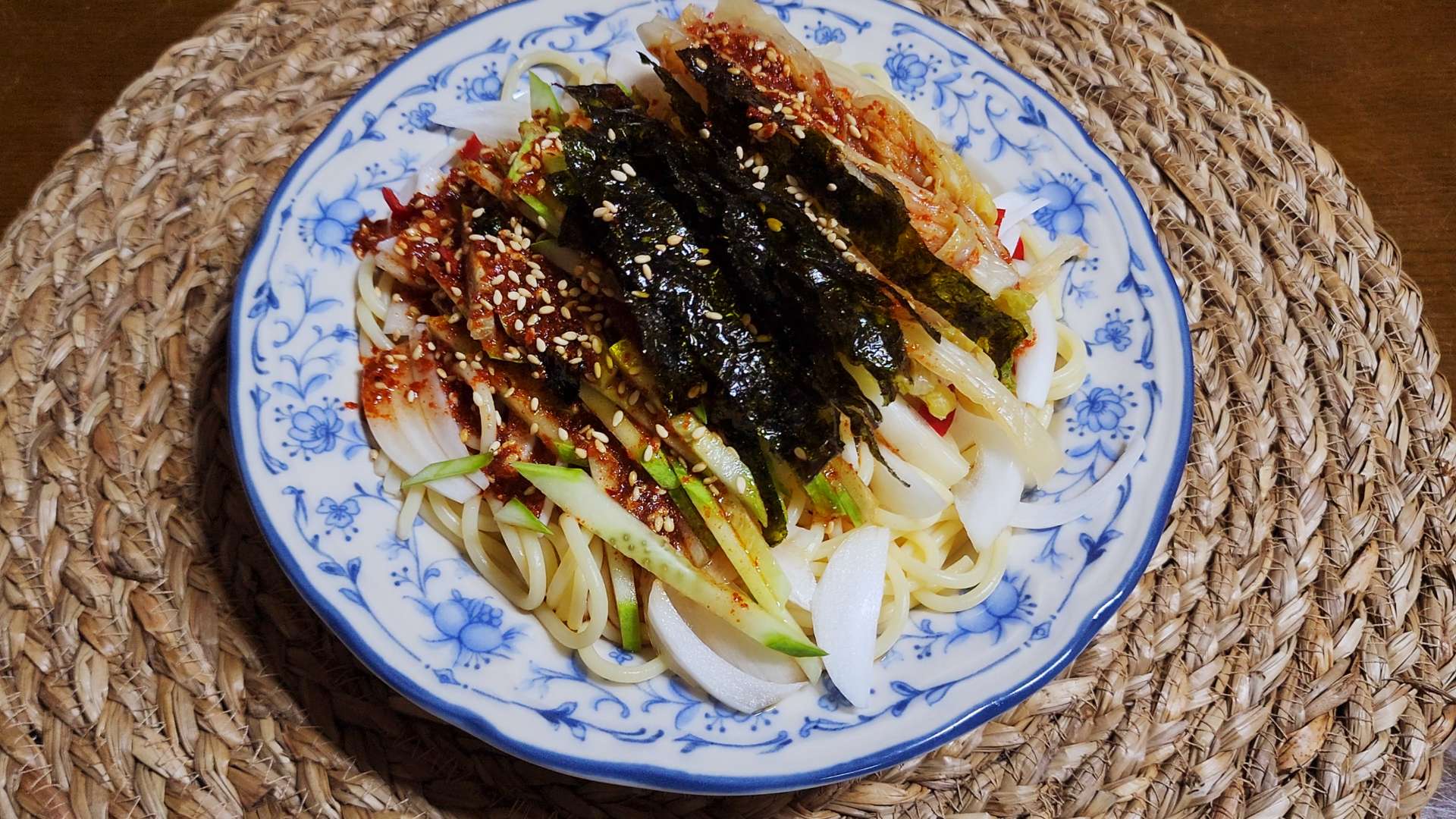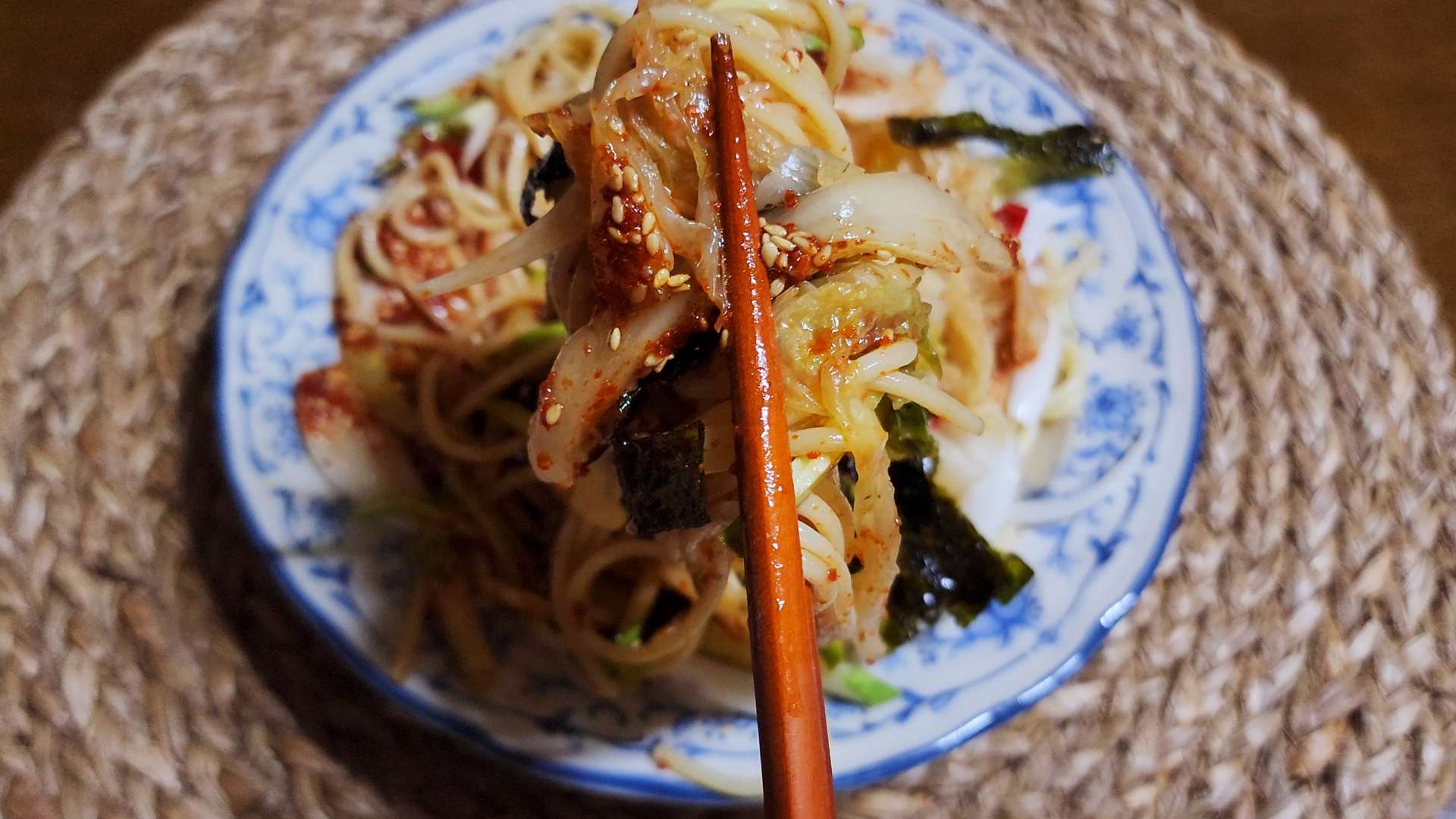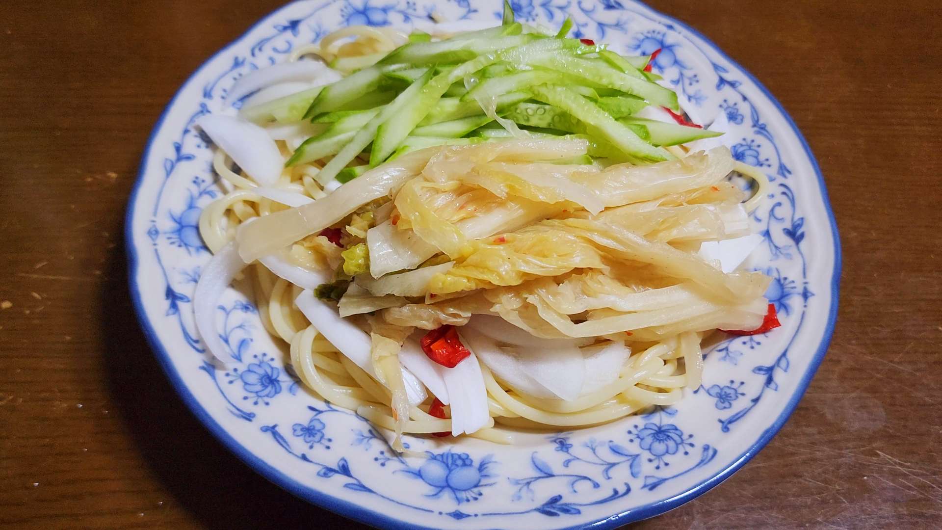 재료: 파스타면 1인분, 신김치 3장, 오이 1/3개,