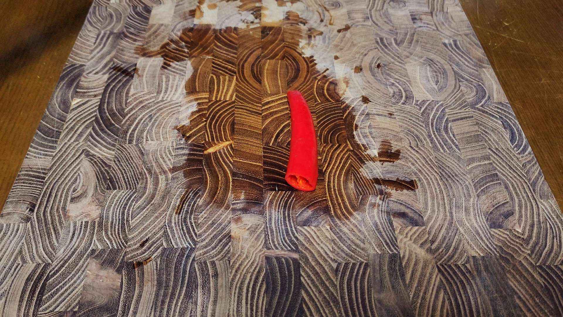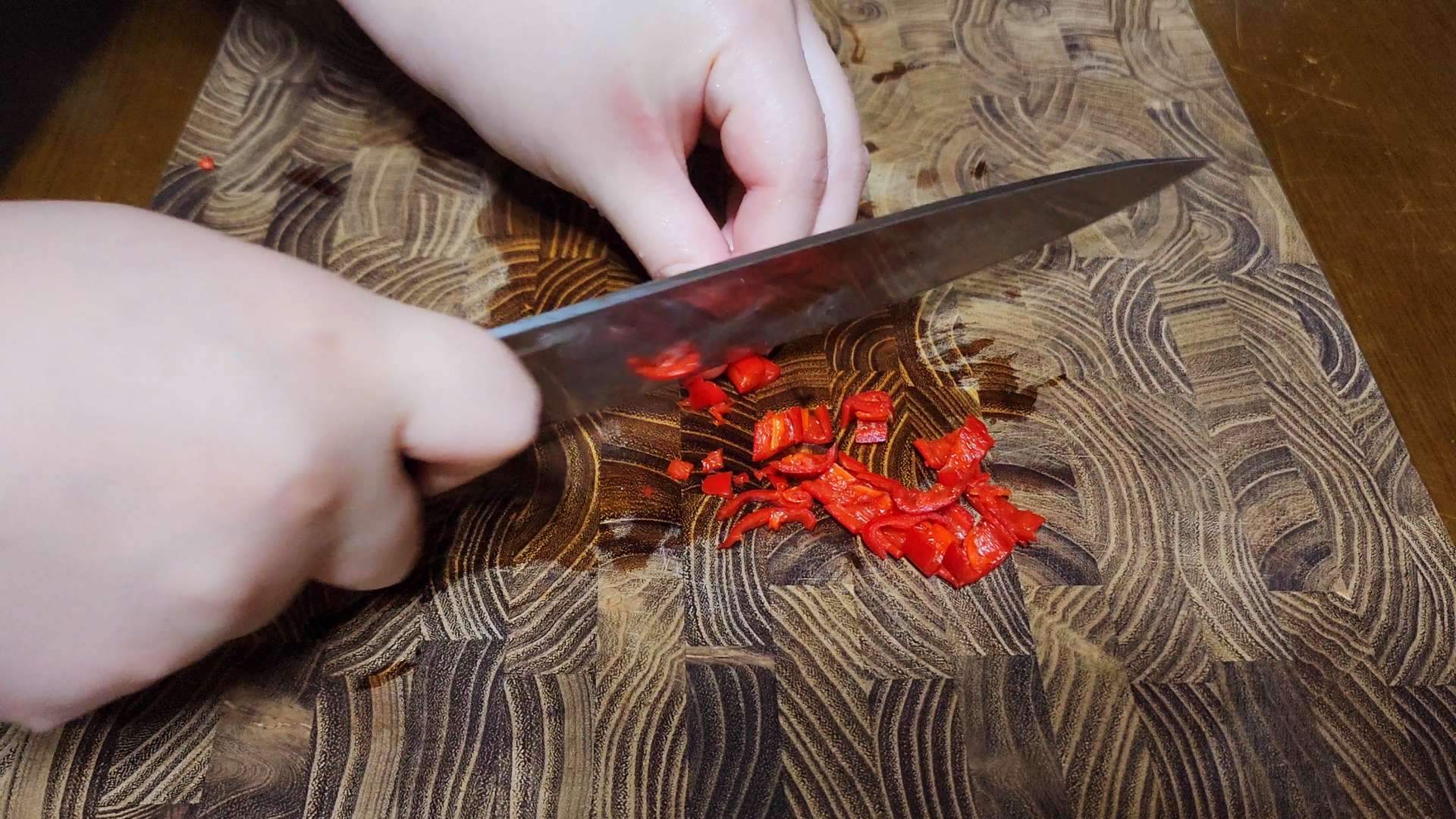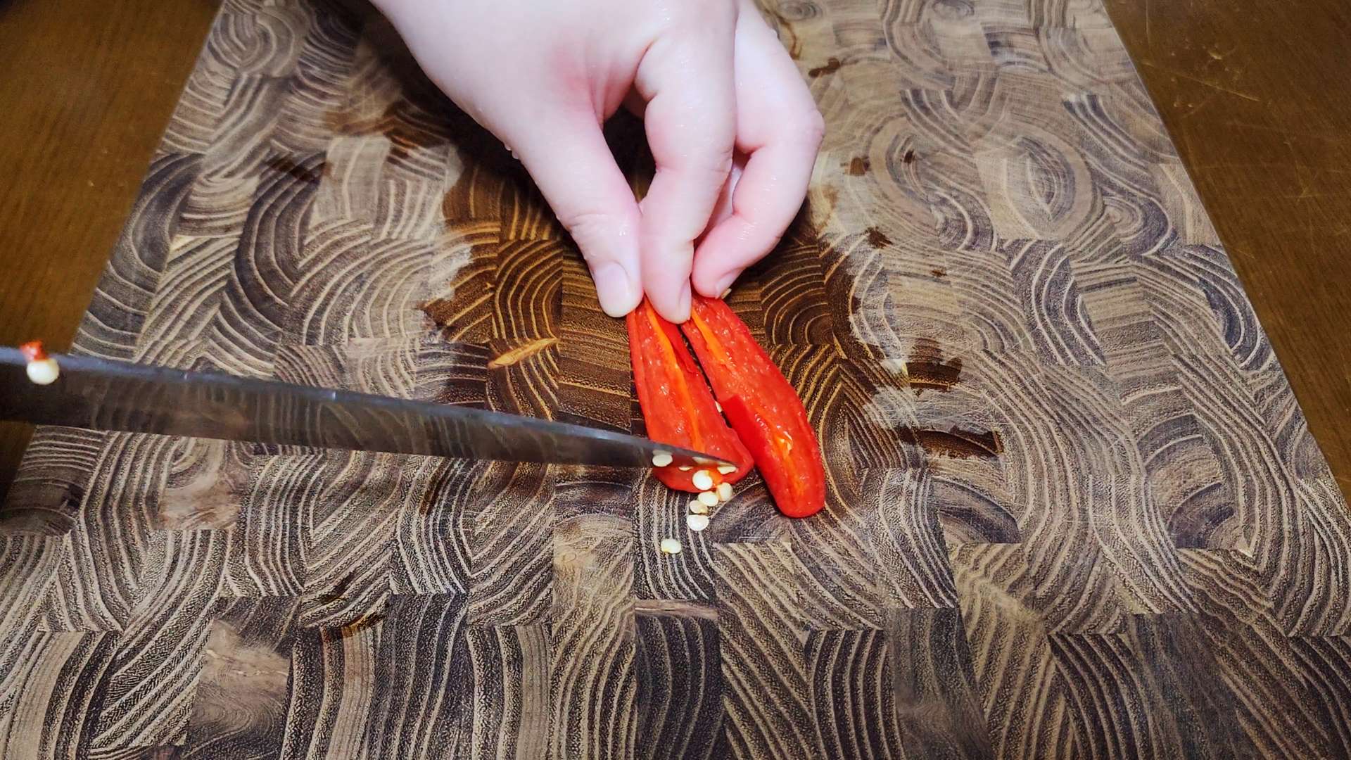홍고추는 씨를 제거하고 잘게 썰어줍니다.