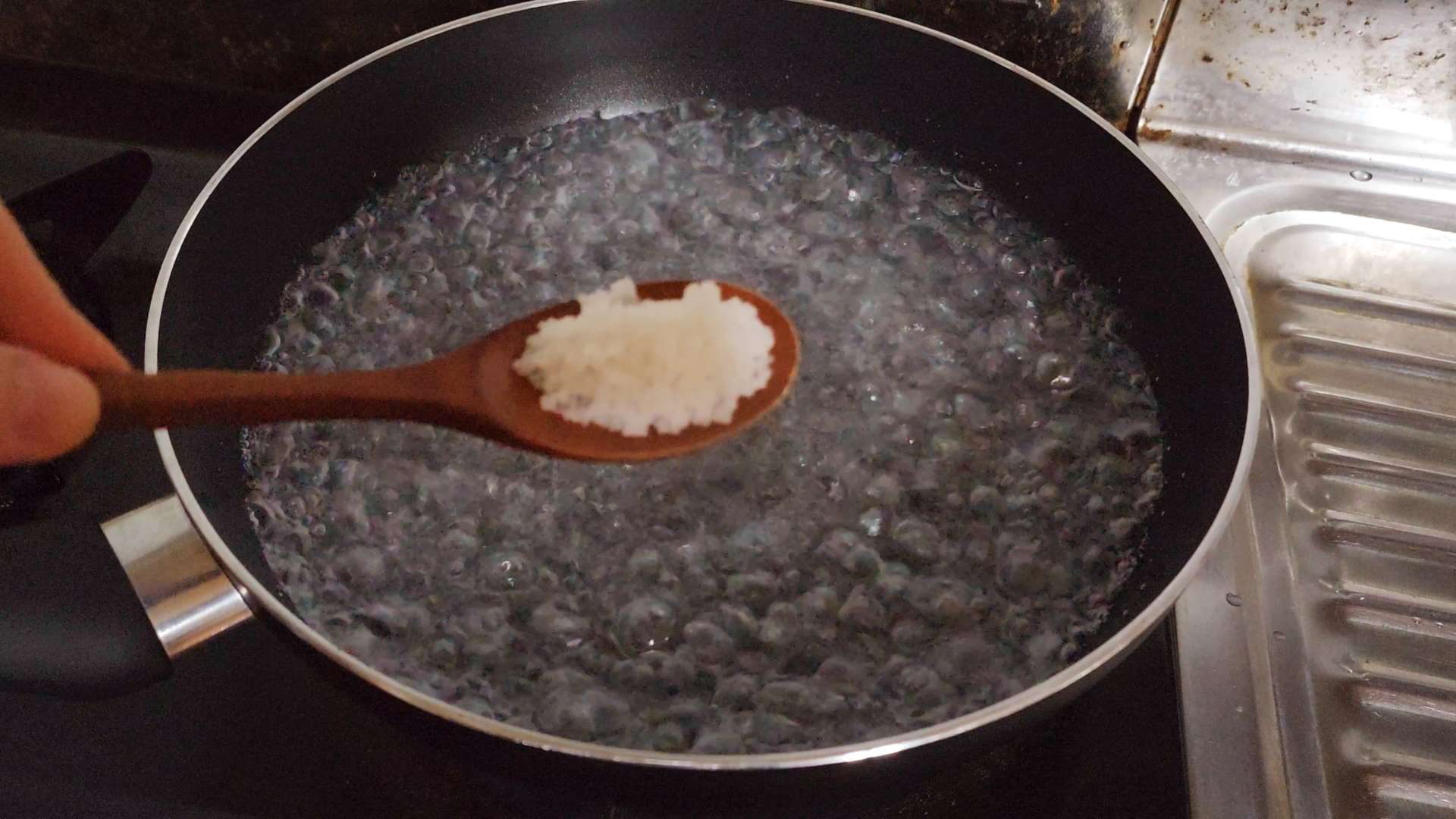 팬에 물 1L, 굵은소금 0.5T 넣고 끓여줍니다.