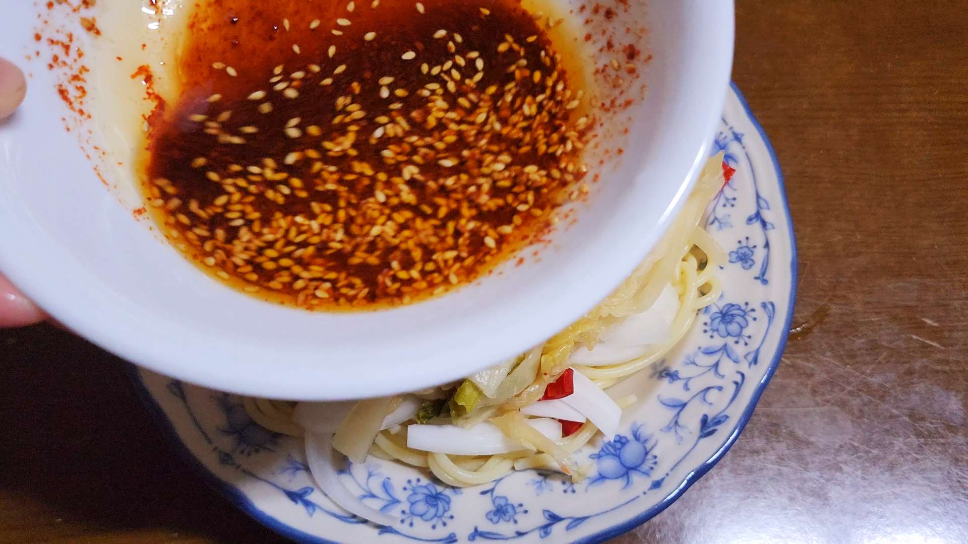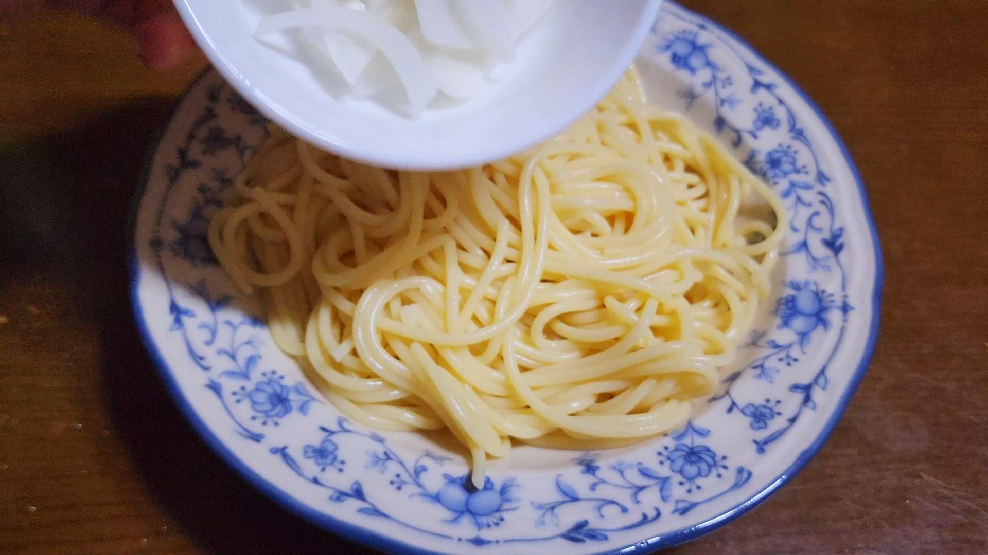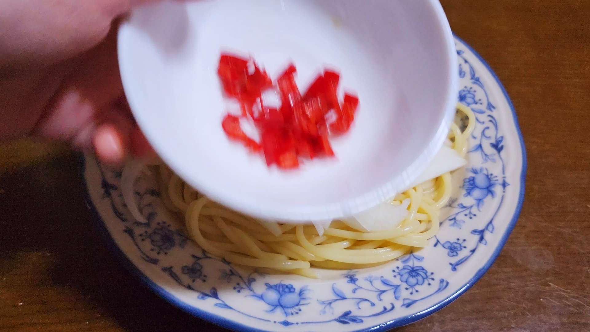 그릇에 면을 담고 양파, 홍고추를 뿌려줍니다.