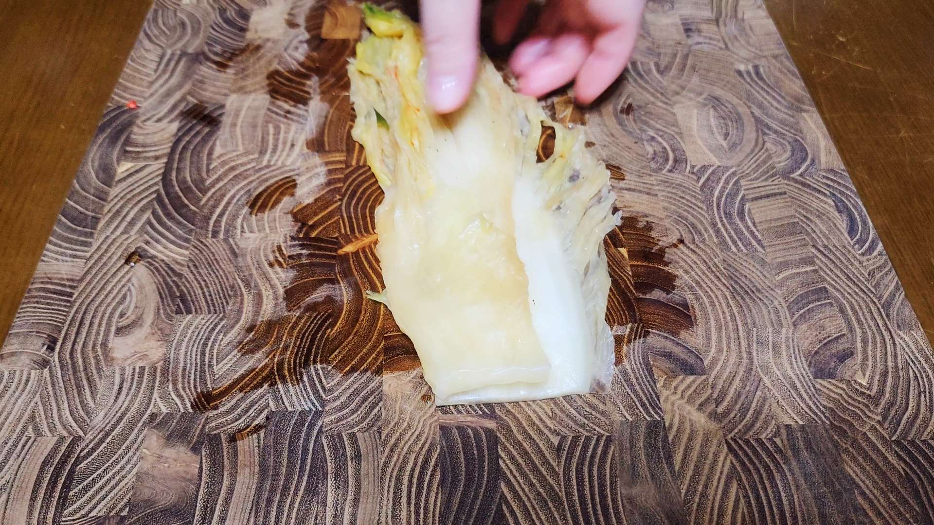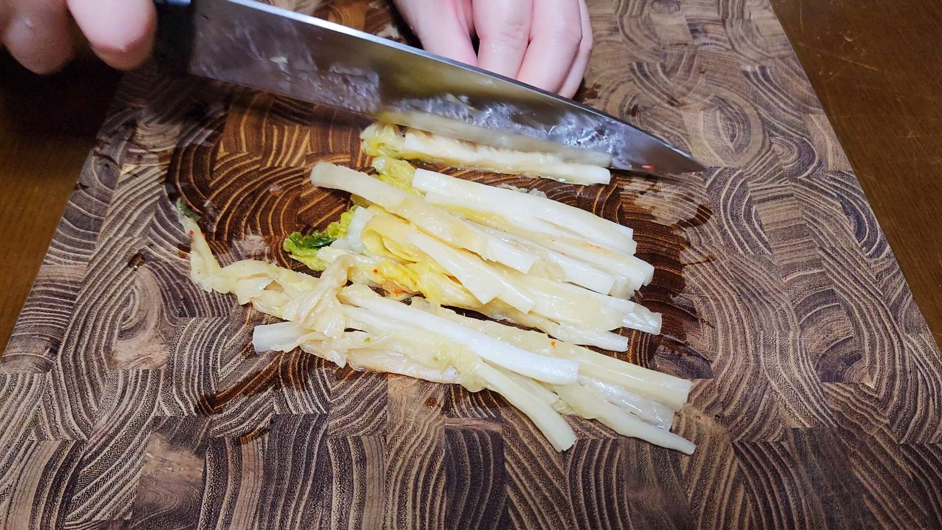 신김치 3장은 찬물에 헹구고 세로로 길게 썰어줍니다.
