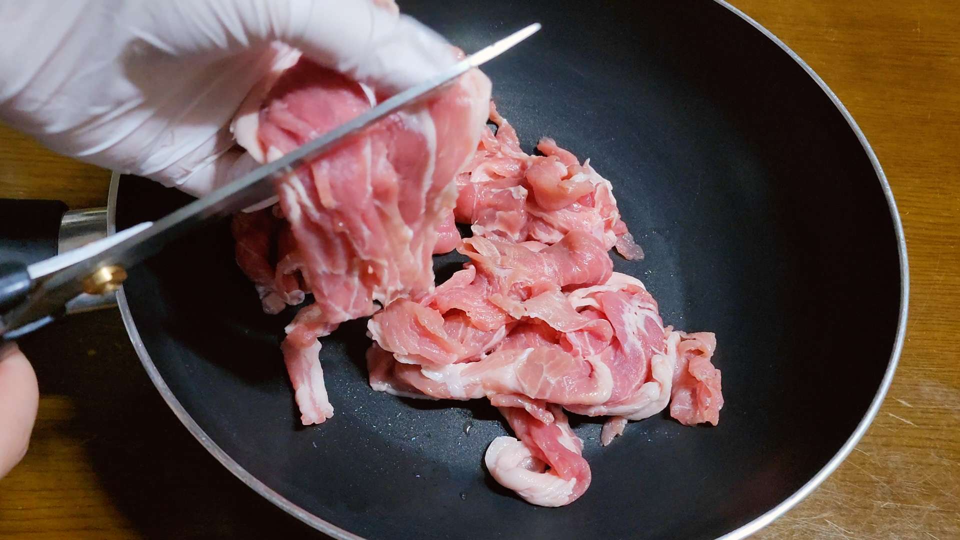 돼지 앞다리살은 가위로 먹기 좋은 크기로 잘라줍니다.