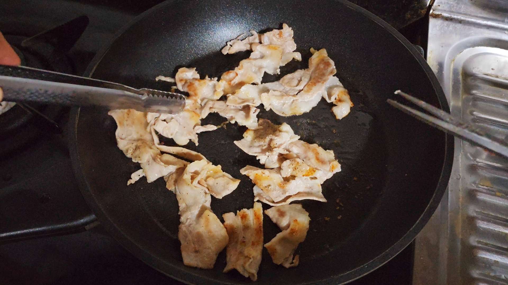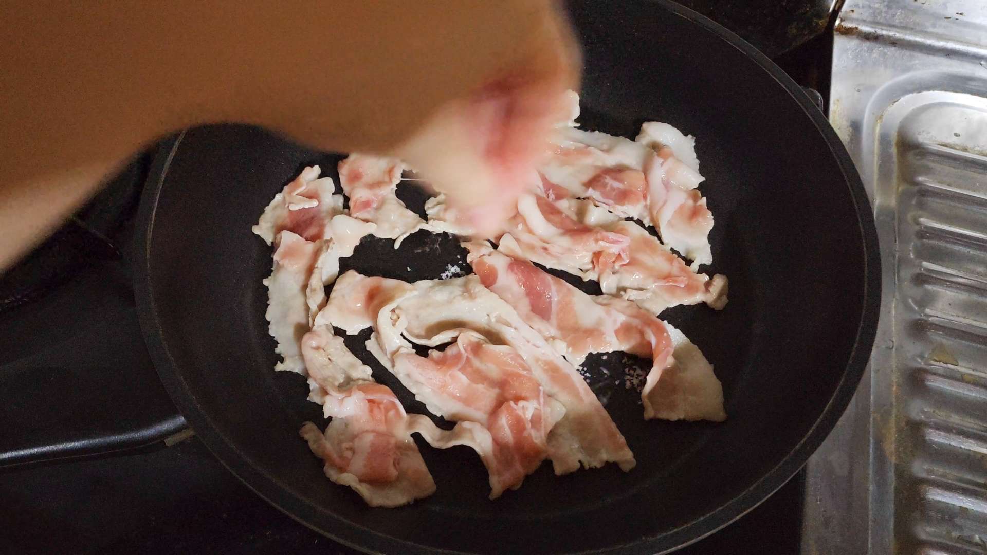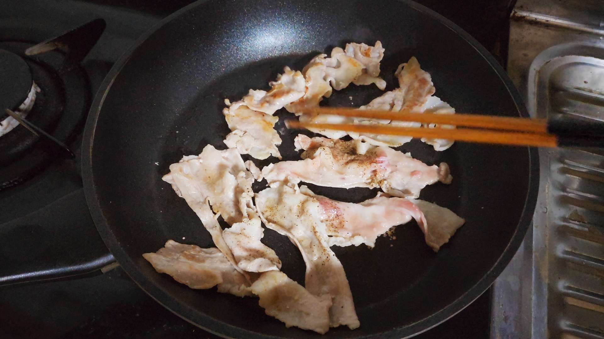 중불로 달군 팬에 대패삼겹살을 넣고 소금, 후추를 뿌리고 대패삼겹살을 펼쳐가며 노릇하게 구워줍니다.