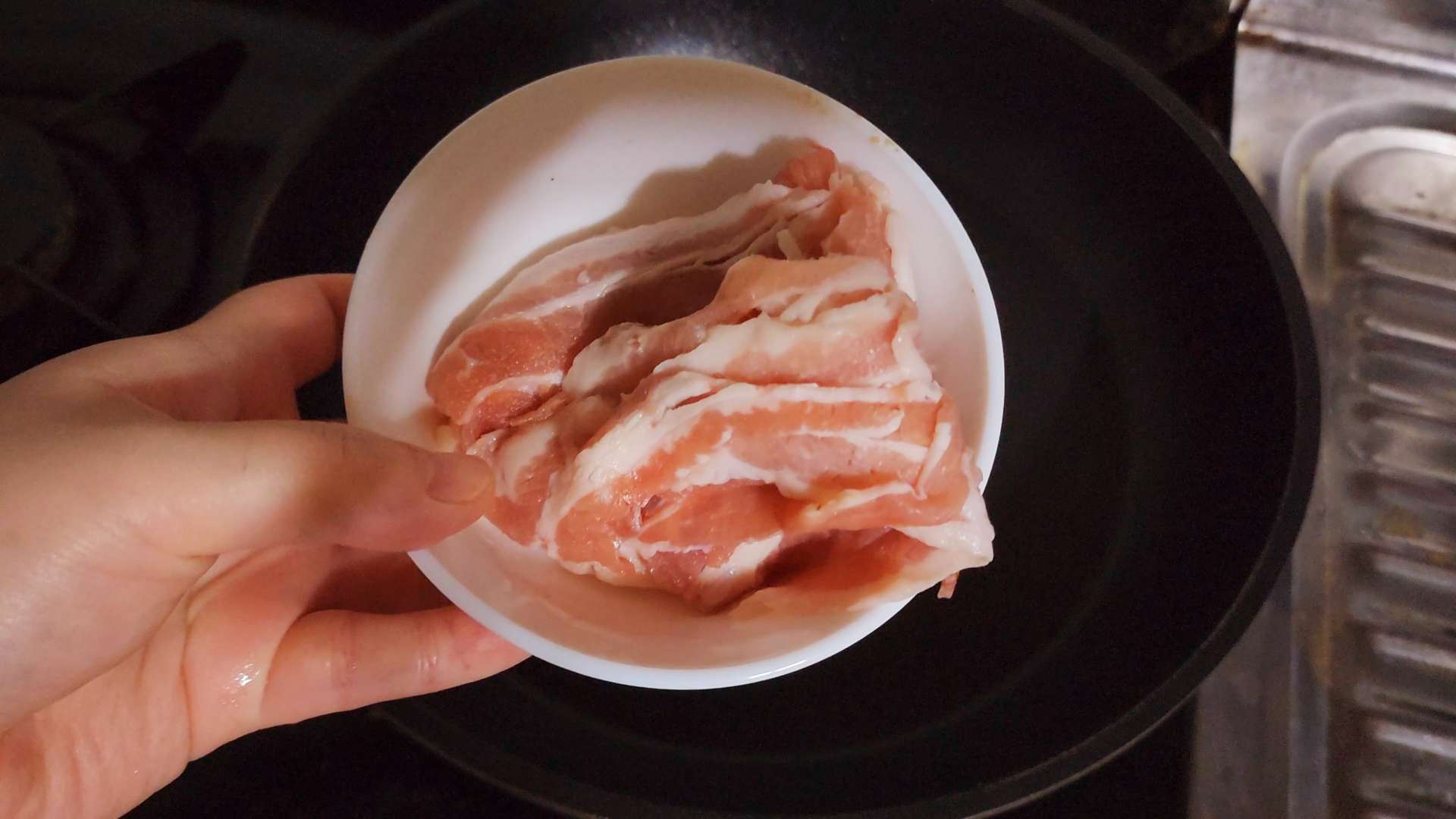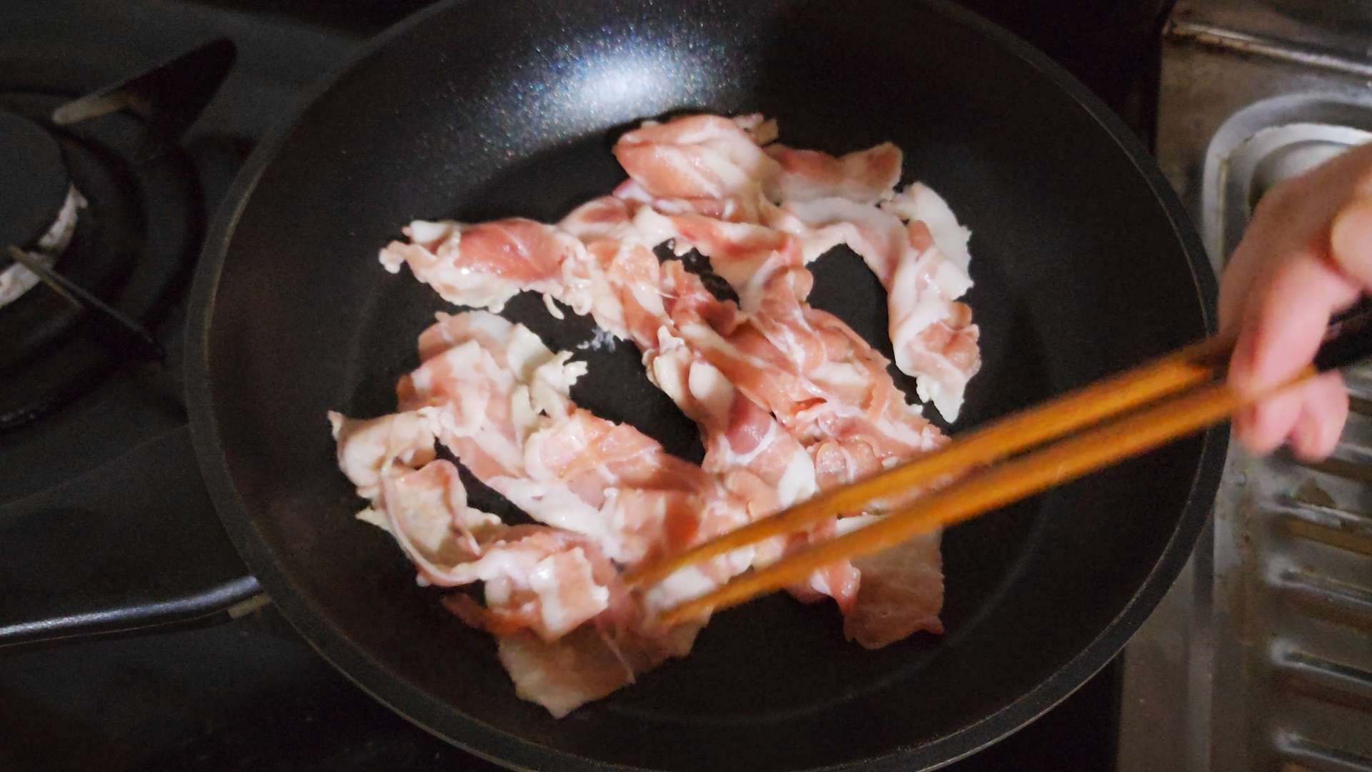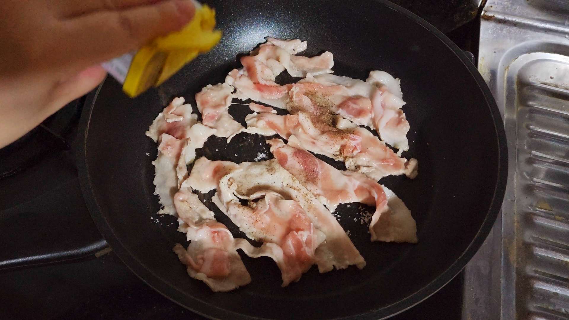 중불로 달군 팬에 대패삼겹살을 넣고 소금, 후추를 뿌리고 대패삼겹살을 펼쳐가며 노릇하게 구워줍니다.