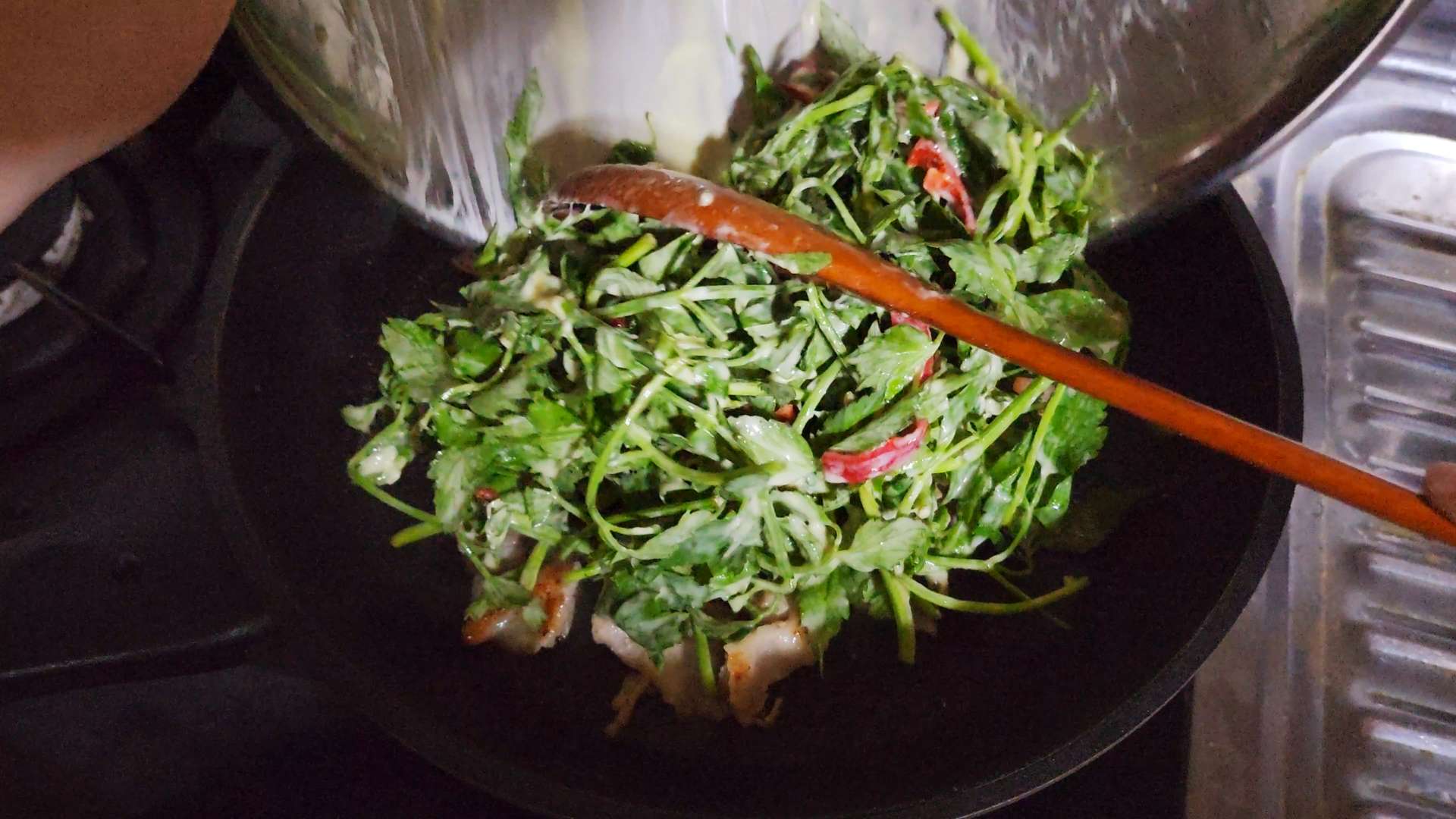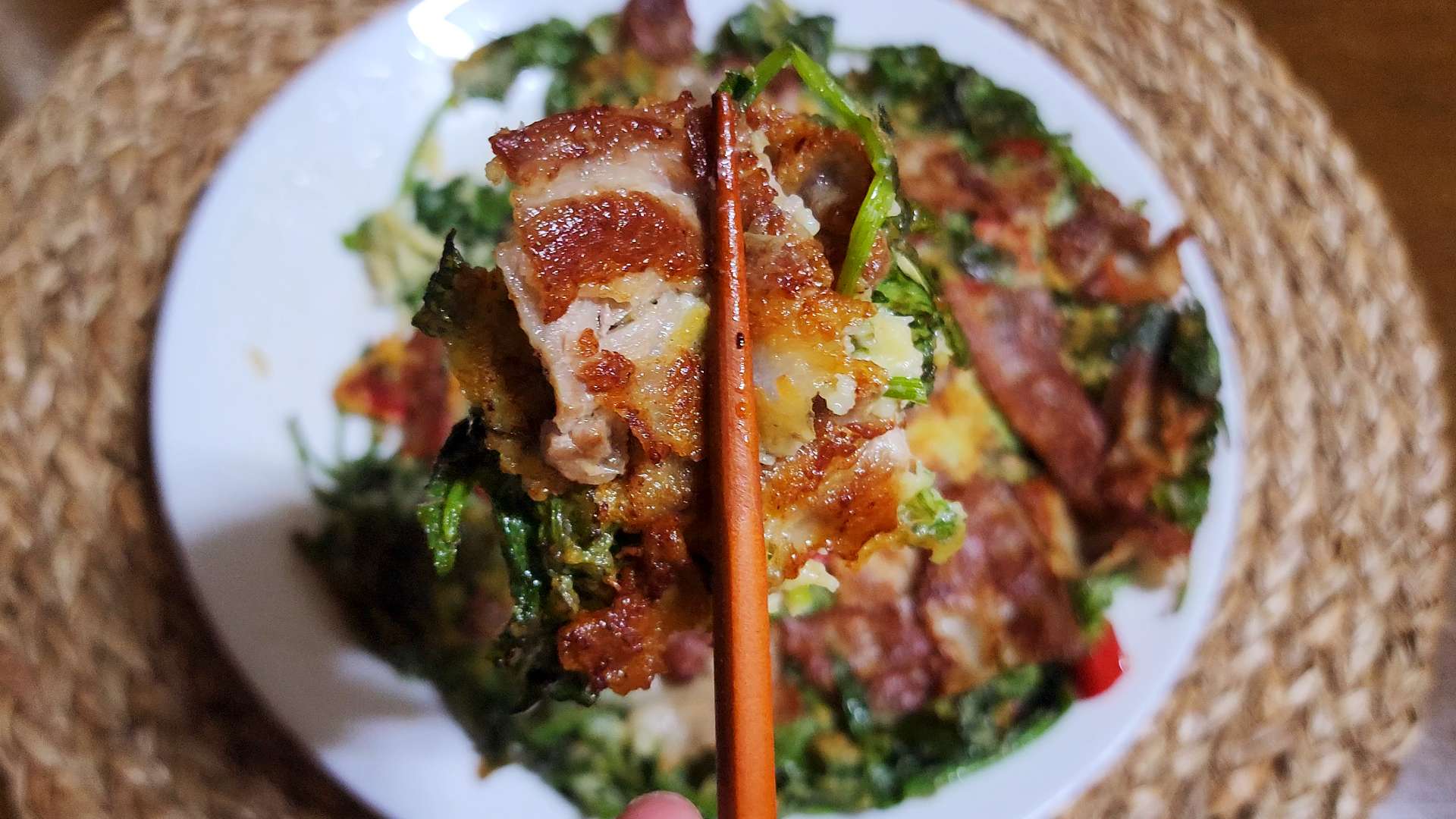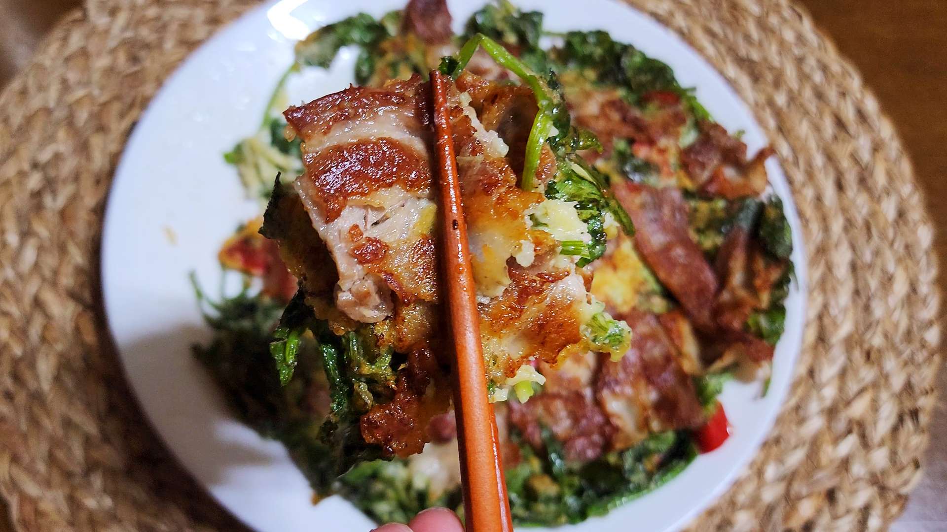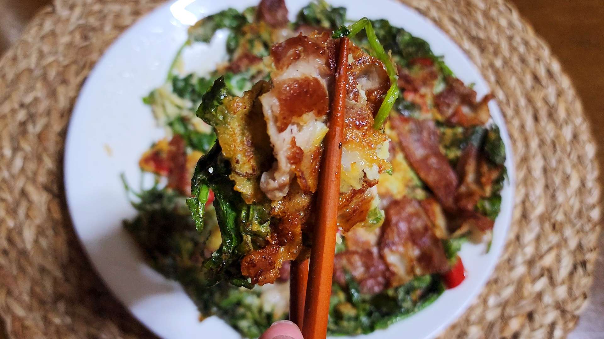 고기 위에 미나리 반죽을 올려 꾹꾹 눌러가며 고기 기름에 튀기듯이 바삭하게 구워줍니다.