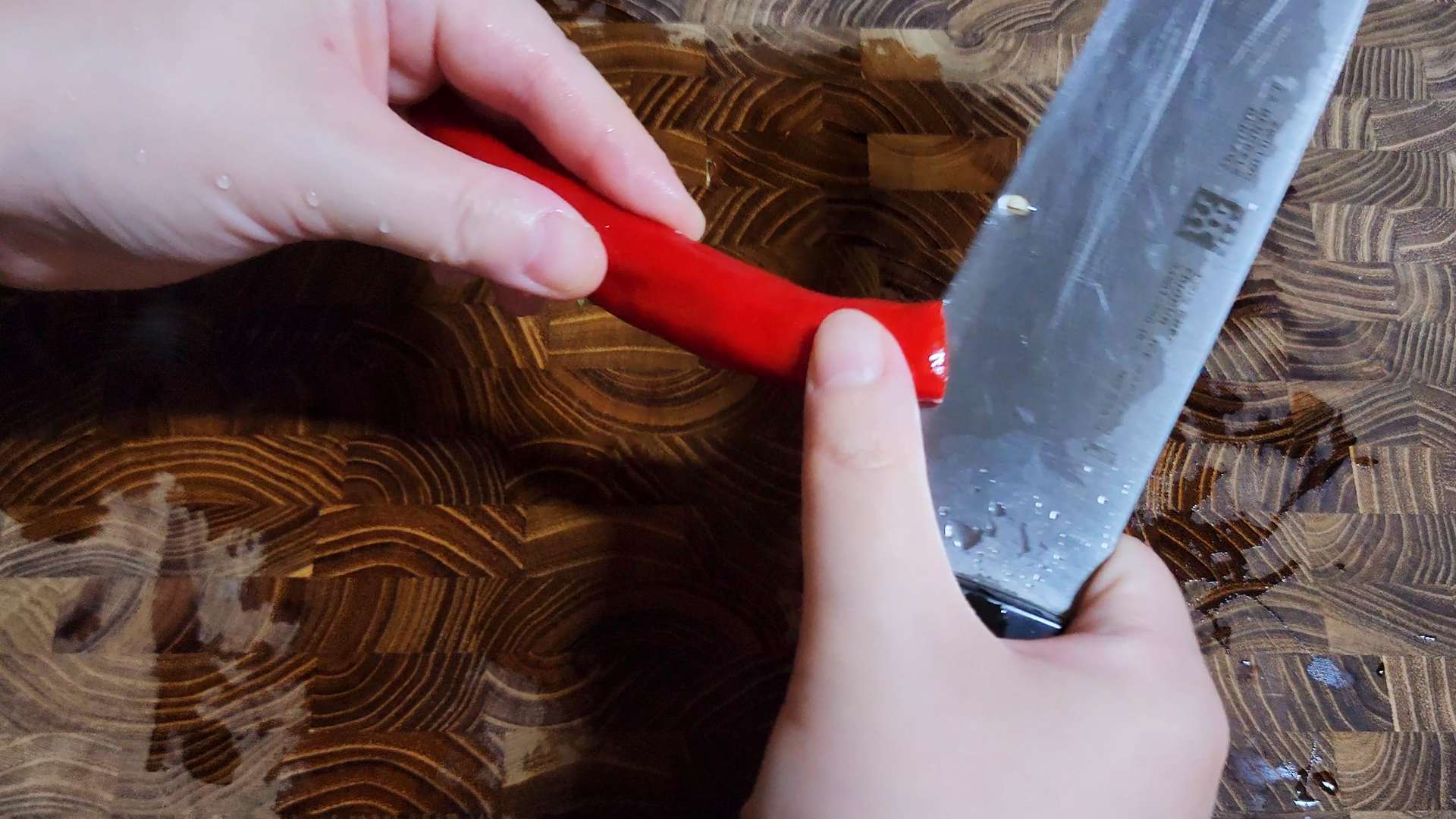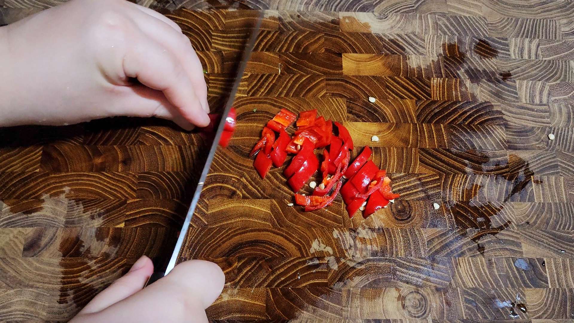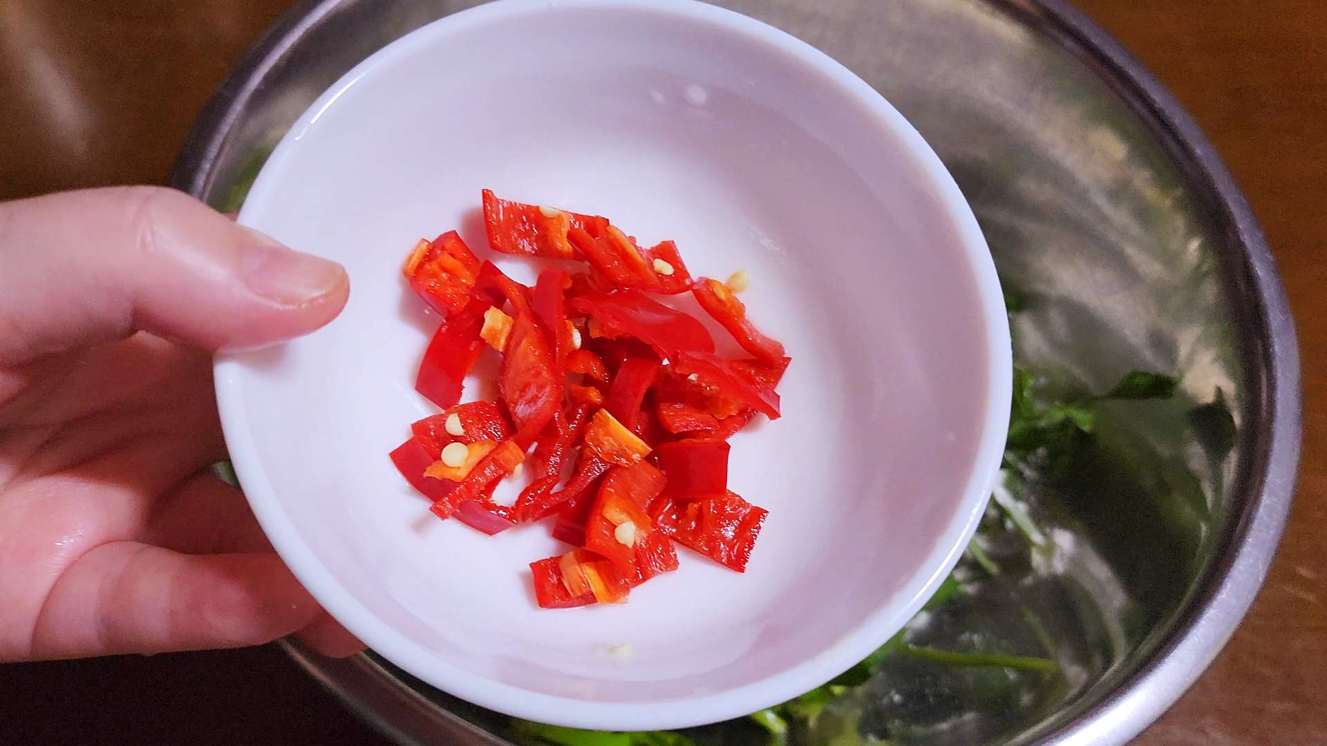 홍고추는 반으로 자르고 송송 썰어줍니다.