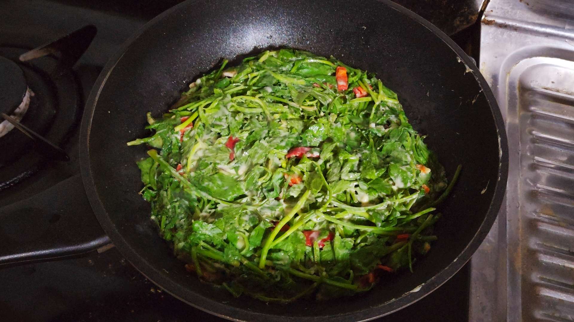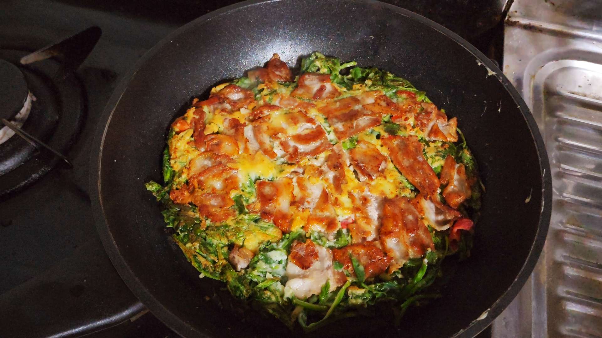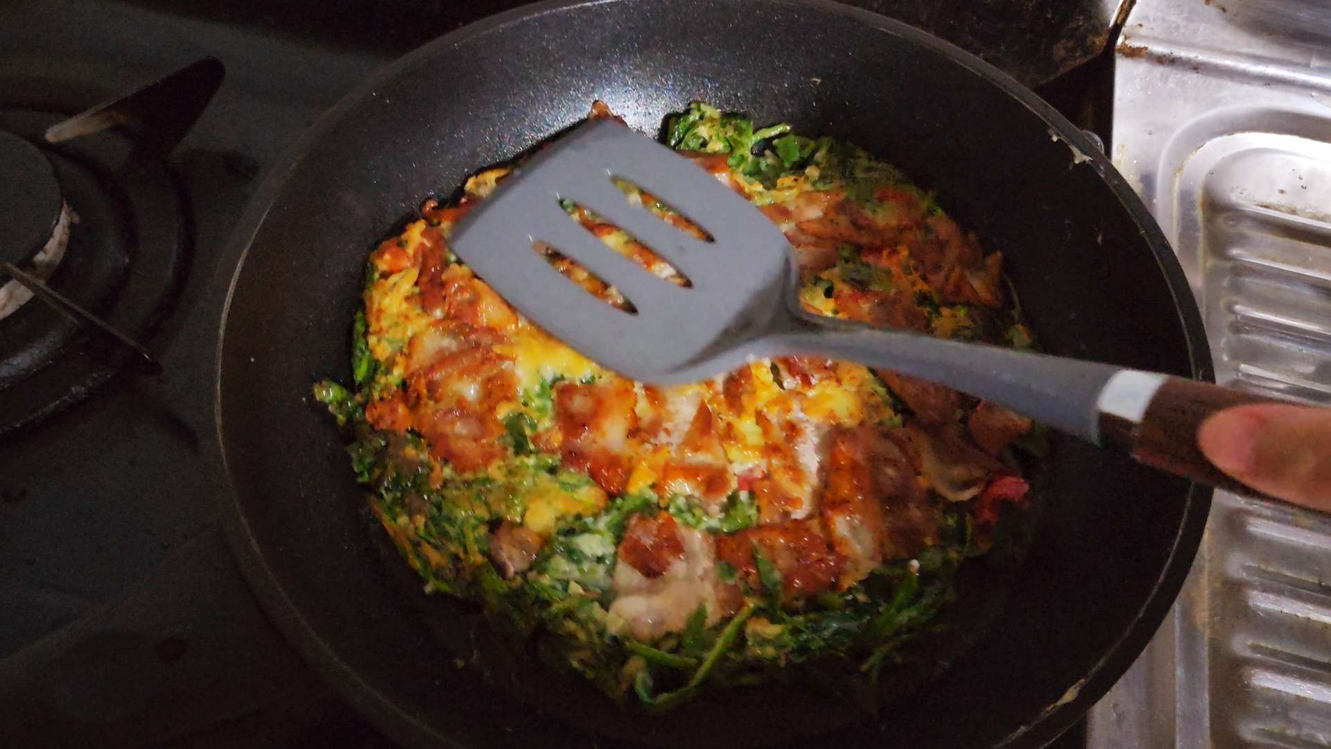 미나리 반죽이 익으면 불을 약불로 줄이고 고기가 떨어지지 않게 뒤집어줍니다.
