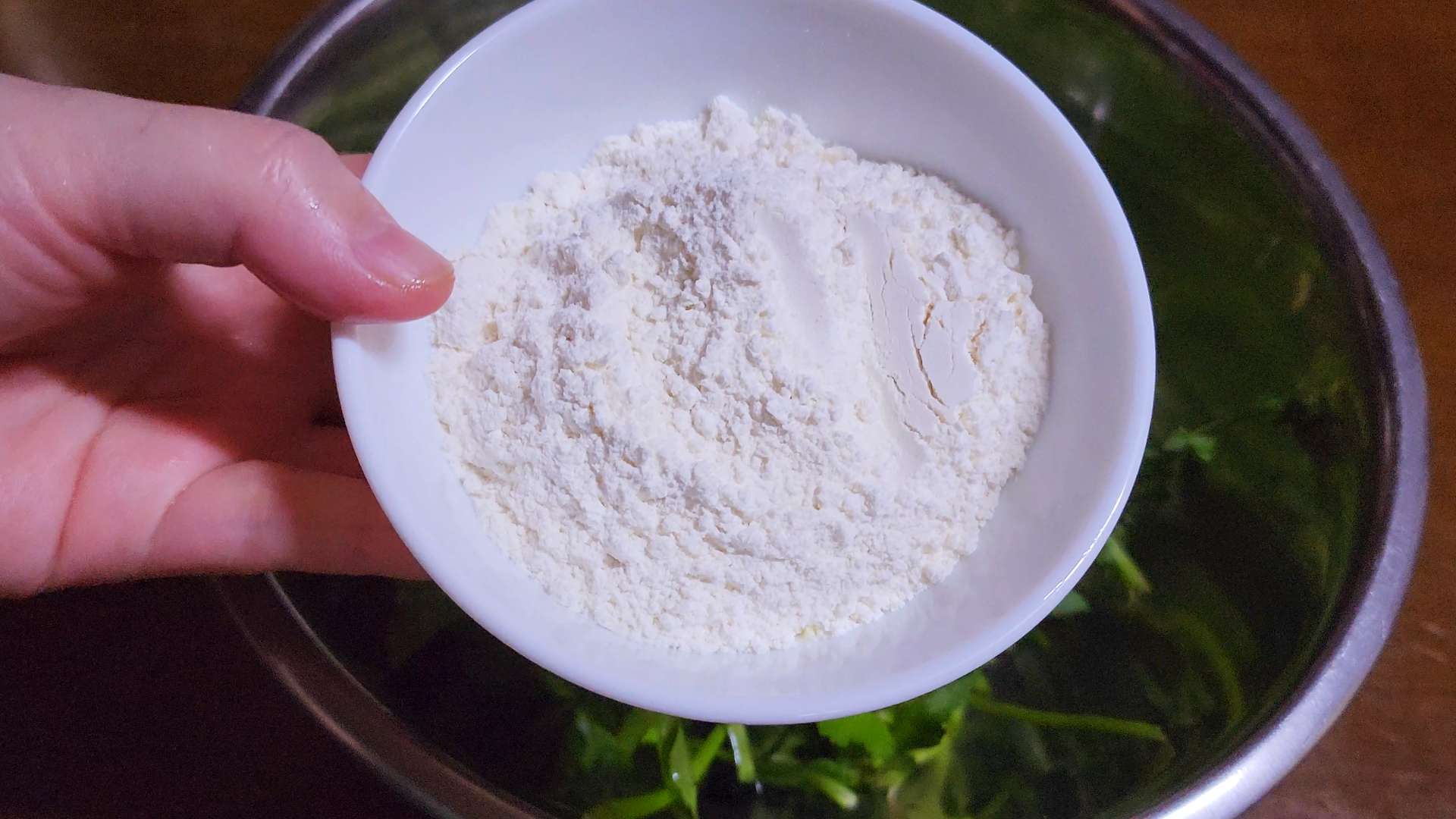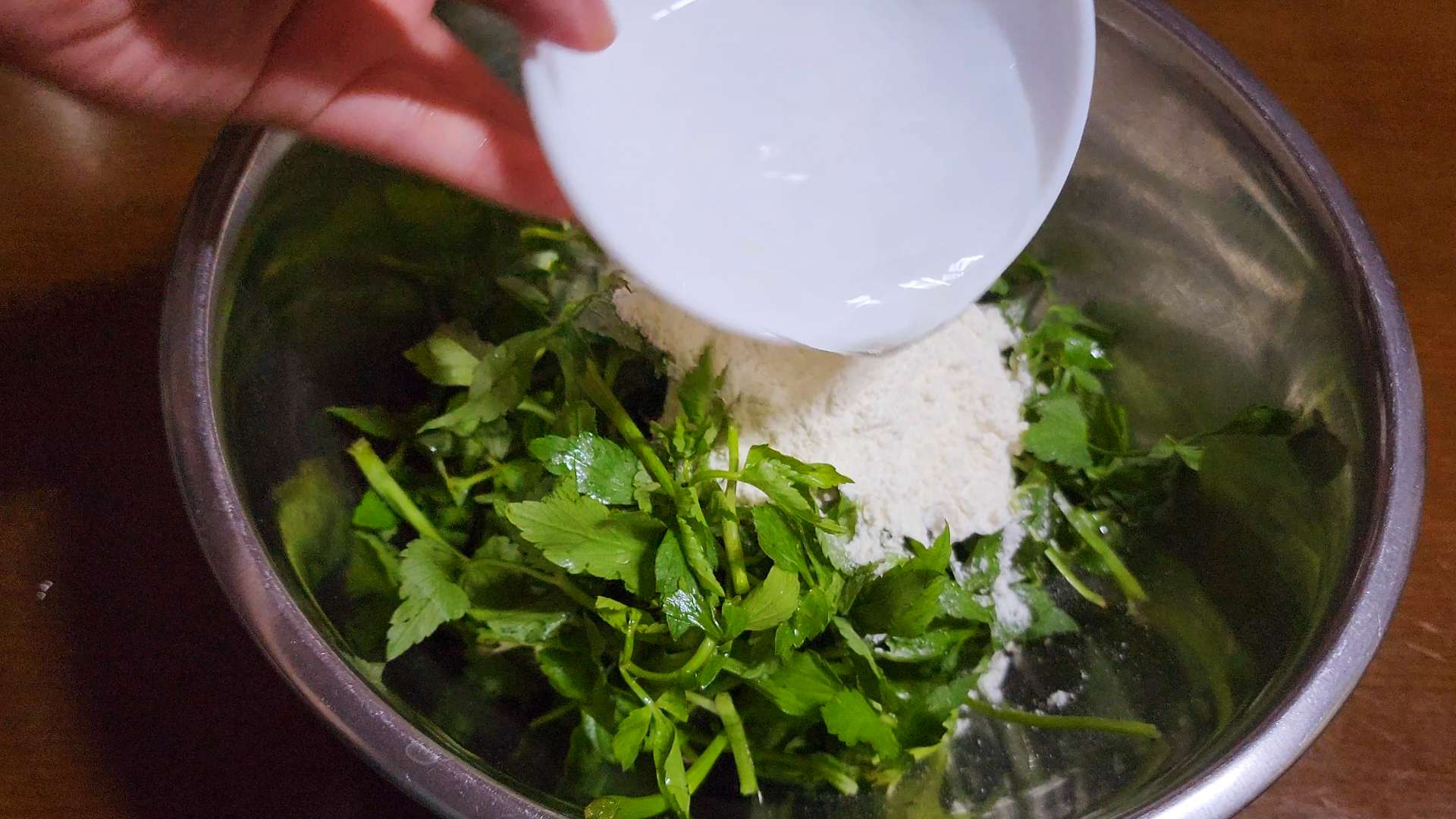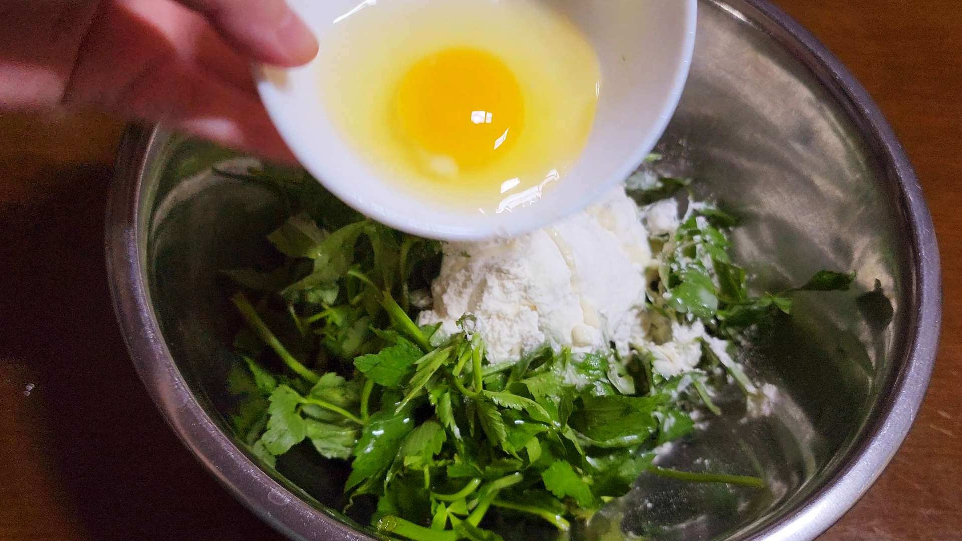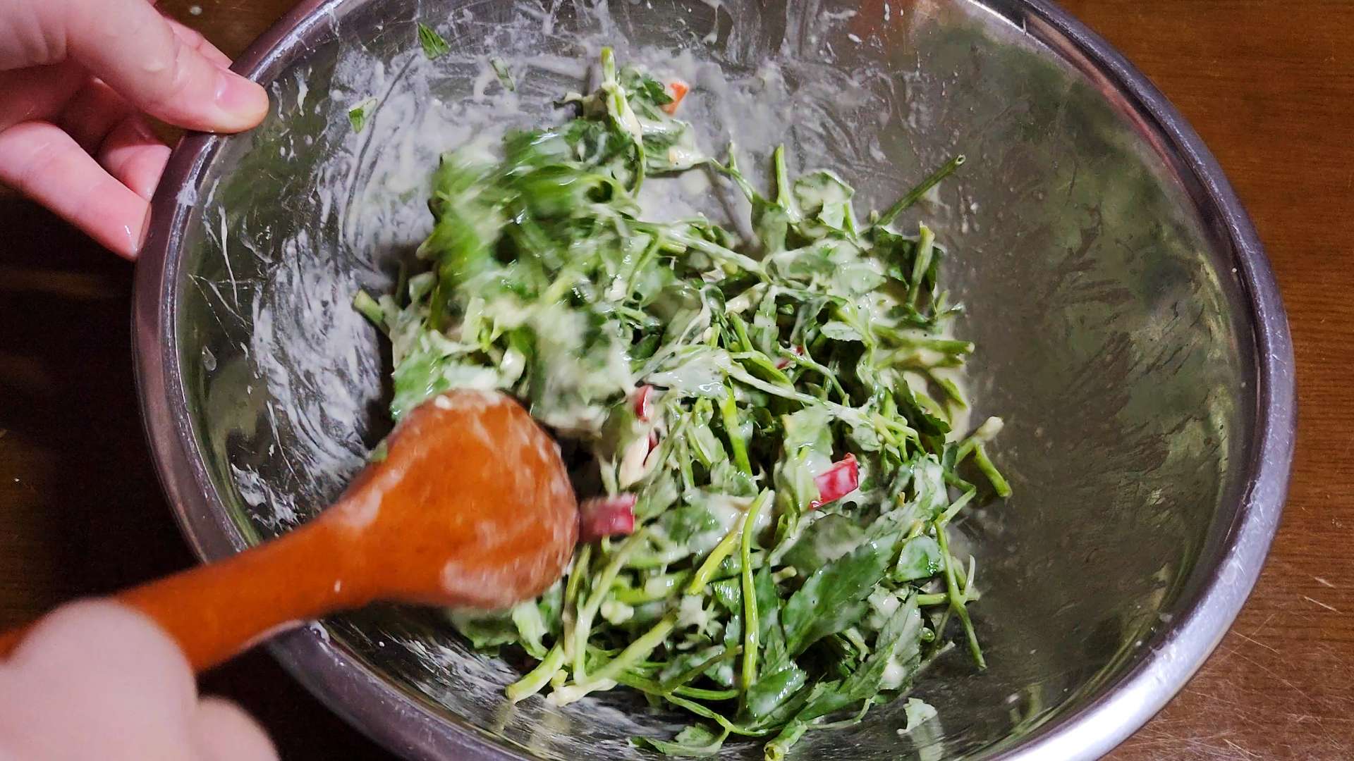 미나리, 부침가루 듬뿍 8T, 물 4T, 달걀 1개, 홍고추를 넣고 섞어줍니다.