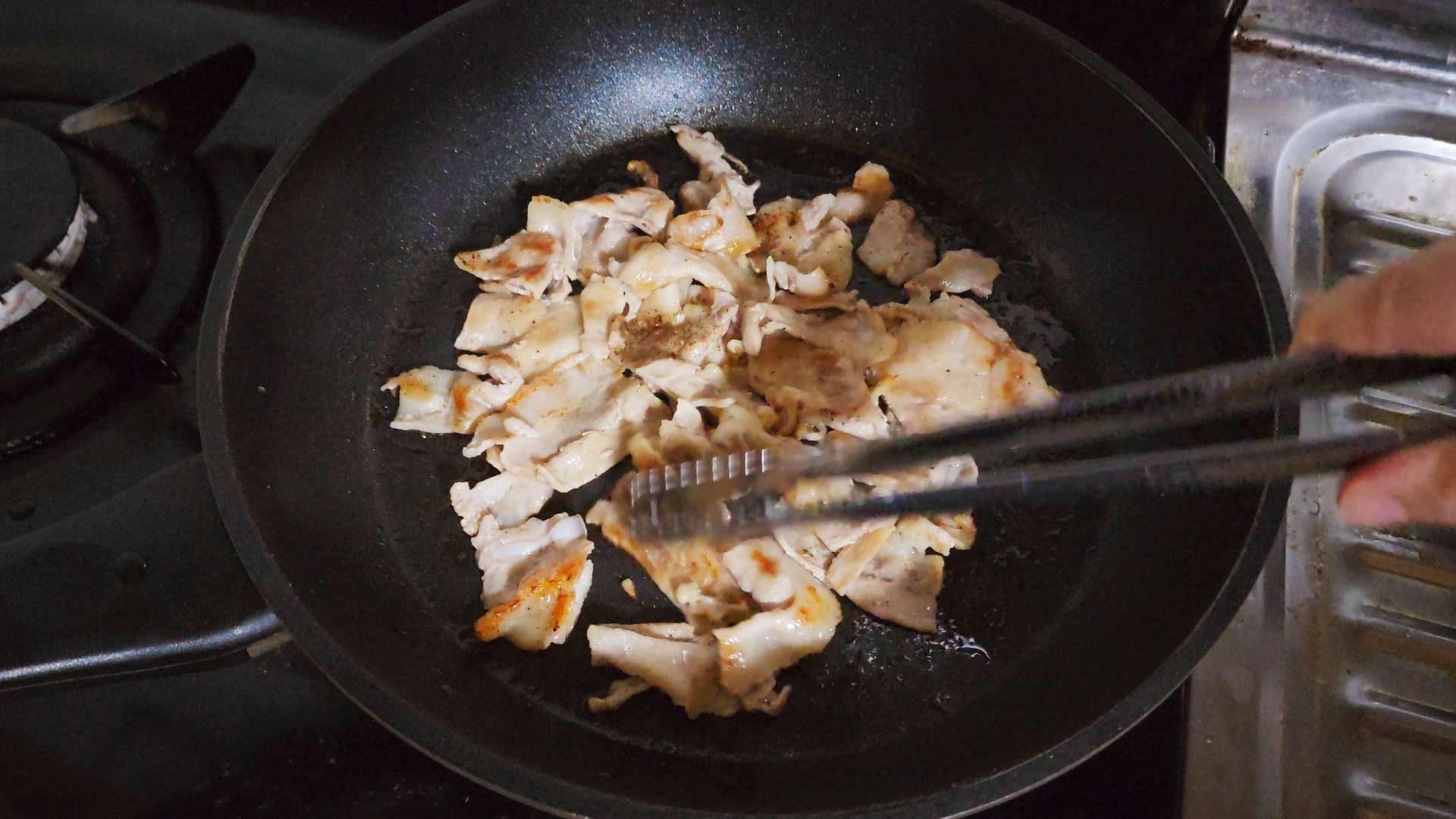 고기가 익으면 한 입 크기로 잘라주고 팬 가운데로 모아줍니다.