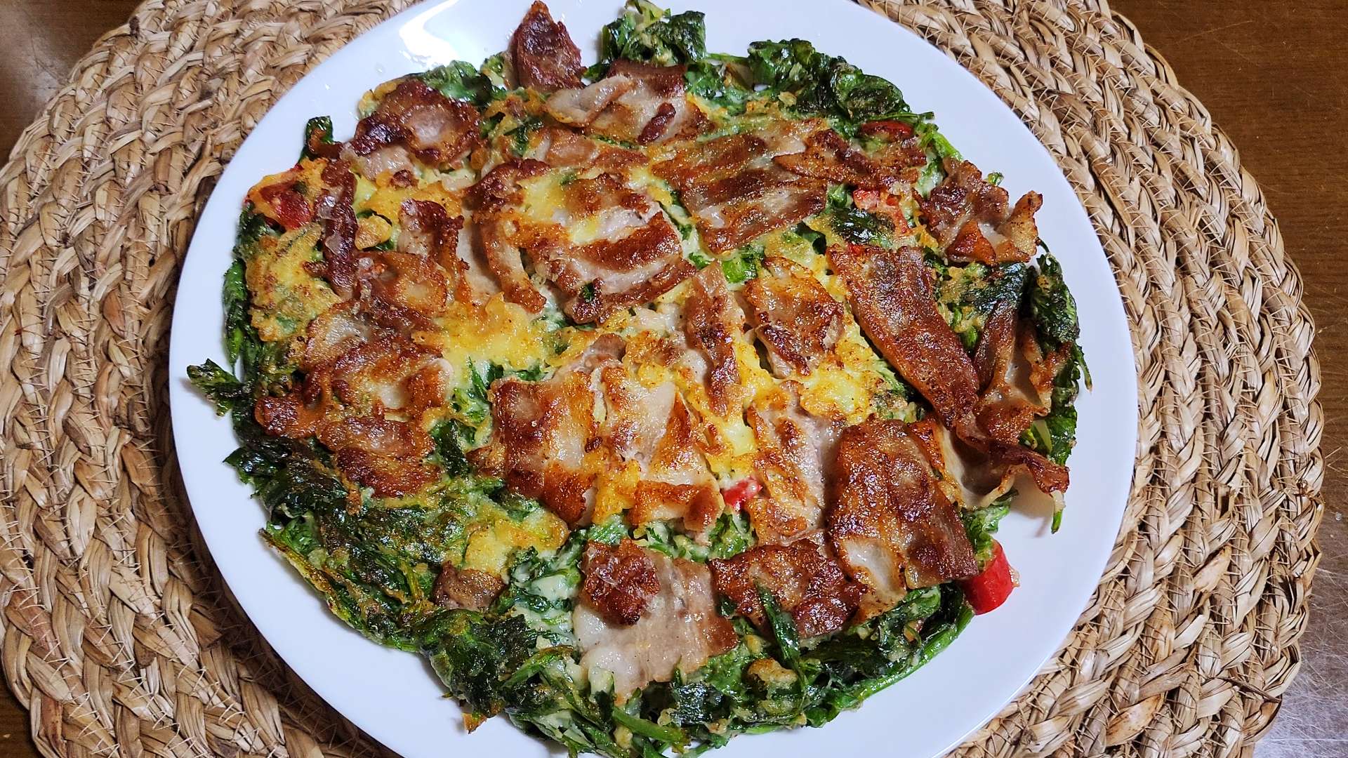 재료: 대패삼겹살 200g, 소금, 후추, 미나리 300g, 부침가루 듬뿍 8T, 물 4T, 달걀 1개, 홍고추 2개
