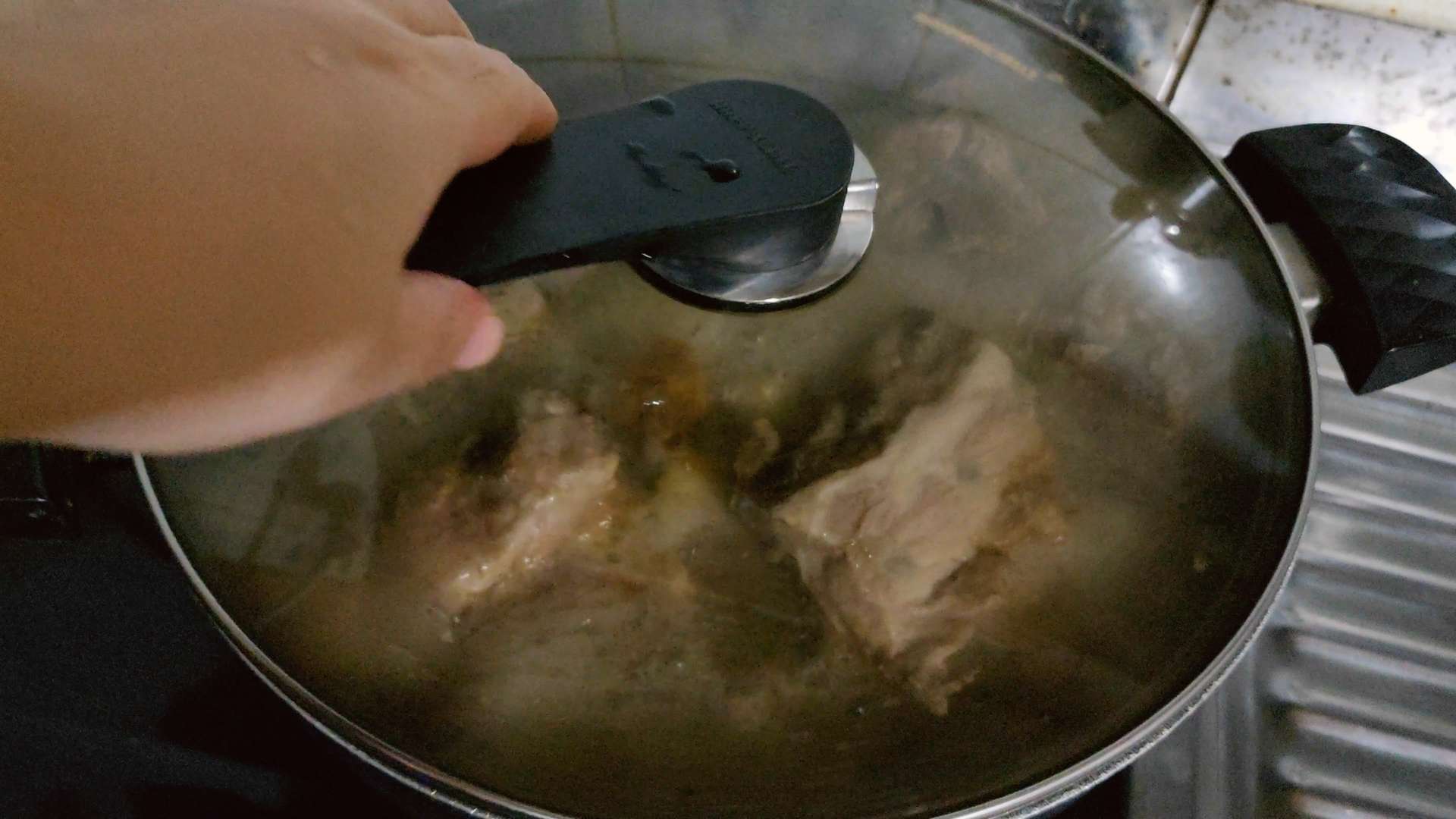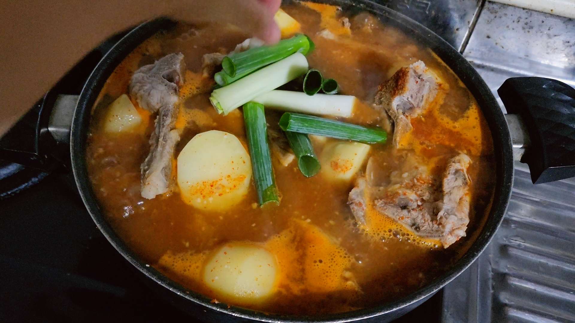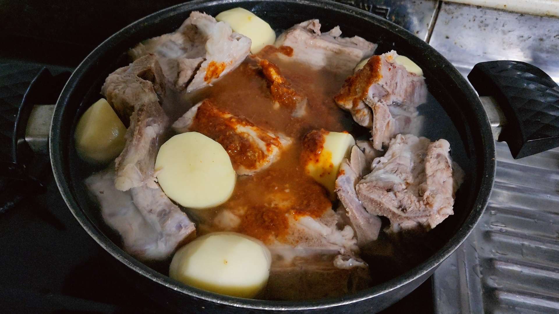 냄비에 등뼈, 물 1.5L, 감자, 양념장을 넣고 뚜껑을 덮고 강불에서 15분 정도 끓여줍니다.