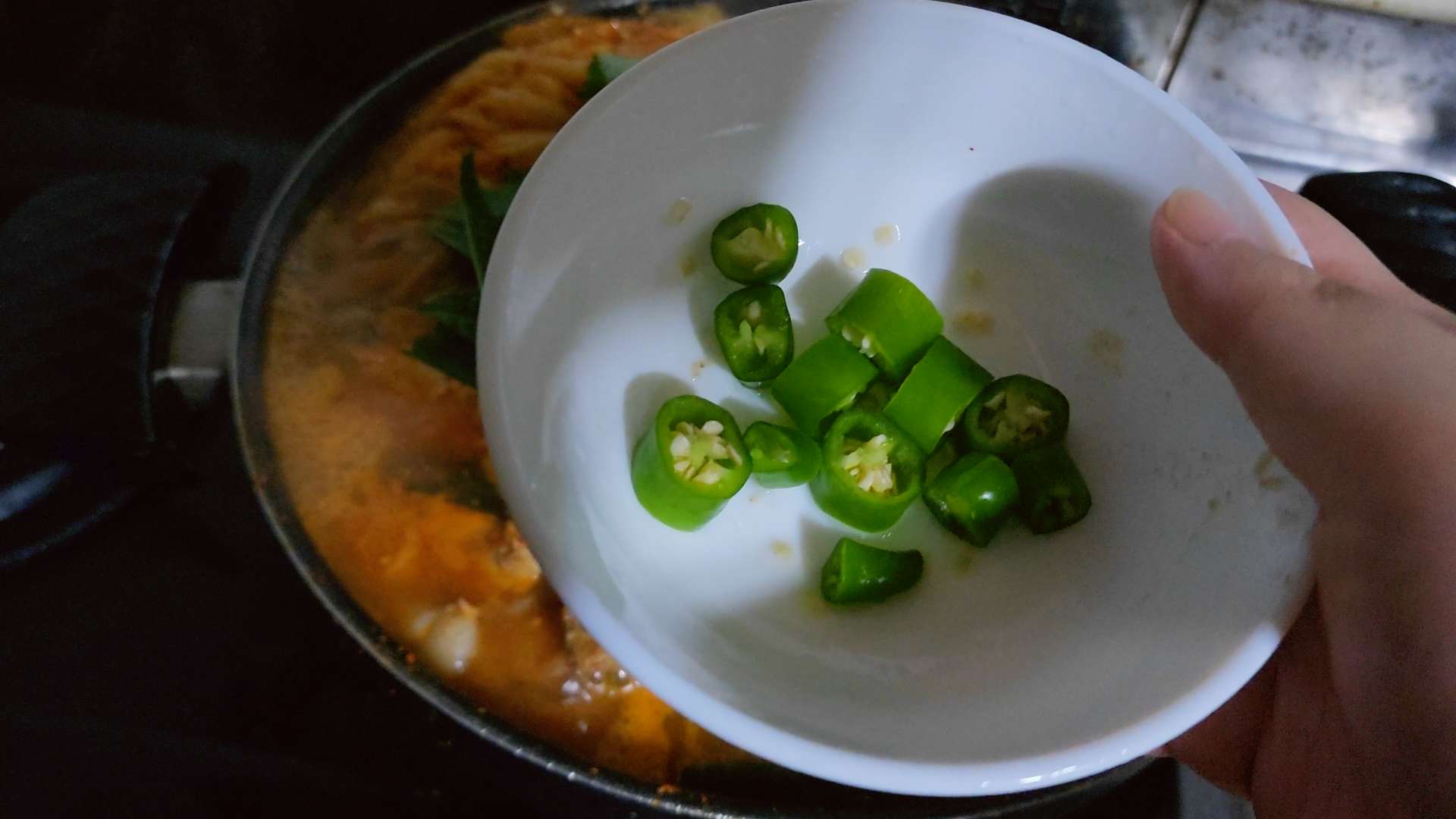깻잎, 청양고추를 넣고 2분 정도 끓여줍니다.