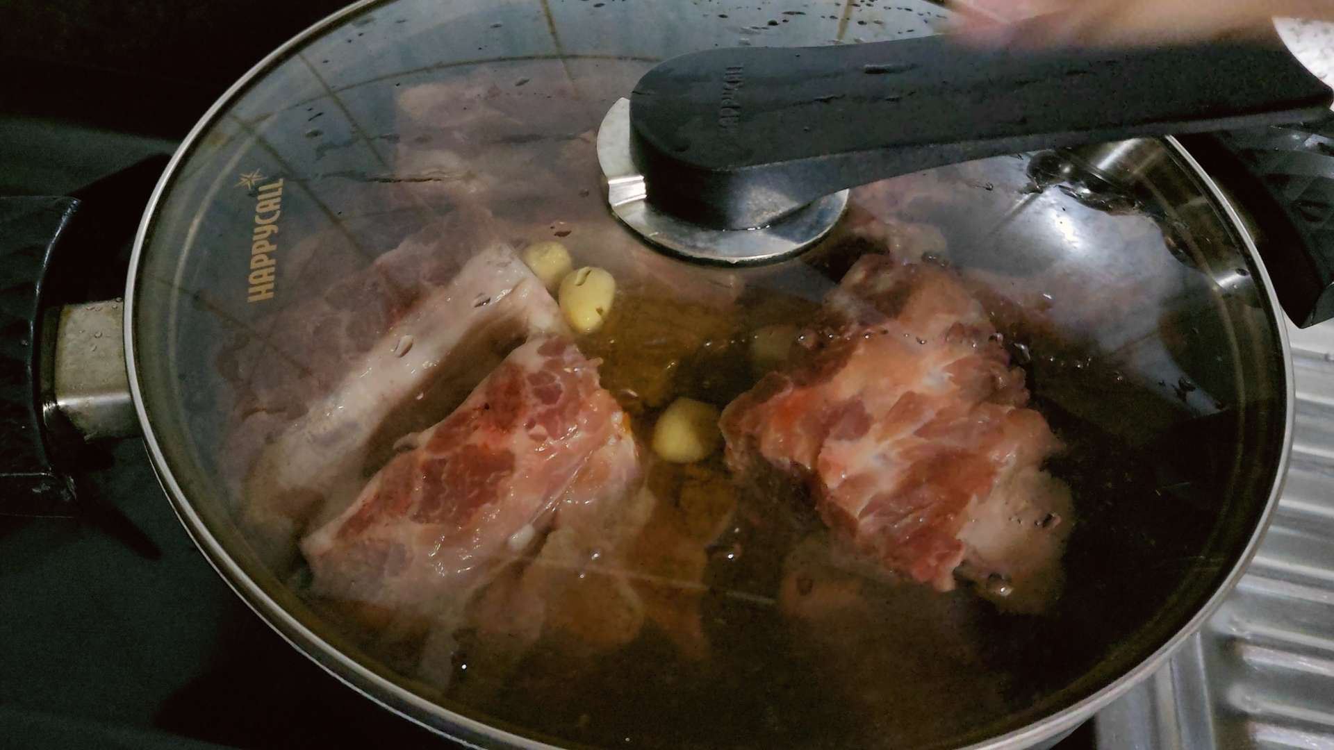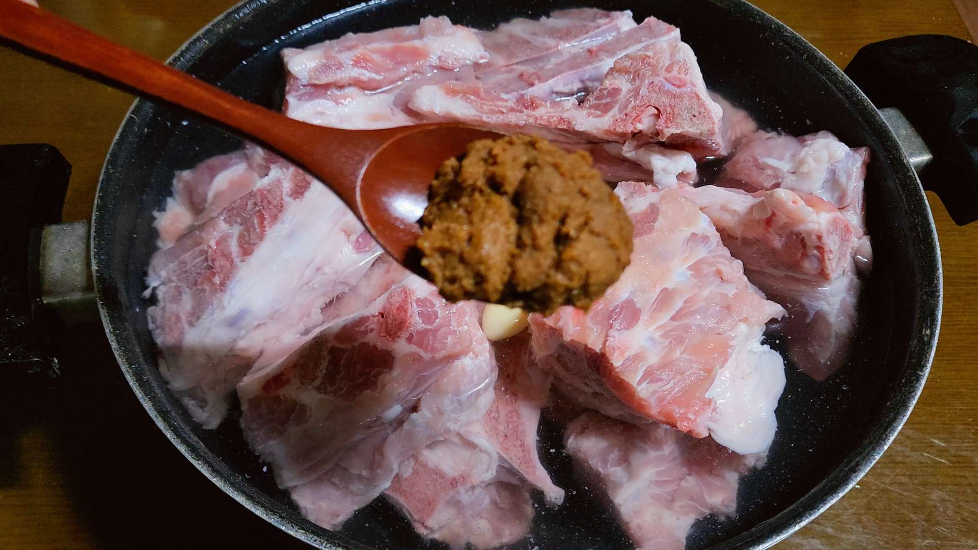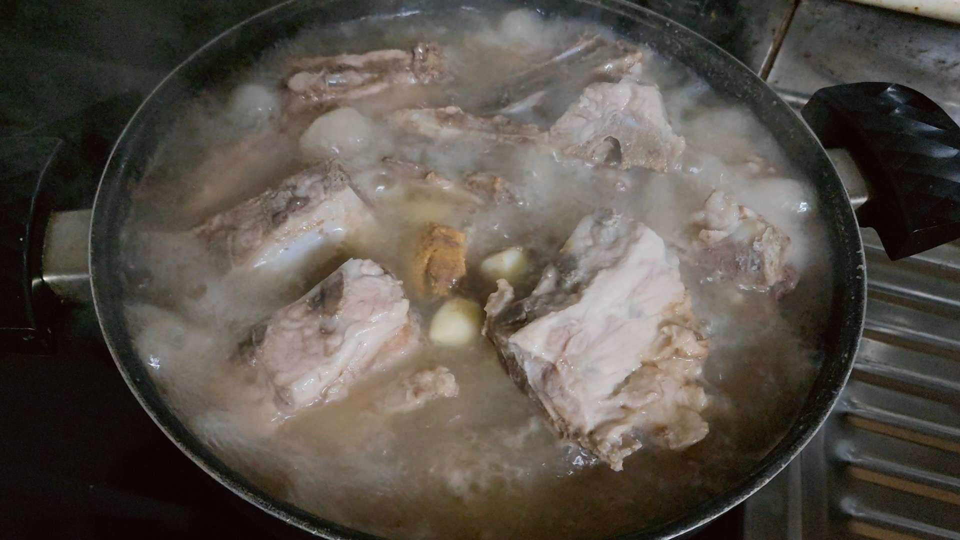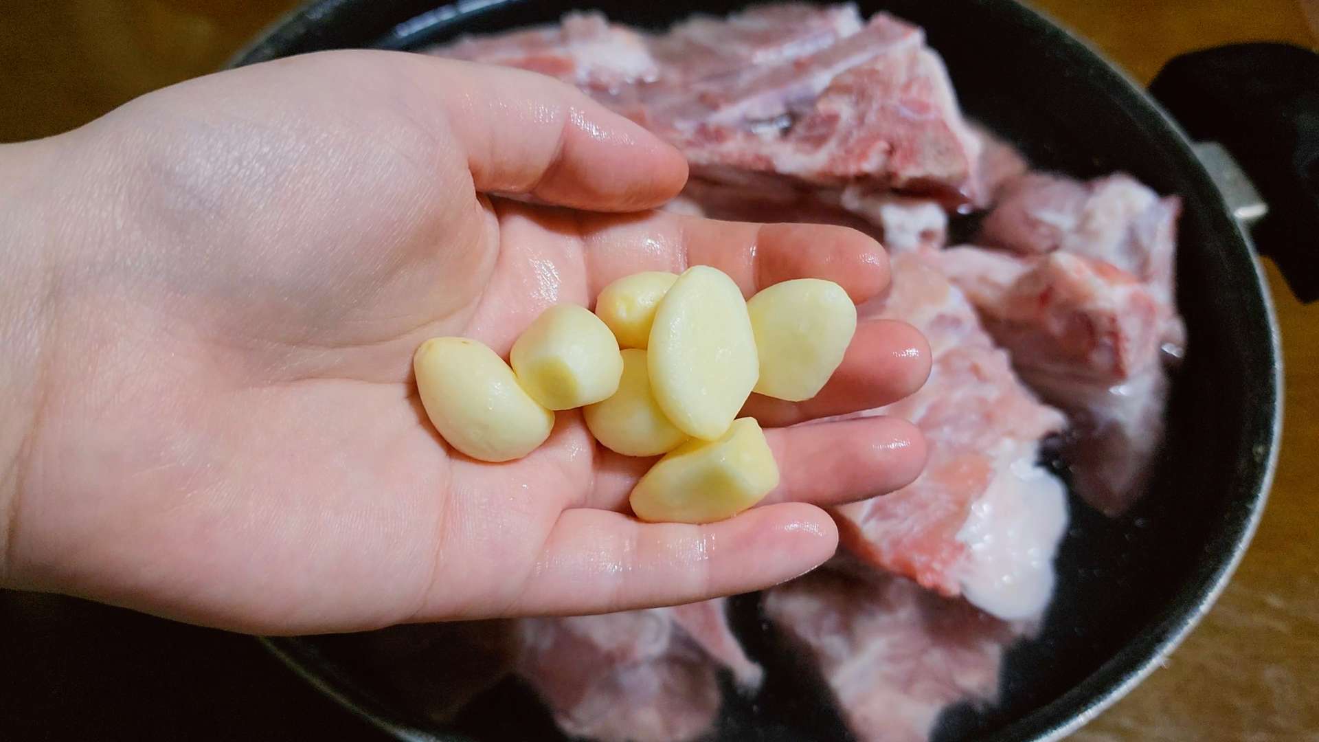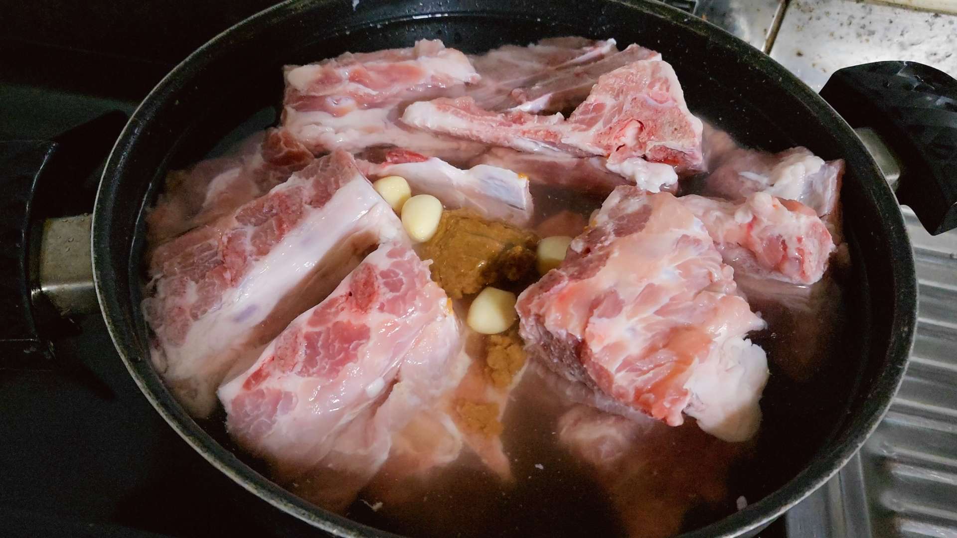 냄비에 등뼈가 반 정도 잠길 정도의 물을 넣고 통마늘 한 줌, 된장 1T를 넣어줍니다.