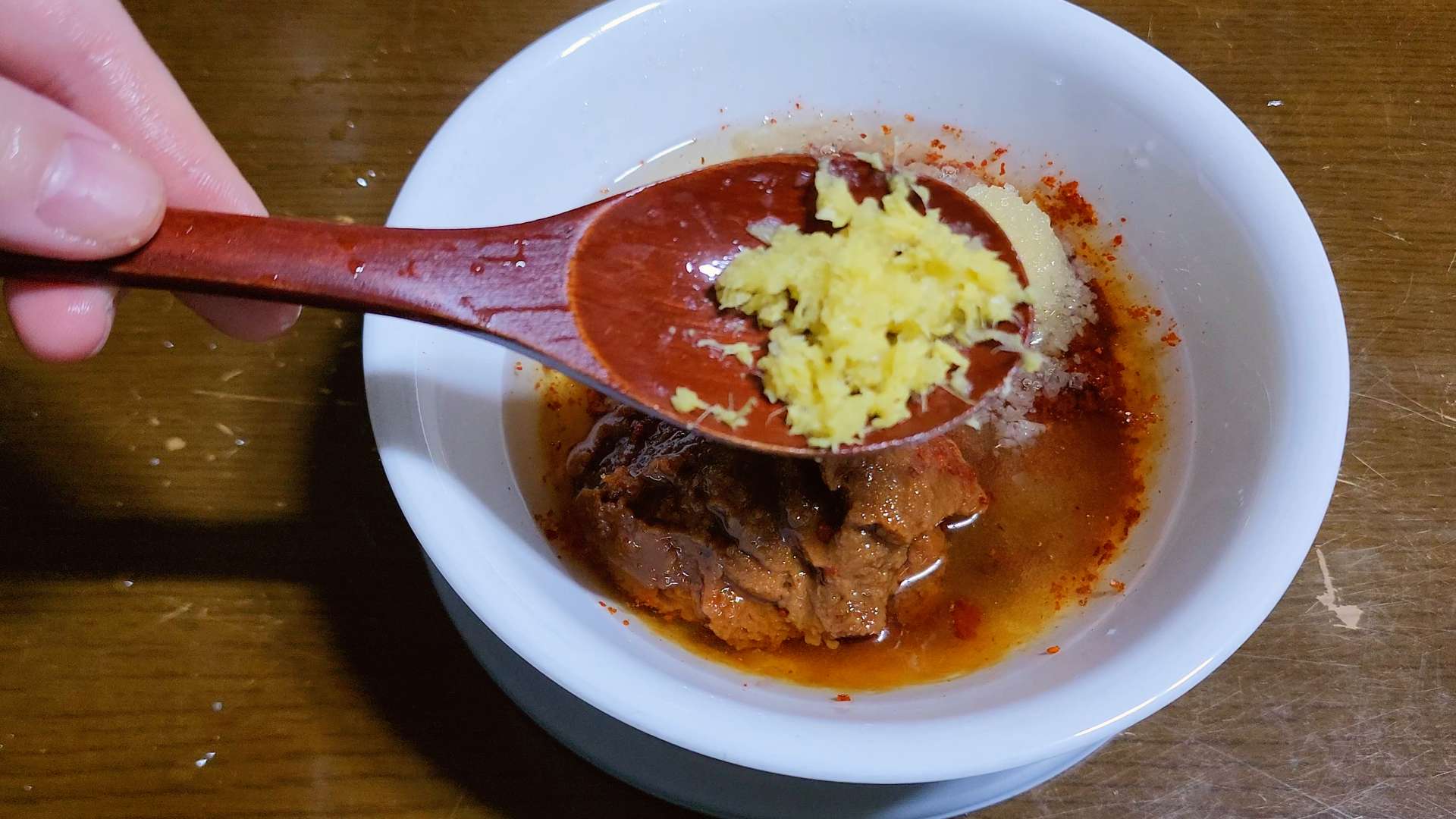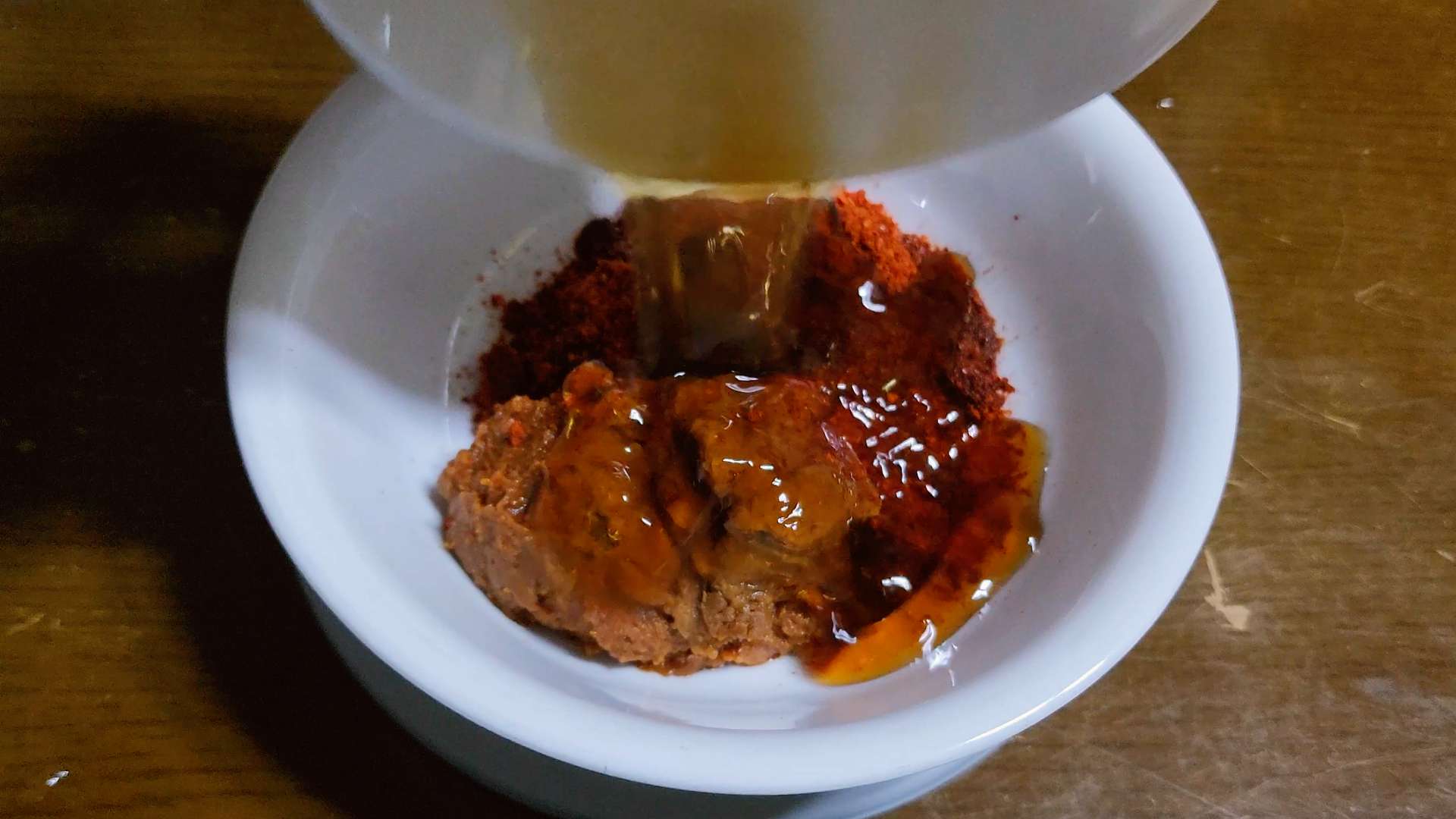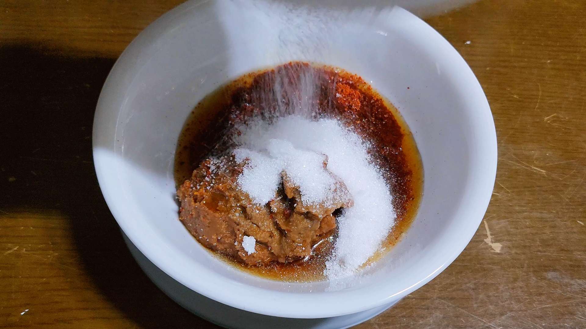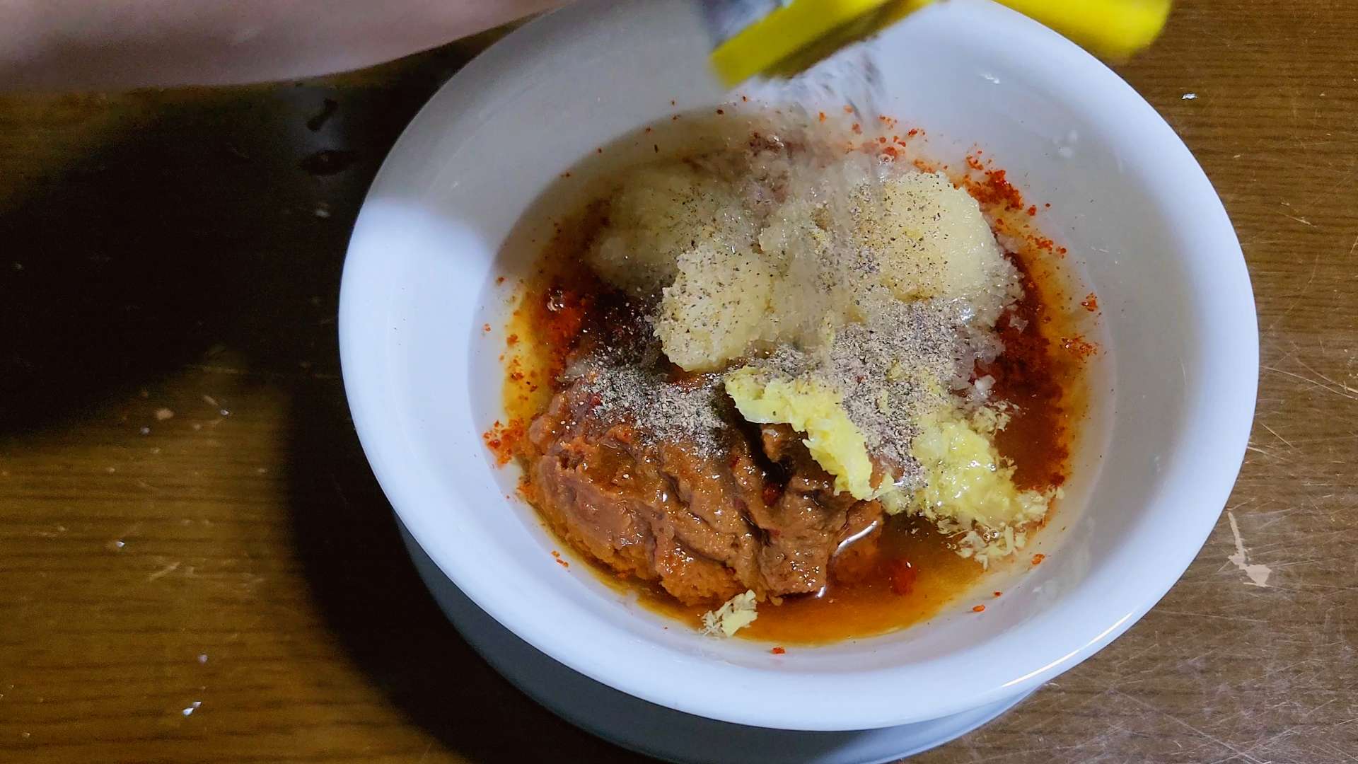된장 3T, 고춧가루 3T, 진간장 3T, 참치액젓 3T, 설탕 2T, 맛술 4T, 다진마늘 2T, 다진생강 1/2T, 후추를 섞어줍니다.