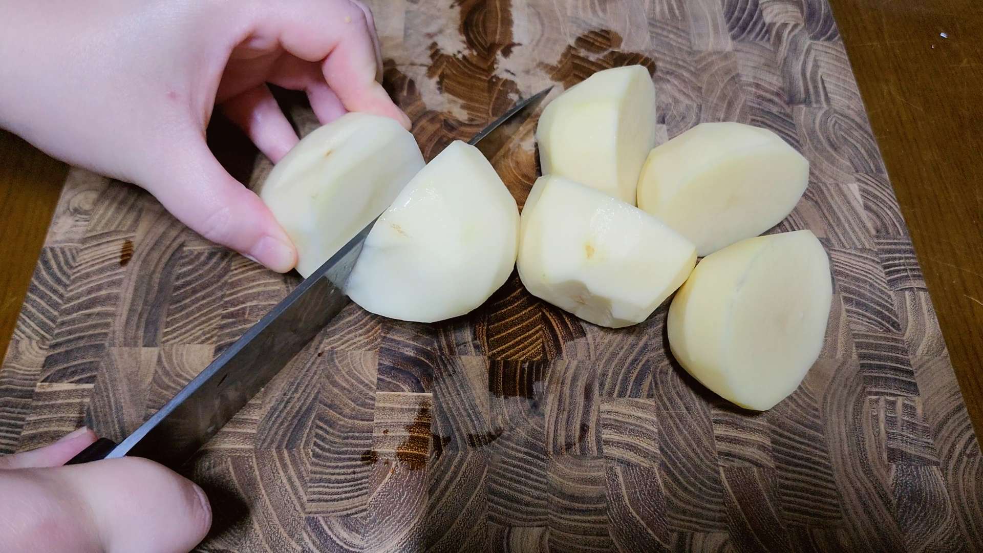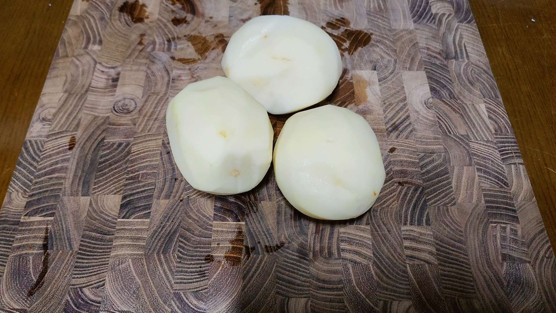 감자는 껍질을 벗기고 반으로 잘라줍니다.