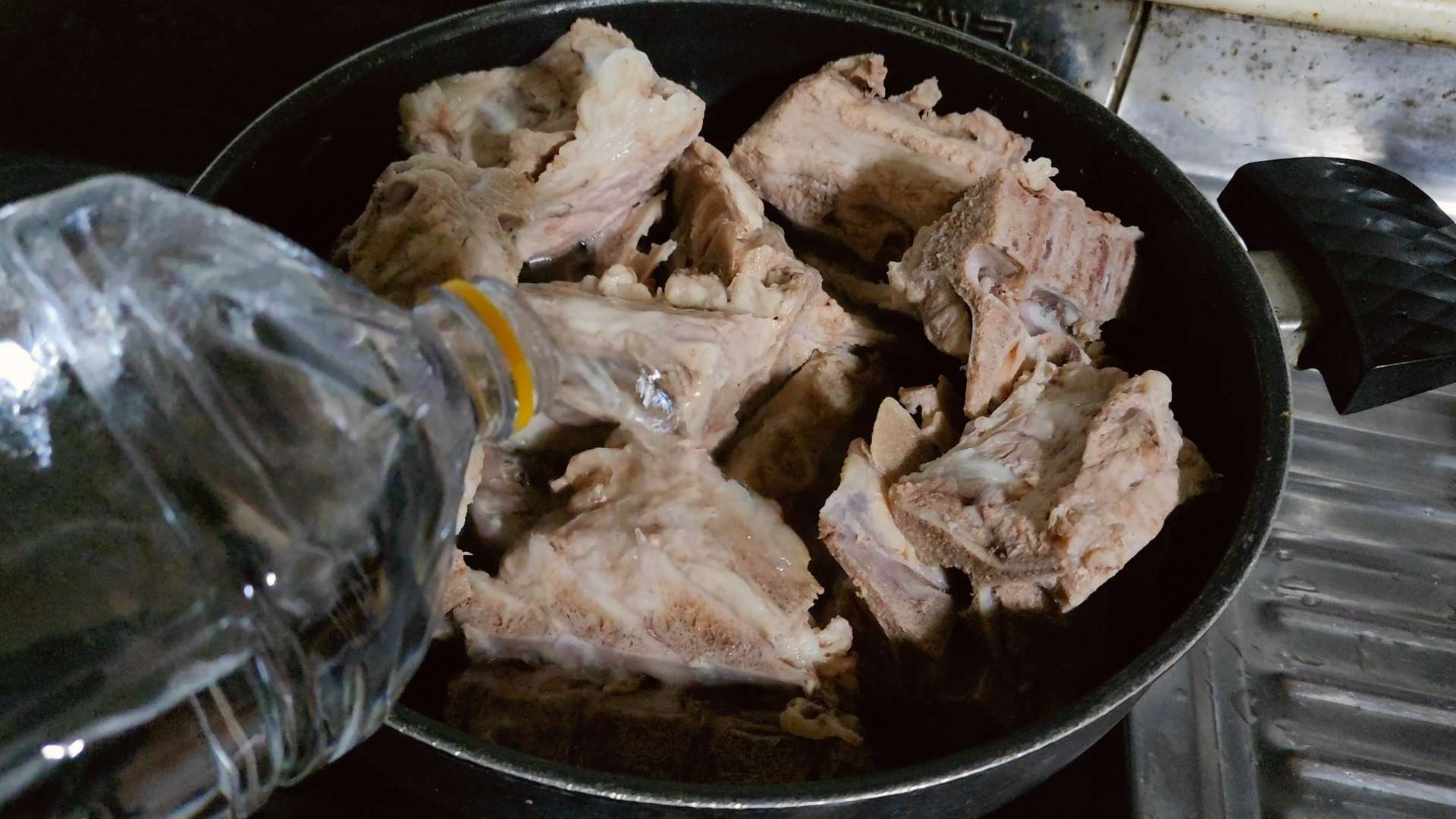 등뼈 삶은 물은 버리고 등뼈는 물에 헹궈줍니다.