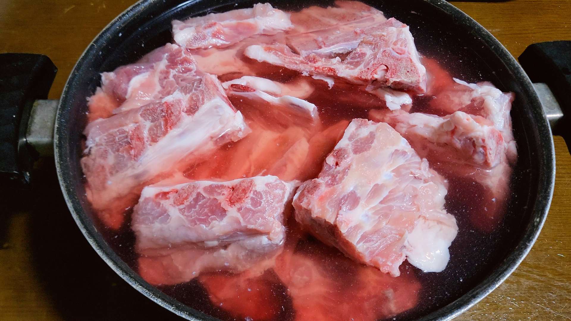 등뼈 핏물 제거: 돼지등뼈 1.2kg, 막걸리 1병,