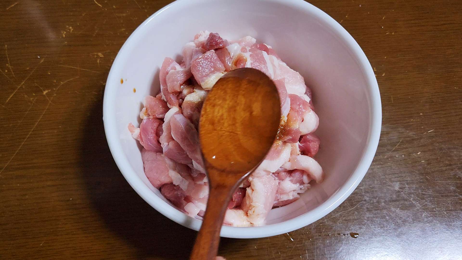 삼겹살에 간장 2T, 설탕 1/2T, 맛술 1T, 다진마늘 1T, 후추 넣고 버무려 밑간해 줍니다.