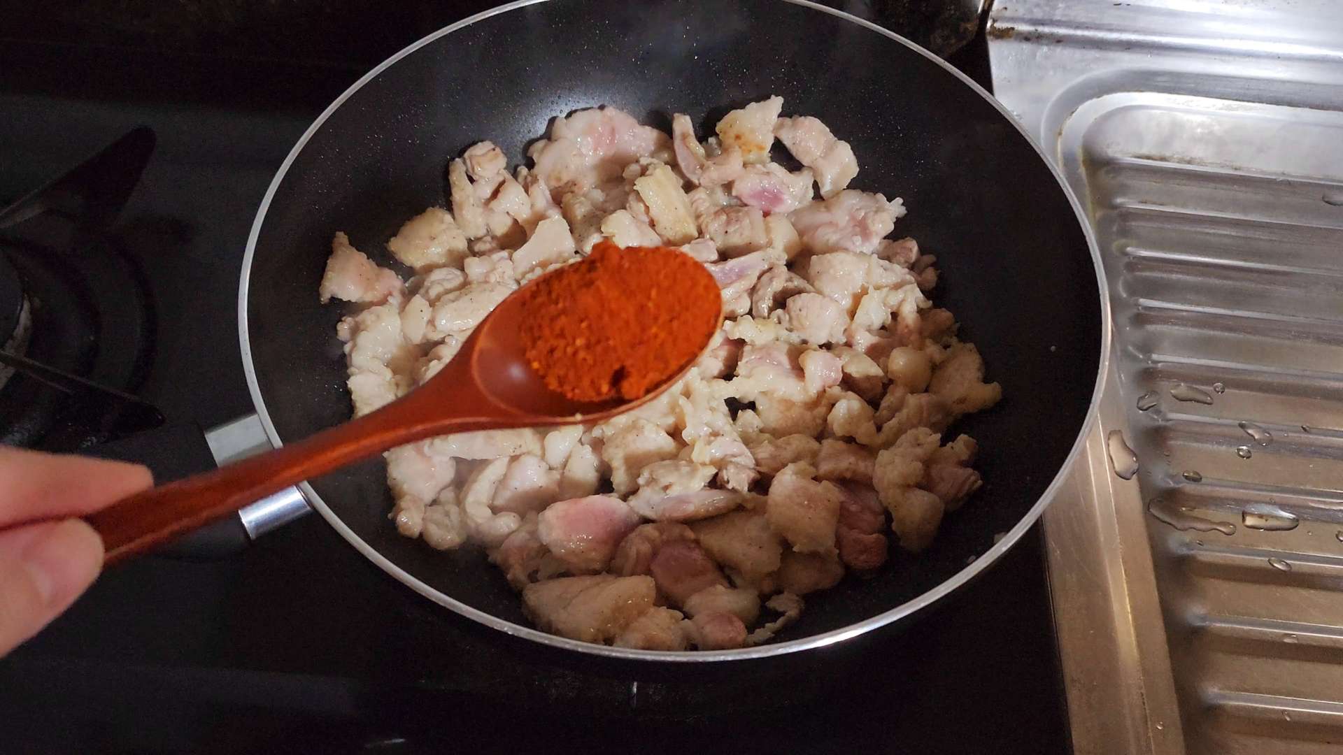강불로 달군팬에 식용유, 삼겹살 넣고 볶으면서 익혀줍니다.
