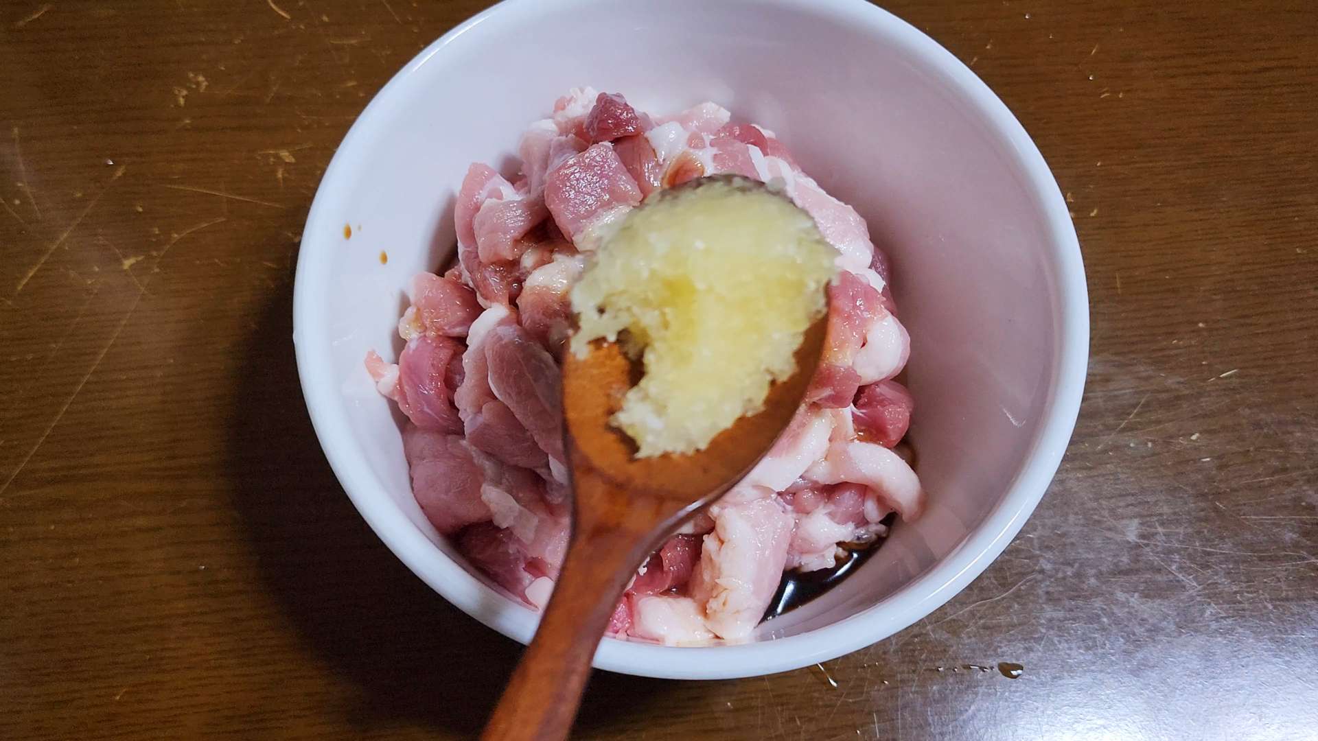 삼겹살에 간장 2T, 설탕 1/2T, 맛술 1T, 다진마늘 1T, 후추 넣고 버무려 밑간해 줍니다.