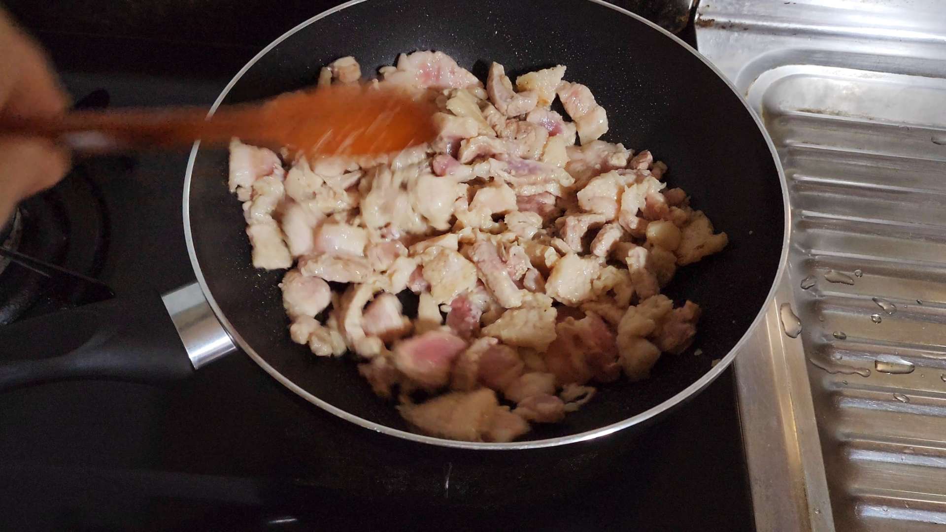 강불로 달군팬에 식용유, 삼겹살 넣고 볶으면서 익혀줍니다.