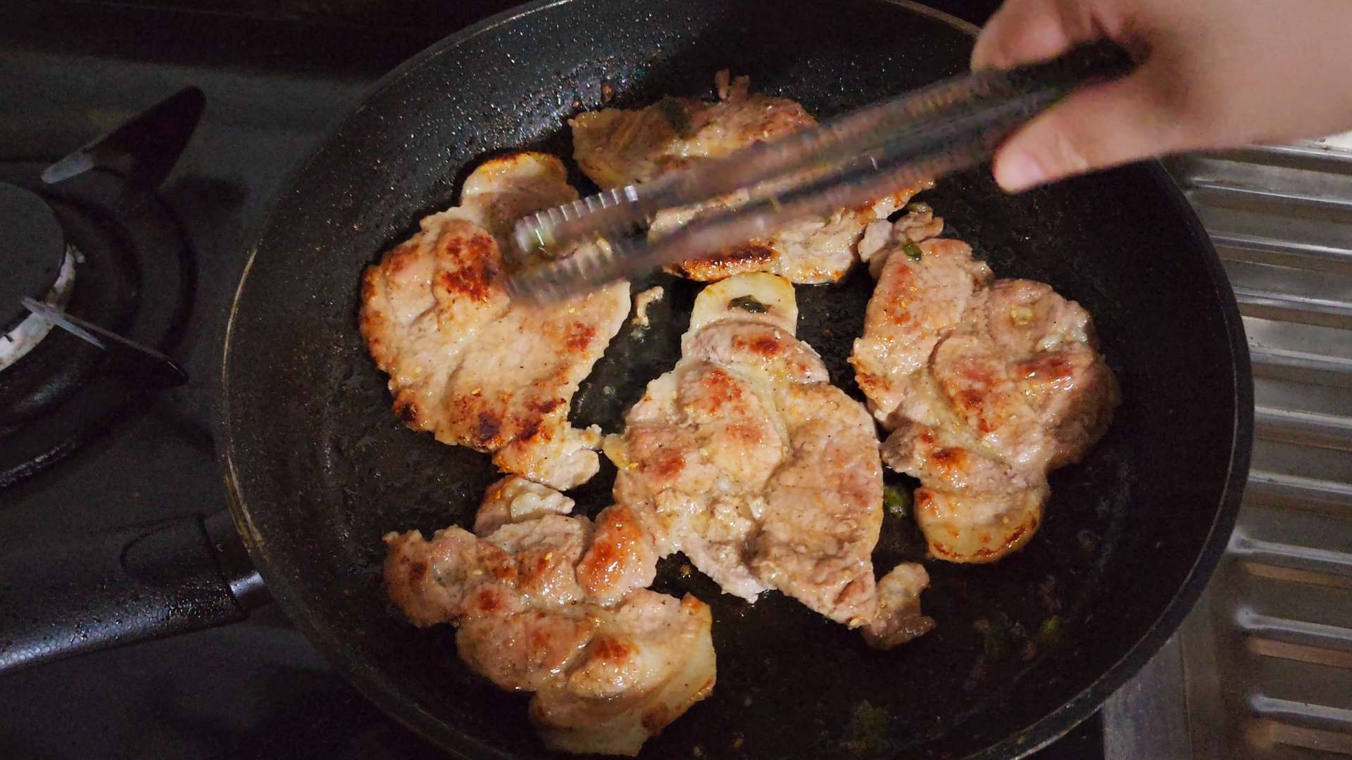 수분이 날아가고 기름이 지글거리기 시작하면 뒤집어 줍니다.